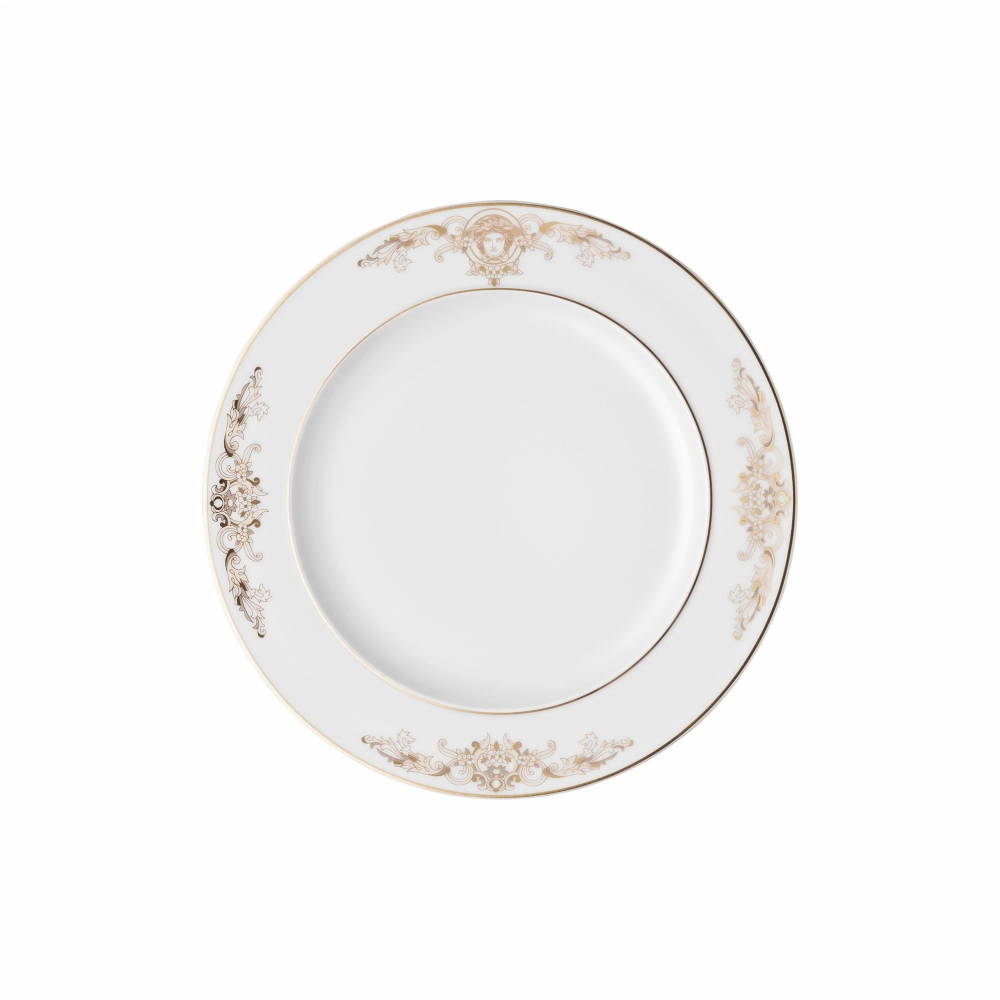 A flat plate with a diameter of 22 cm, belonging to the Medusa Gala collection, made of very fine decorated porcelain. Featuring exquisite gold decorations, the Medusa Gala plate would make a beautiful addition to any table and is perfect for serving a meal on special occasions. Made by Versace Rosenthal.