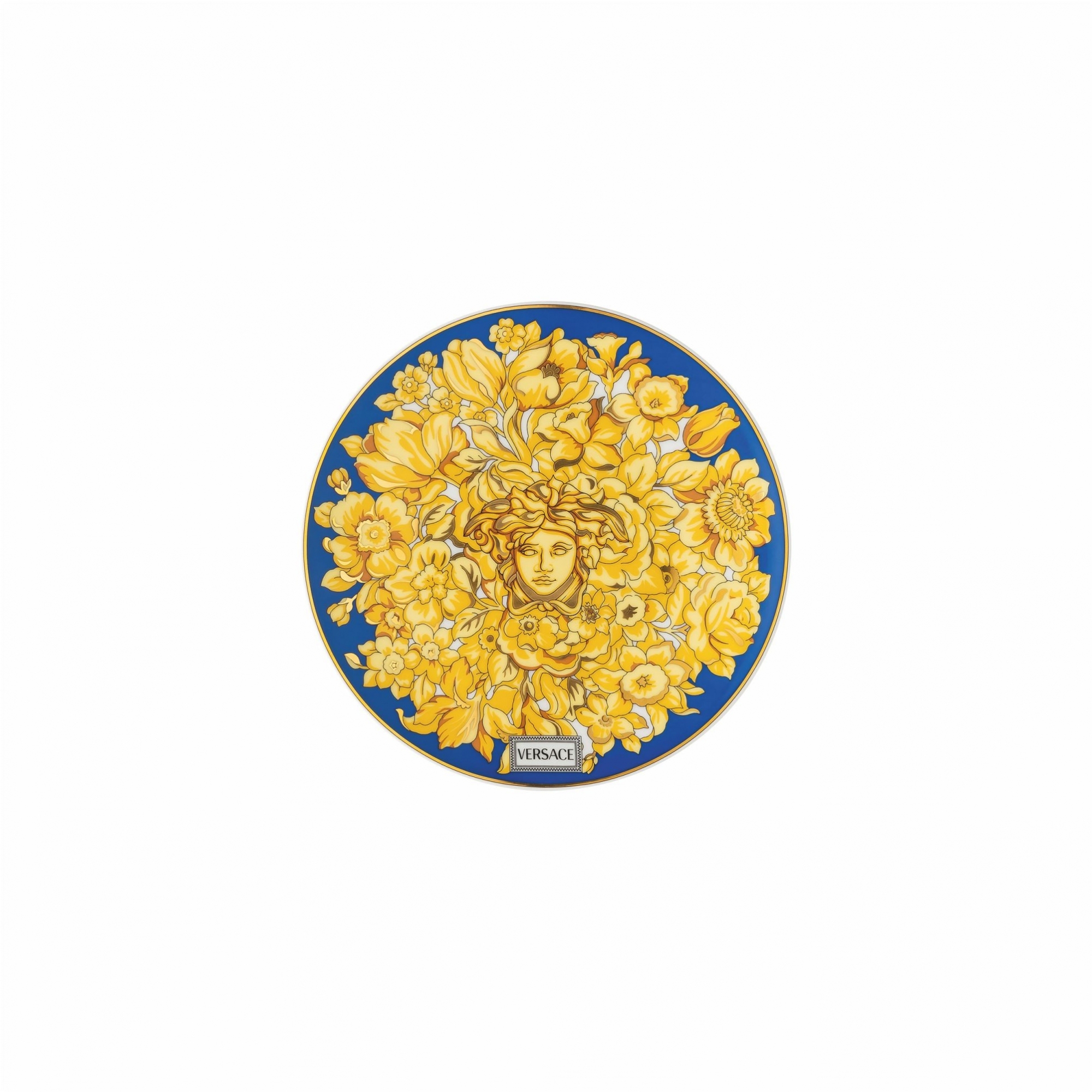 Dinner plate with a diameter of 17 cm, belonging to the Medusa Rhapsody collection, made of very fine decorated porcelain. Available in 3 precious color finishes, the Medusa Rhapsody dinner plate is perfect both as an elegant table setting and as a refined piece of furniture. It features an elegant golden central Medusa motif surrounded by a Baroque flower arrangement, and is further enhanced by the Versace label. Made by Versace Rosenthal.