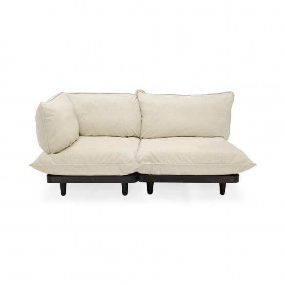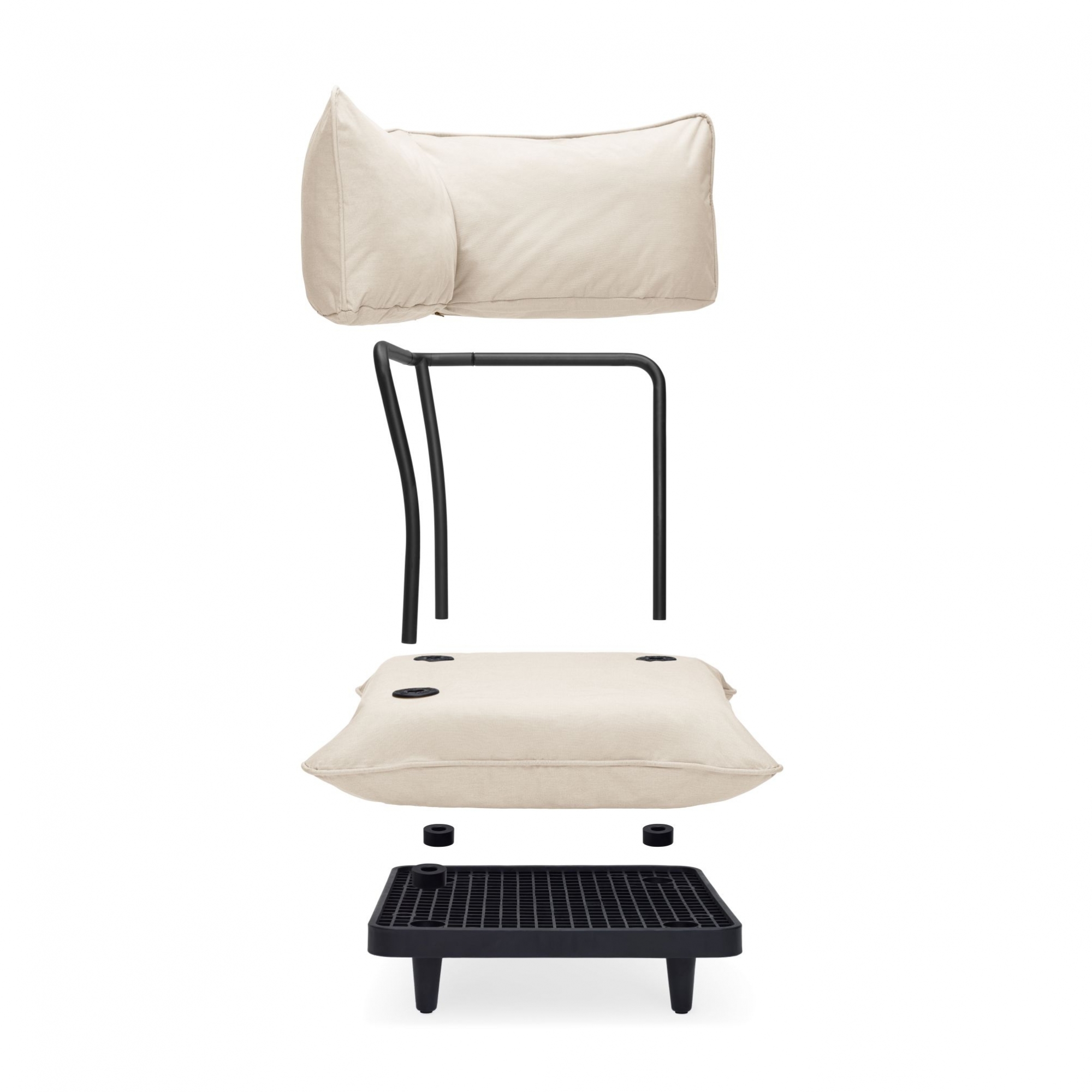 Paletti small sofa composition, made up of pallets in recycled PP TPE materials, steel backrests and cushion padded with foam and covered with Sunbrella® fabric, available in 5 colors. Relax, drink, place objects, lie down: everything is possible with the Paletti sofa! Very resistant both as regards the pallet and the cushions, resistant to UV rays and waterproof, Paletti is designed to "live" outside! Made by Fatboy.