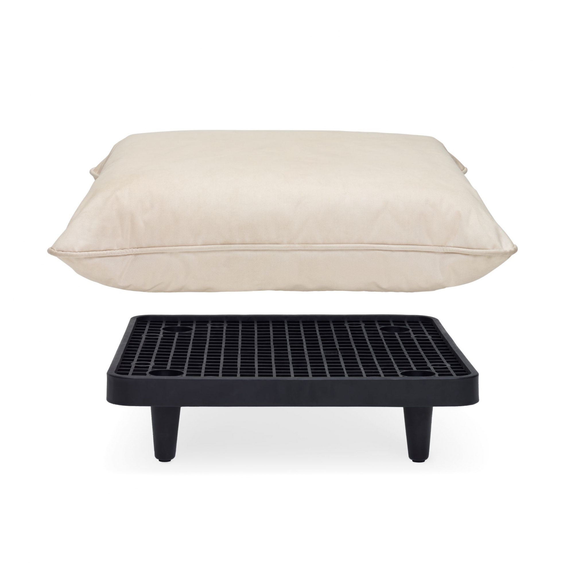 Paletti medium sofa composition, made up of pallets in recycled PP TPE materials, steel backrests and cushion padded with foam and covered with Sunbrella® fabric, available in 5 colors. Relax, drink, place objects, lie down: everything is possible with the Paletti sofa! Very resistant both as regards the pallet and the cushions, resistant to UV rays and waterproof, Paletti is designed to "live" outside! Made by Fatboy.