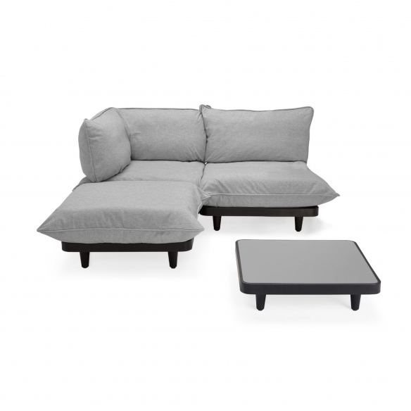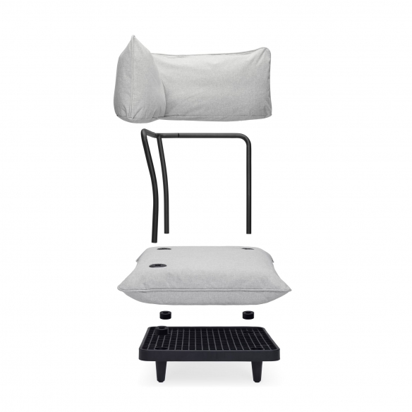 Paletti medium sofa composition including table, made of pallets in recycled PP TPE materials, steel backrests and cushion padded with foam and covered with Sunbrella® fabric, available in 5 colors. Relax, drink, place objects, lie down: everything is possible with the Paletti sofa! Very resistant both as regards the pallet and the cushions, resistant to UV rays and waterproof, Paletti is designed to "live" outside! Made by Fatboy.
