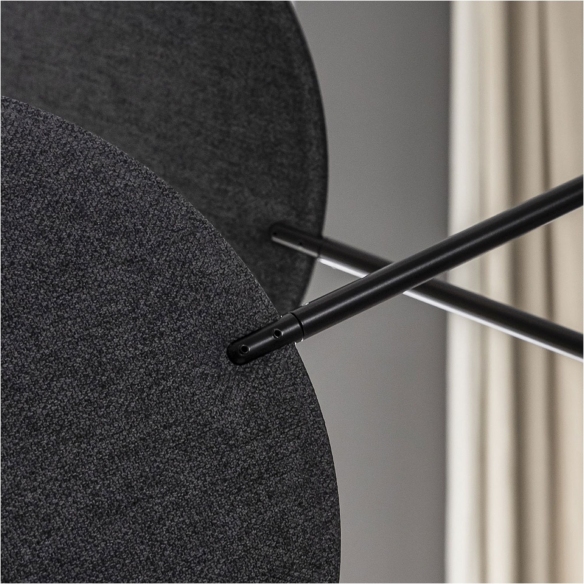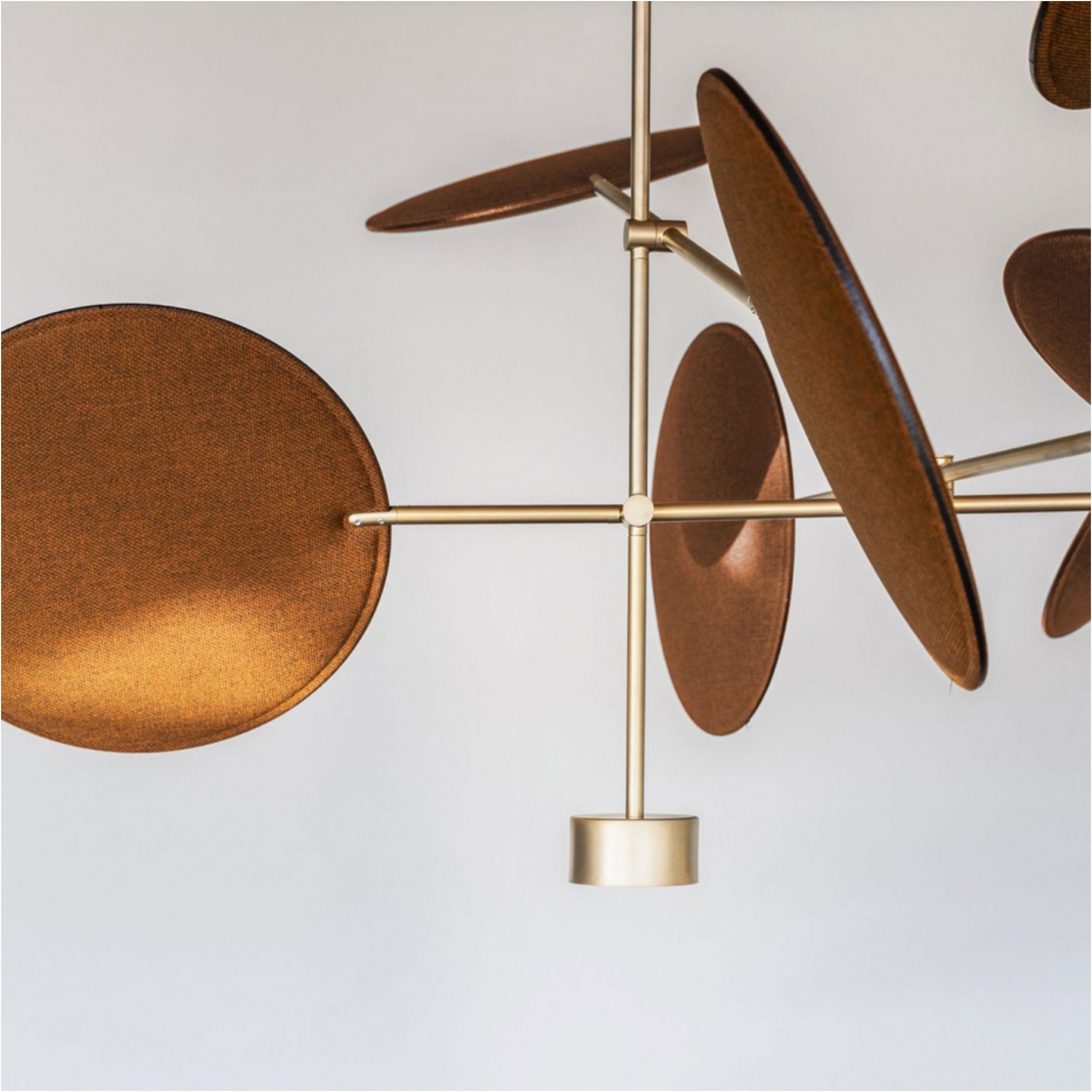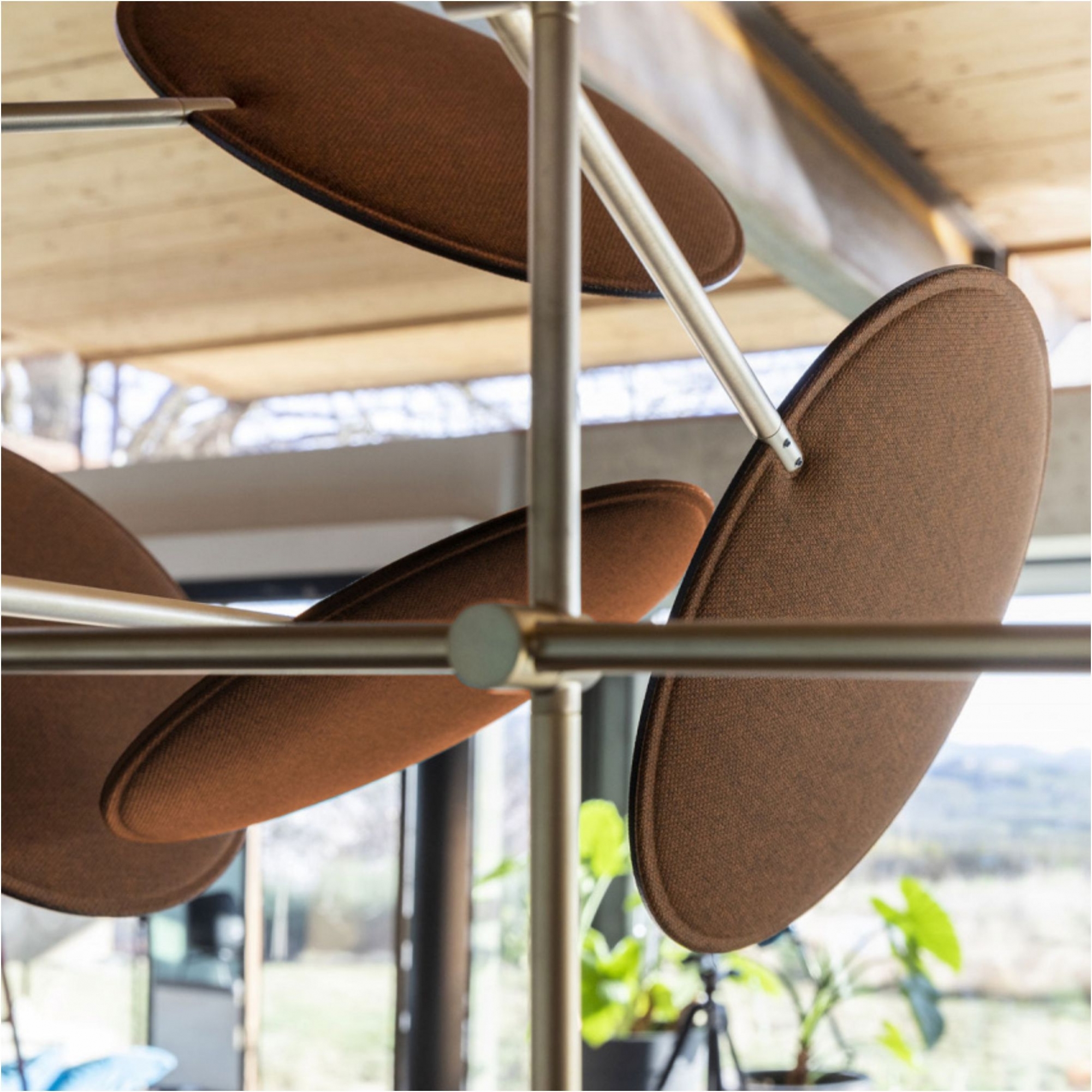 Ceiling lamp belonging to the Diva collection, made with metal structure and adjustable discs covered in fabric with sound-absorbing properties. Available in 2 finishes as regards the structure and in 6 finishes as regards the discs, the Diva ceiling lamp has a strong personality, proposing itself as the protagonist of the dining room. The arms can be adjusted as desired. Designed by Sebastiano Tosi for Mogg.
