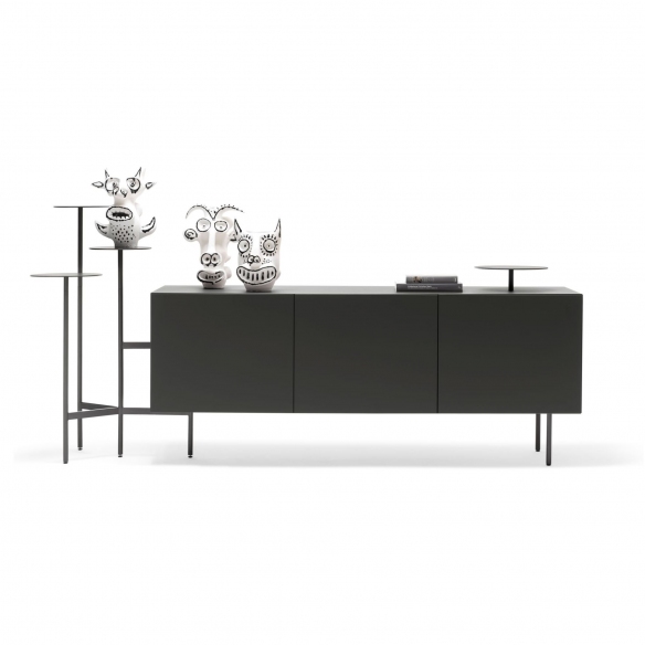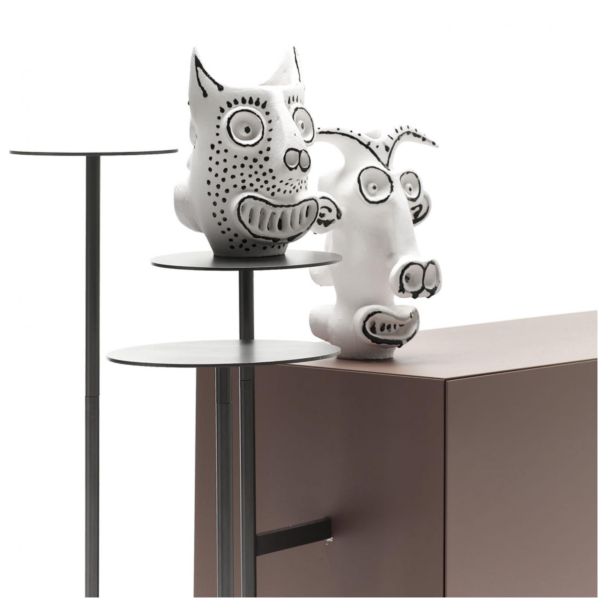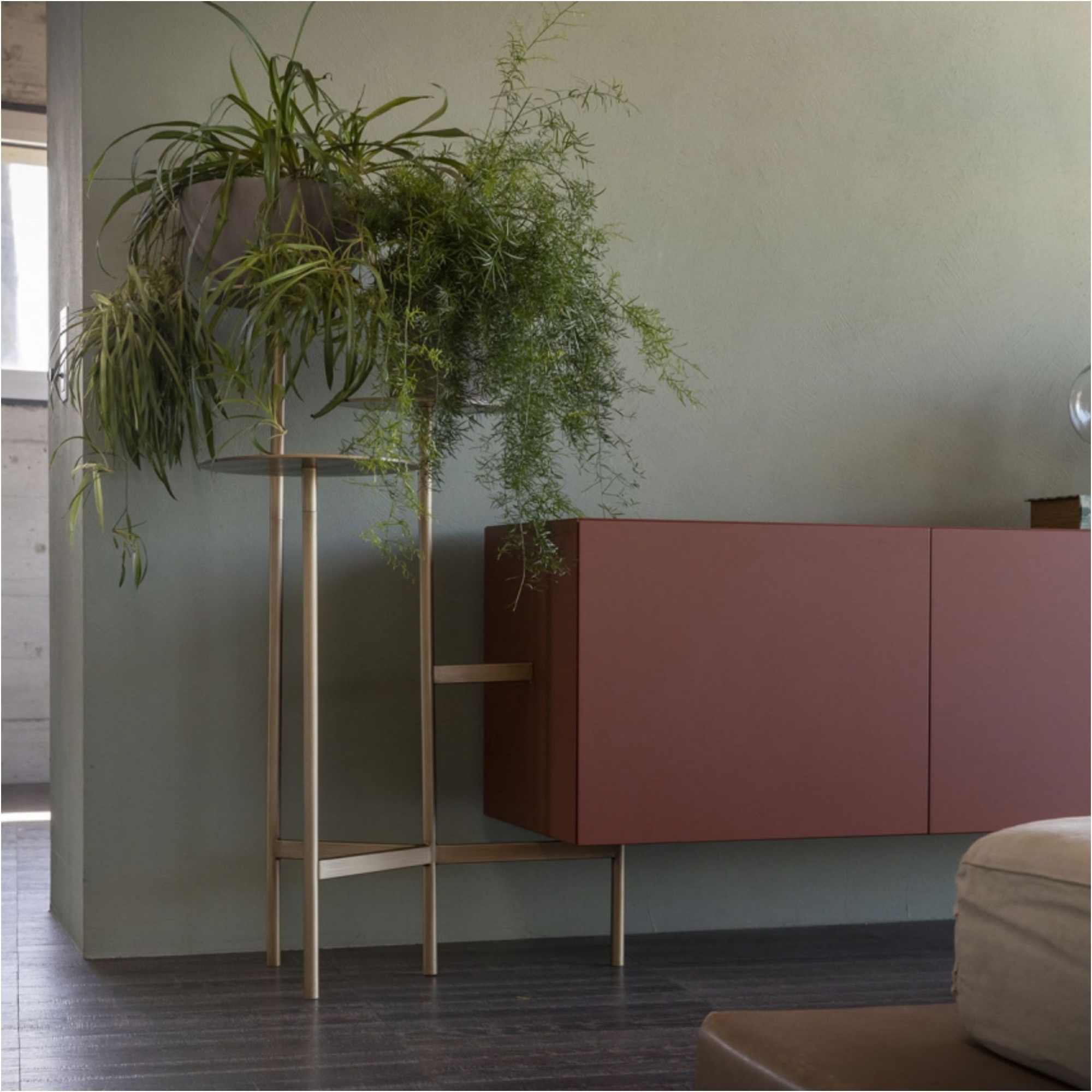 Ikebana cupboard made with MDF structure and metal frame, 3 internal glass shelves. Available in 2 finishes as regards the frame and in 25 finishes as regards the container, the Ikebana cupboard is proposed as an elegant and contemporary piece of furniture, proposing a new way of displaying objects, vases and sculptures. Thanks to the structure with metal supports, you can create a real home garden, placing the plants and creating fantastic compositions. The frame includes 3 shelves with a diameter of 32, 25 and 28 cm. Designed by Uto Balmoral for Mogg.