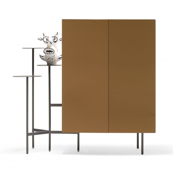Ikebana sideboard made with MDF structure and metal frame, 3 internal glass shelves. Available in 2 finishes as regards the frame and in 25 finishes as regards the container, the Ikebana sideboard is proposed as an elegant and contemporary piece of furniture, proposing a new way of displaying objects, vases and sculptures. Thanks to the structure with metal supports, you can create a real home garden, placing the plants and creating fantastic compositions. The frame includes 4 shelves with a diameter of 32, 25 and 28 cm. Designed by Uto Balmoral for Mogg.