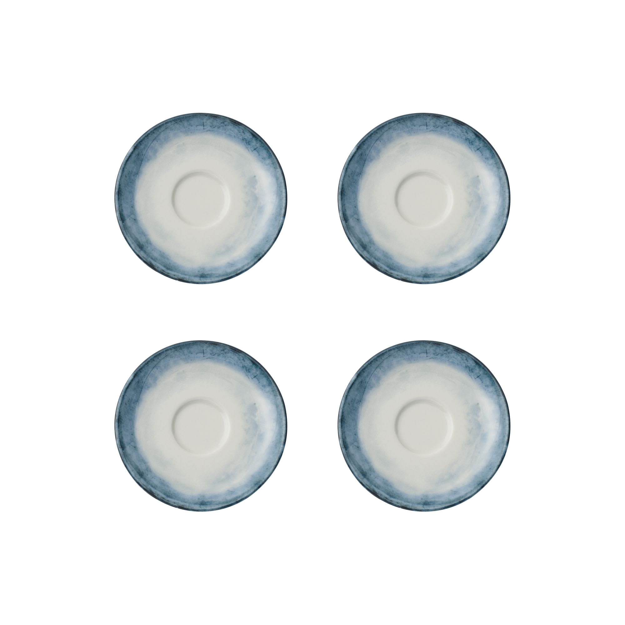 Set of 4 coffee saucers with a diameter of 12 cm, belonging to the Shade Sea collection, made of fine decorated porcelain. Each saucer is characterized by trendy shades, the blue of the edge creates a fantastic contrast with the white, generating a pleasant optical effect, deliberately imprecise. Perfect for outdoor or casual-chic locations, Shade Sea saucers offer your table style, quality and timeless elegance. These saucers are dishwasher safe. Made by Arthur Krupp.
