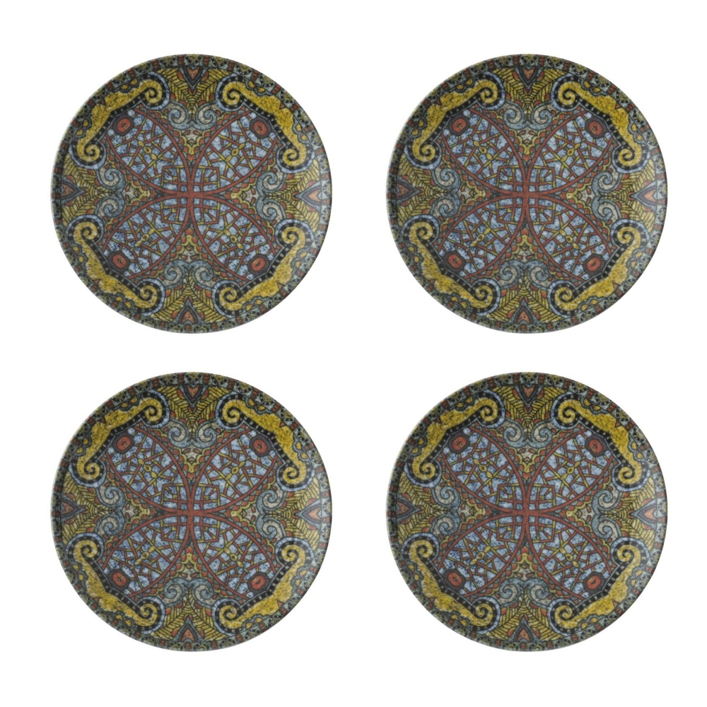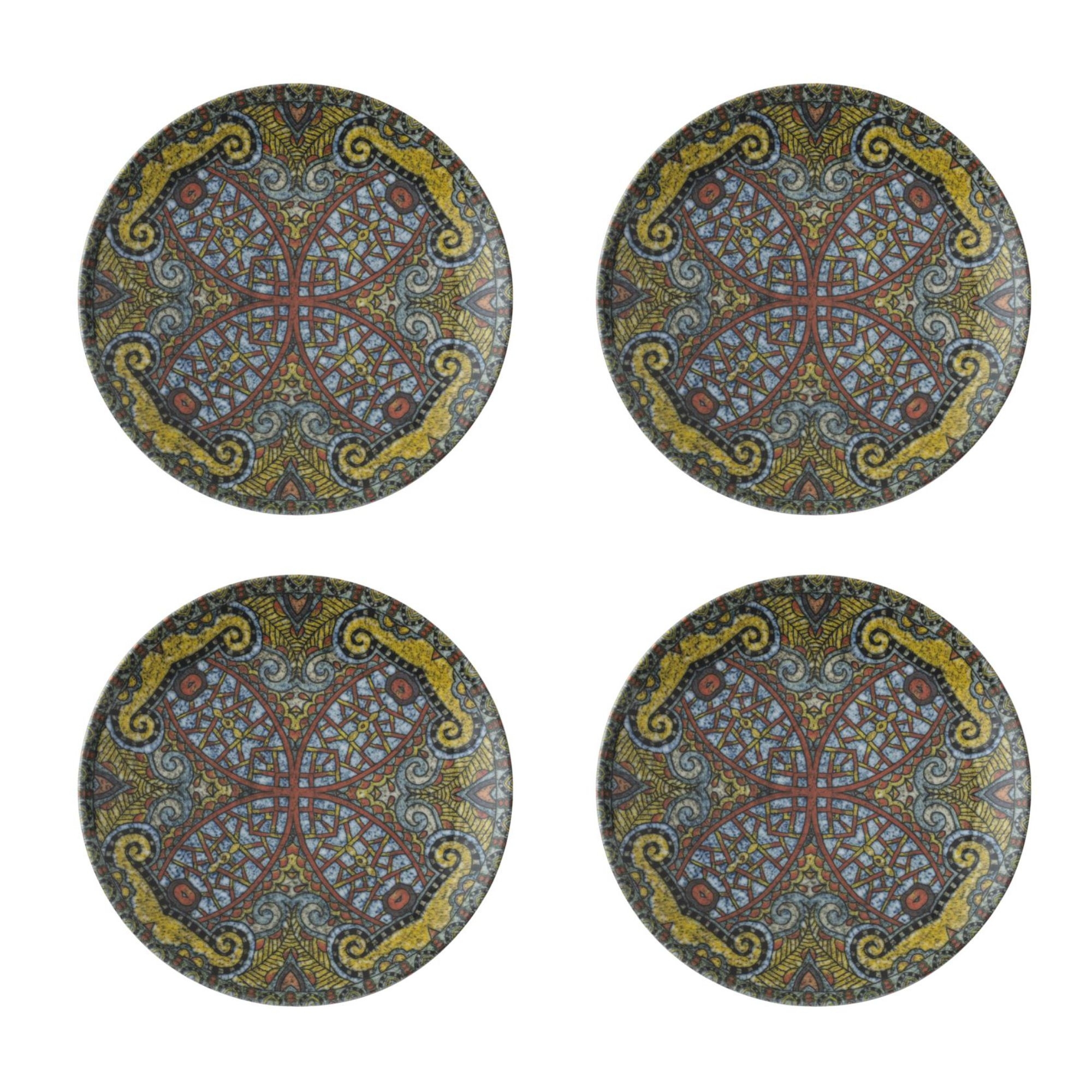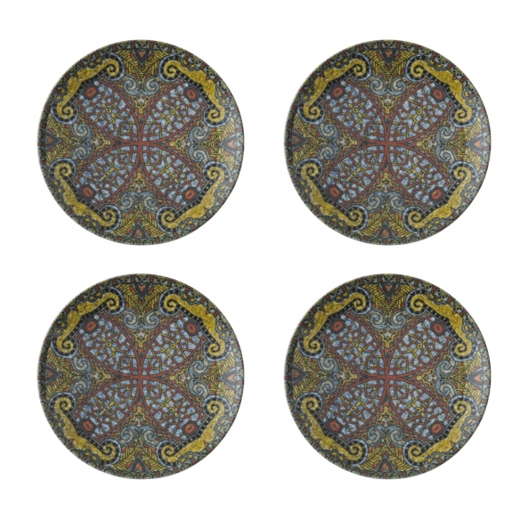 4 flat plates with a diameter of 27.5 cm, belonging to the Mandala collection, made of fine decorated porcelain. Available in 3 different decorations, the Mandala plates are perfect for creating noteworthy mise en place, during a dinner or a special event. The sophisticated decorations give life to magical chromatic effects, creating noteworthy mise en place. Mandala dishes are dishwasher safe. Made by Arthur Krupp.