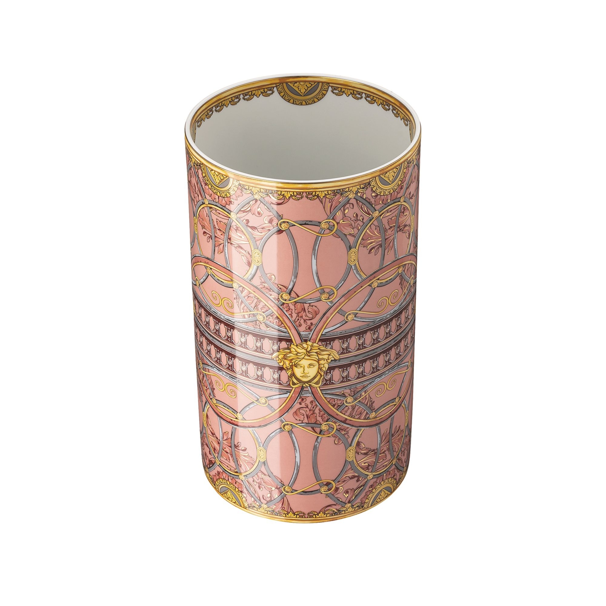 Porcelain Vase with a height of 30 cm, from the Scala del Palazzo collection. A magnificent addition to any collection, this stunning accessory stands out for its beautiful decorations, full of elaborate and golden details. The Baroque-style motifs are highlighted by a delicate rosé background that enhances their decorative value. Made by Versace Rosenthal.