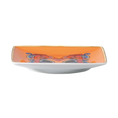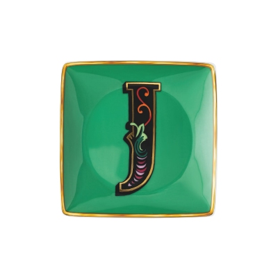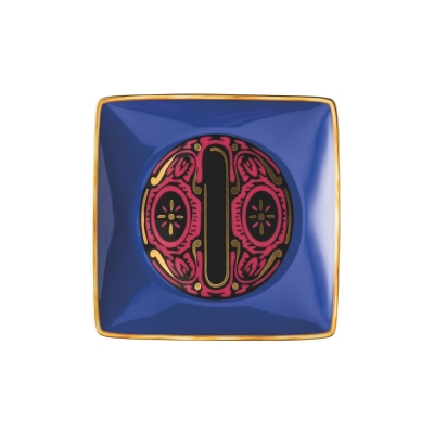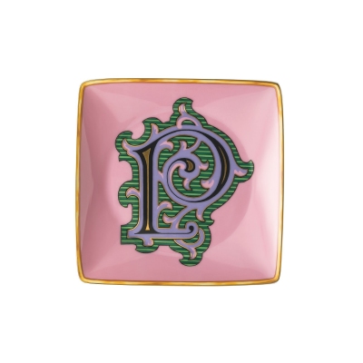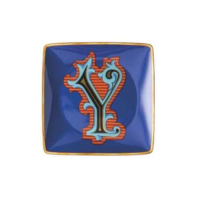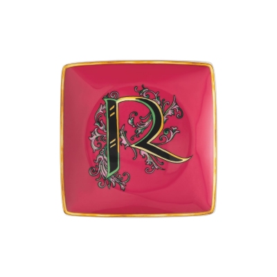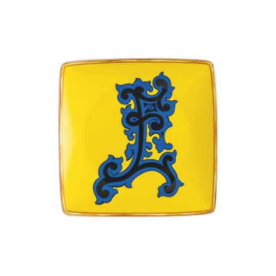 Square flat bowl in fine porcelain 12x12 cm from the Holiday Alphabet collection. Iconic, colorful and decorative, this colorful bowl shows the letter 'C', made using the Baroque lettering technique. A striking central 'C' on a lively background to give a touch of suggestiveness to your table. Made by Versace Rosenthal.