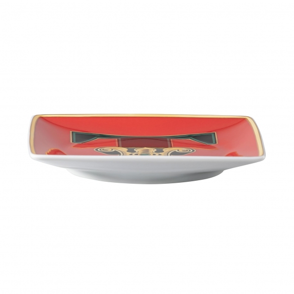 Square flat bowl in fine porcelain 12x12 cm from the Holiday Alphabet collection. Iconic, colorful and decorative, this colorful bowl shows the letter 'T', made using the Baroque lettering technique. A striking central 'T' on a lively background to give a touch of suggestiveness to your table. Made by Versace Rosenthal.