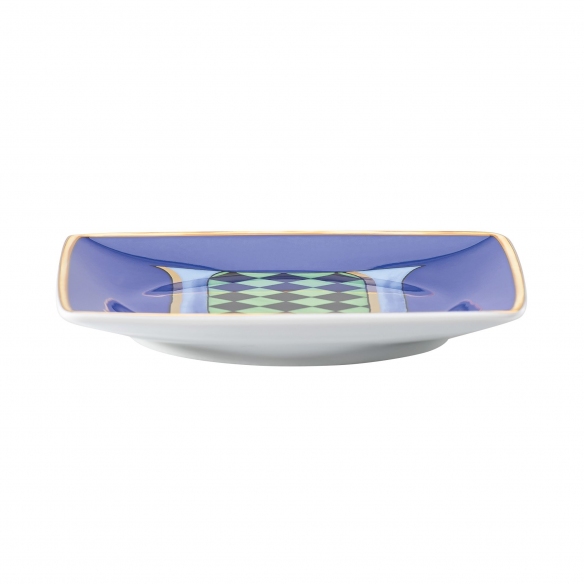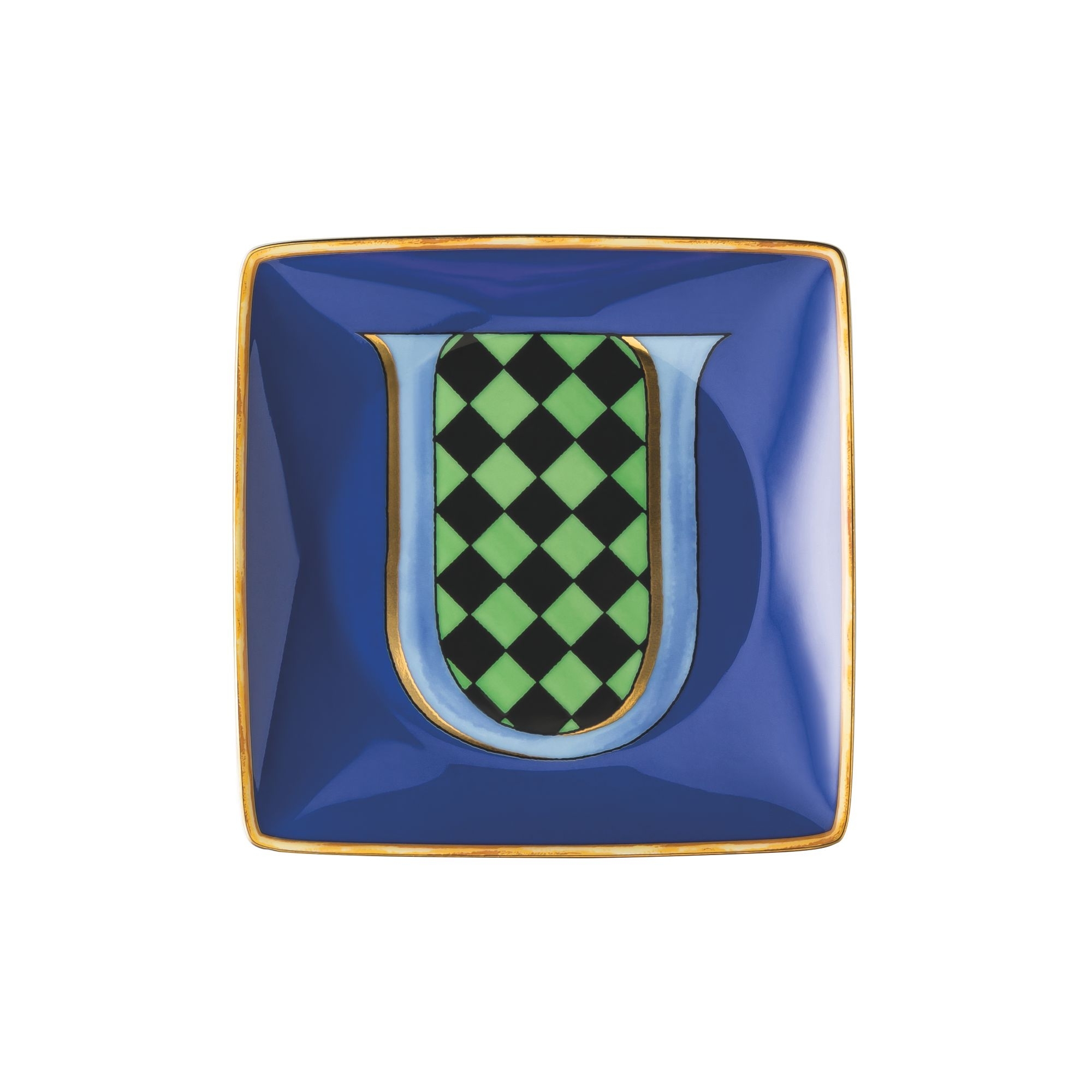 Square flat bowl in fine porcelain 12x12 cm from the Holiday Alphabet collection. Iconic, colorful and decorative, this colorful bowl shows the letter 'U', made using the Baroque lettering technique. A striking central 'U' on a lively background to give a touch of suggestiveness to your table. Made by Versace Rosenthal.
