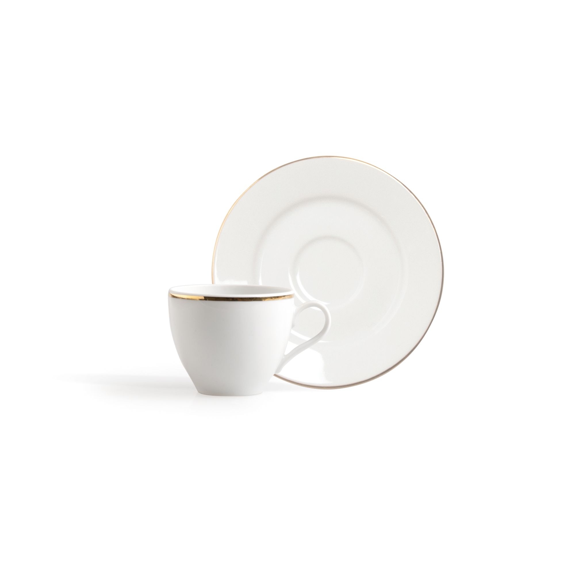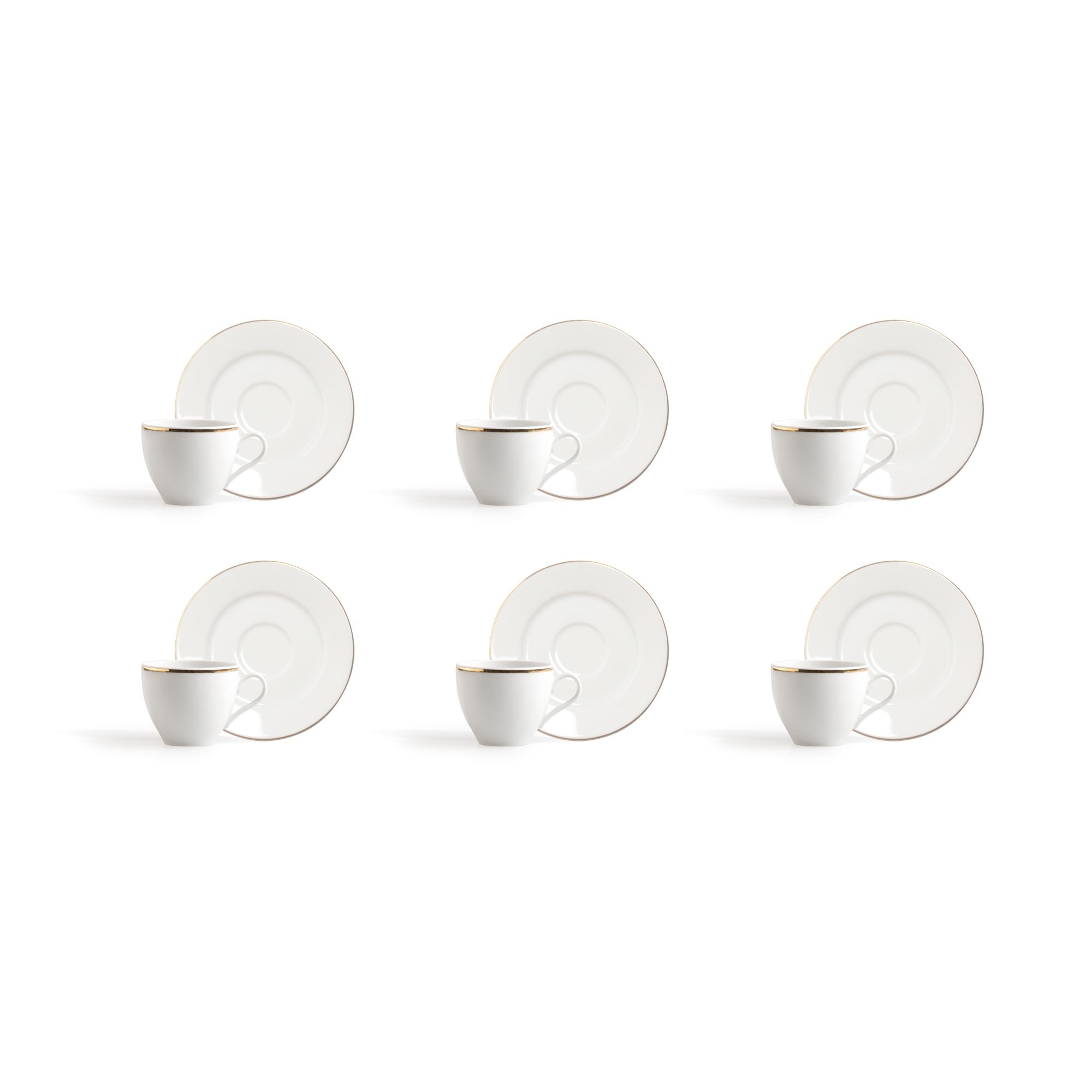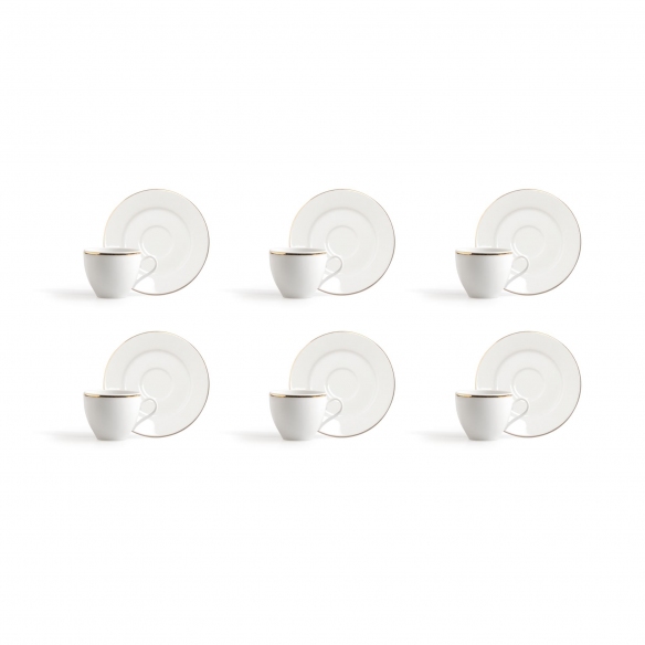 Set of 6 porcelain espresso cups including saucers, from the Gold collection. The charming gold-colored border, on both the cups and saucers, gives the objects a glamorous touch. They have a capacity of 10 cl and are dishwasher safe. Made by Excelsa.