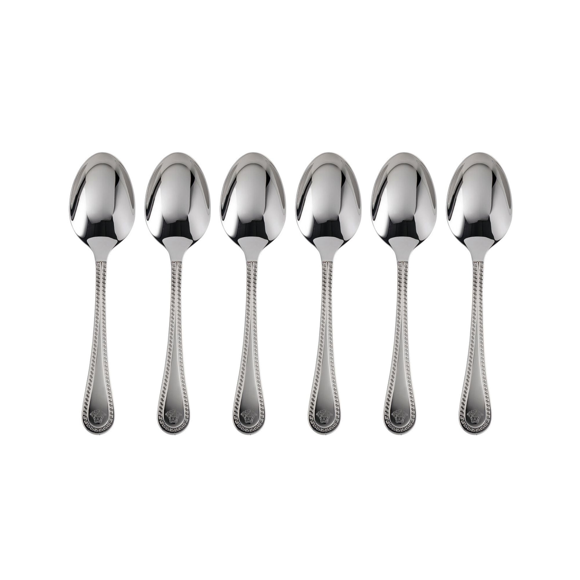 Set of 6 stainless steel dessert spoons, from the Greca collection. Aesthetically pleasing, these beautiful Greca dessert spoons will add finesse to your table. Each cutlery is enriched with meticulous details, the handle shows a majestic Medusa, a Versace icon, and the versatility of steel makes the object suitable for everyday use. Made by Versace Rosenthal.
