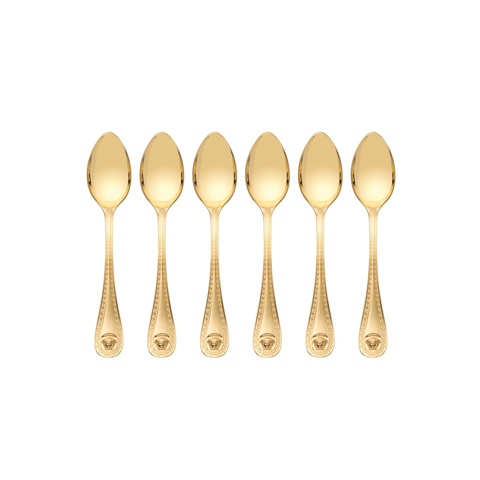 Set of 6 stainless steel tea spoons, from the Medusa Vergoldet collection. Elegantly designed, the Medusa Versilbert tea spoons are perfect in formal settings or any special occasion. A superb engraving depicting a majestic Medusa, a Versace icon, takes over the handle, which is also extremely handy. The gold finish brings out the sophistication of these beautiful objects. Made by Versace Rosenthal.