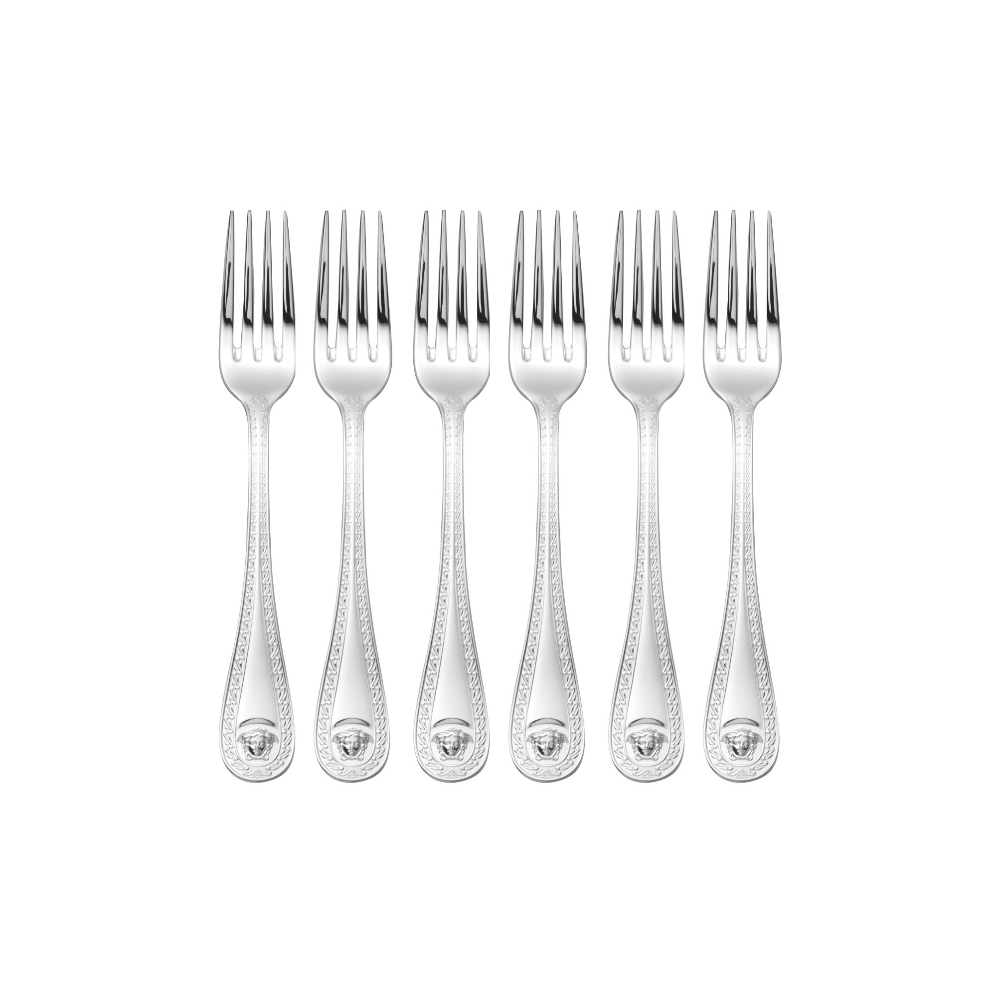 Set of 6 stainless steel dessert forks, from the Medusa Versilbert collection. Delicately shaped, the Medusa Versilbert dessert forks feature long and thin teeth, which allow you to accurately pick even the most delicate desserts. The handle of each fork is extremely handy and is enriched with a superb engraving with the Versace-style medusa. Made by Rosenthal Versace.