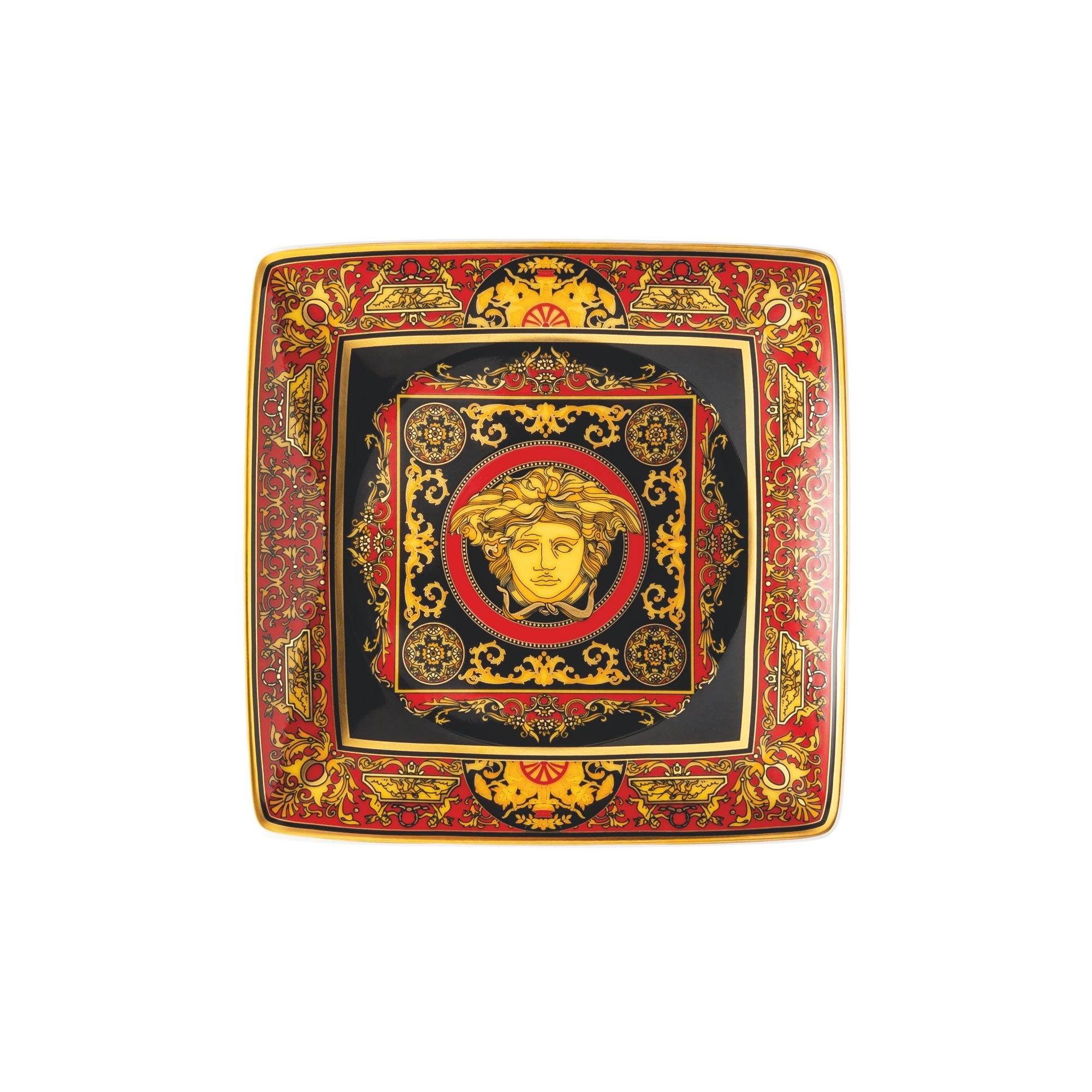 Porcelain bowl, 12x12 cm, from the Medusa collection. With its timeless elegance, the Medusa bowl stands out for its intricate patterns, the fullness of colors and the preciousness of porcelain. The fullness of black combines with the magnificence of gold against an eccentric red background. Collect Medusa Tableware Makes a great housewarming gift. Designed by Rosenthal Versace.