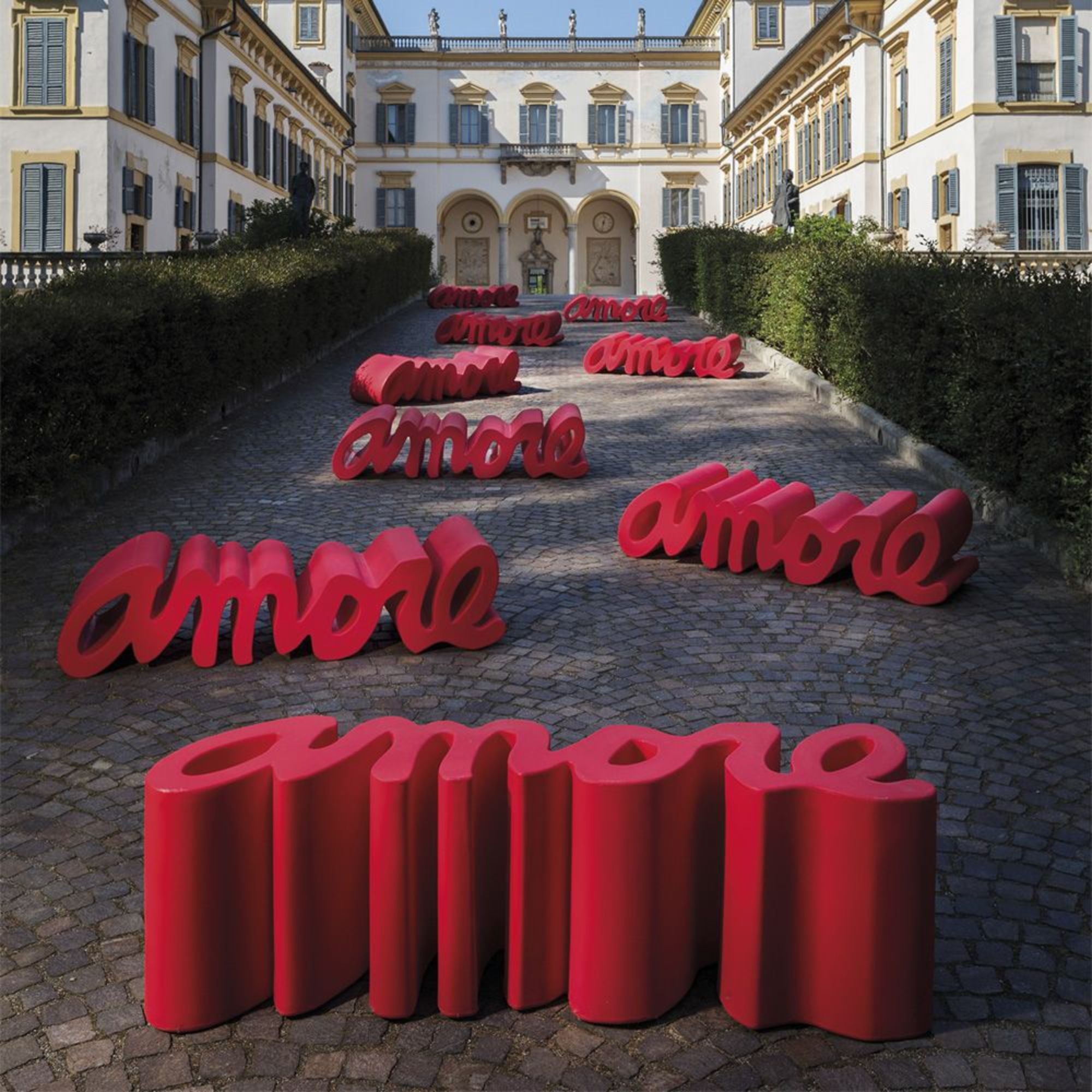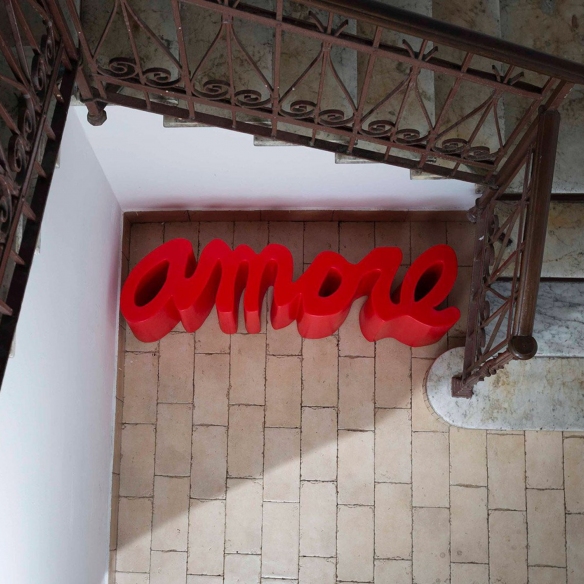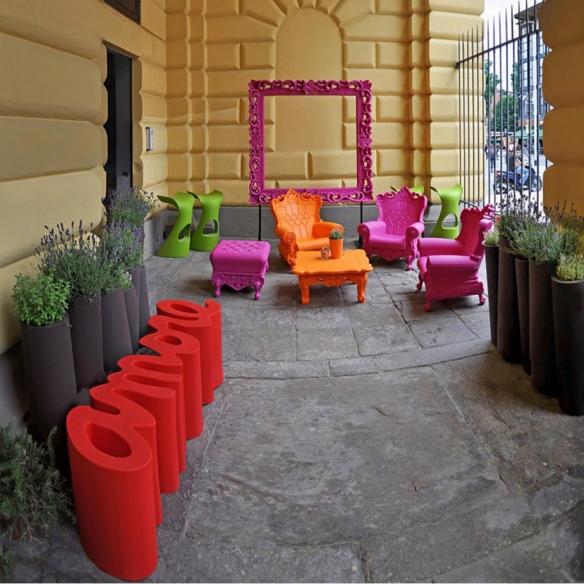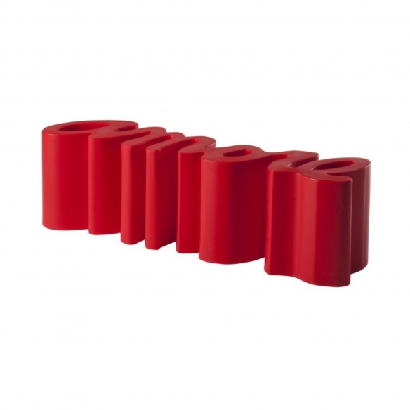 Amore bench made of polyethylene. Amore is an extravagant and eccentric seat that stands out for its full and exuberant shades, the unpredictable design and the versatility of the materials, fully expressing the creativity of its designer. Infuse a touch of playful light-heartedness to your rooms, choose the whimsy of pop style. Designed by Giò Colonna Romano for Slide.