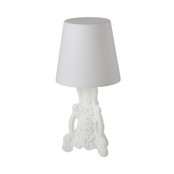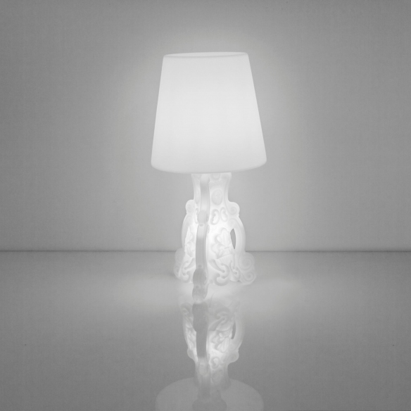 Polyethylene table lamp with light base from the Lady of Love collection. With a perfect balance between light and shadow, the Lady of Love lamp makes any living space more welcoming, drawing attention to the most noteworthy areas. Available in the version with a light base, the lamp stands out for its intricate textures and ornamental abundance, reminiscent of the eccentricity of the Baroque aesthetic. Choose Lady of Love and bring new energy to your environments. Designed by Moro and Pigatti for Slide.