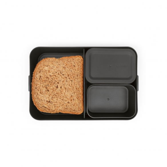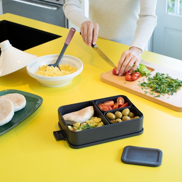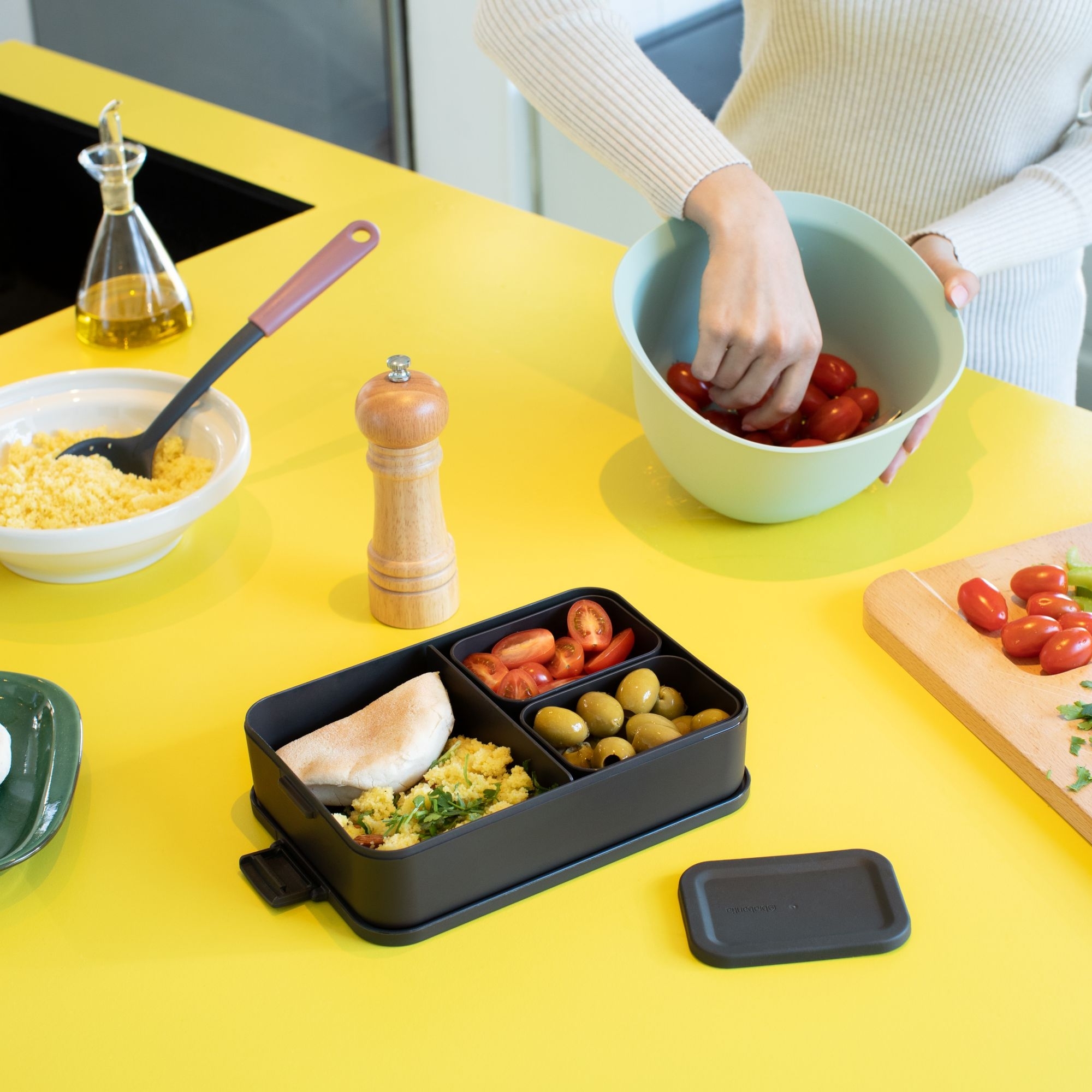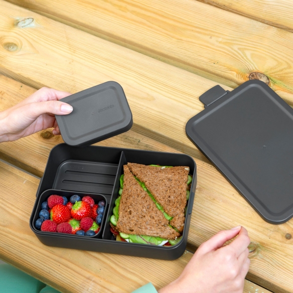 Lunch box from the Make & Take collection made of 100% recyclable thermoplastic resin. Available in three beautiful finishes, the Make & Take lunch box is perfect for bringing lunch to the office or school. Equipped with lid with clip, it offers space for 4 sandwiches. The ideal accessory for those always on the run. Made by Brabantia.