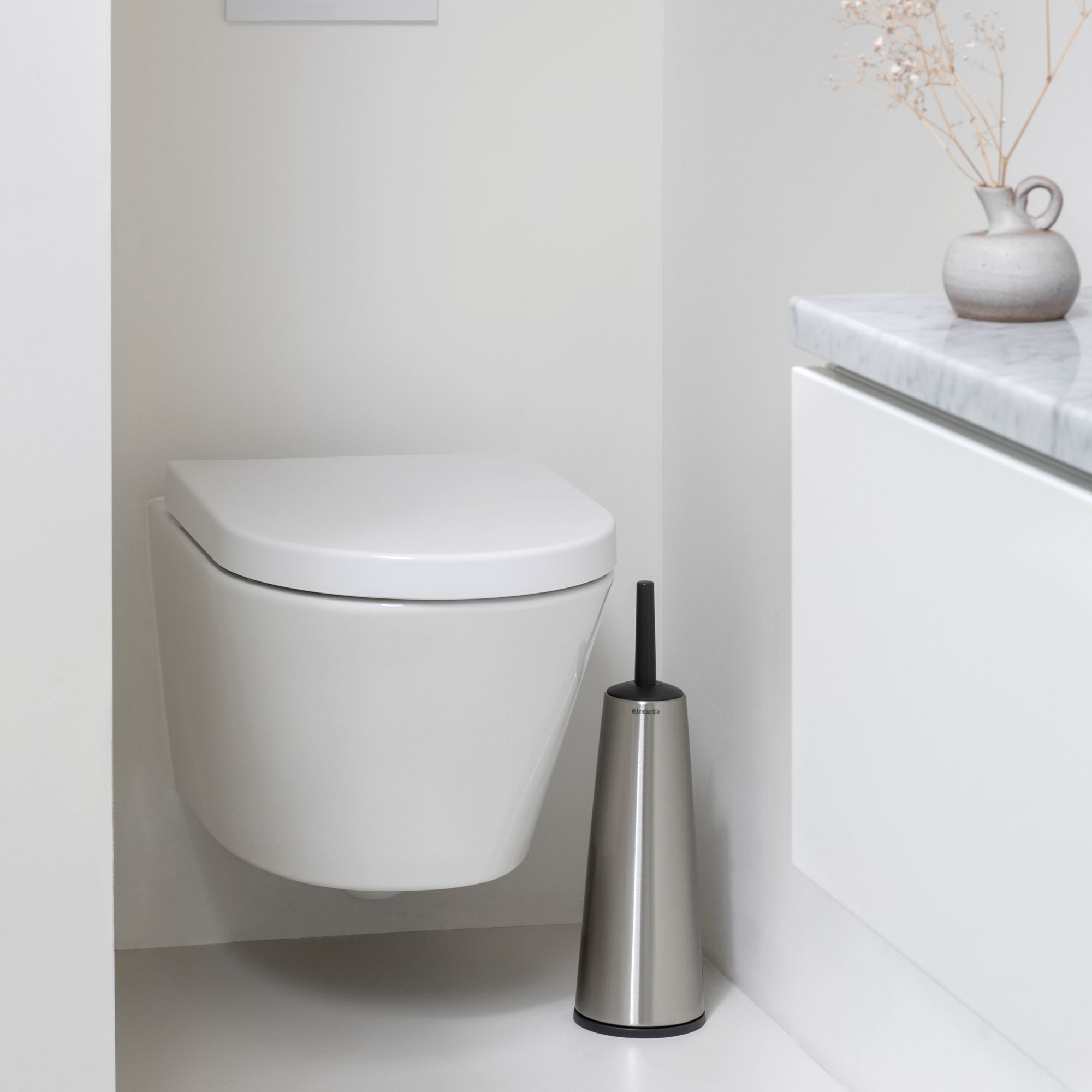 Toilet brush from the ReNew collection, painted steel brush holder and plastic brush. Ideal for your bathroom, the ReNew toilet brush is very easy to clean and empty: just lift the holder and pour out the excess water. The design is very clever: it keeps the toilet brush hidden but makes it ready to use. A nice addition to any bathroom. Made by Brabantia.