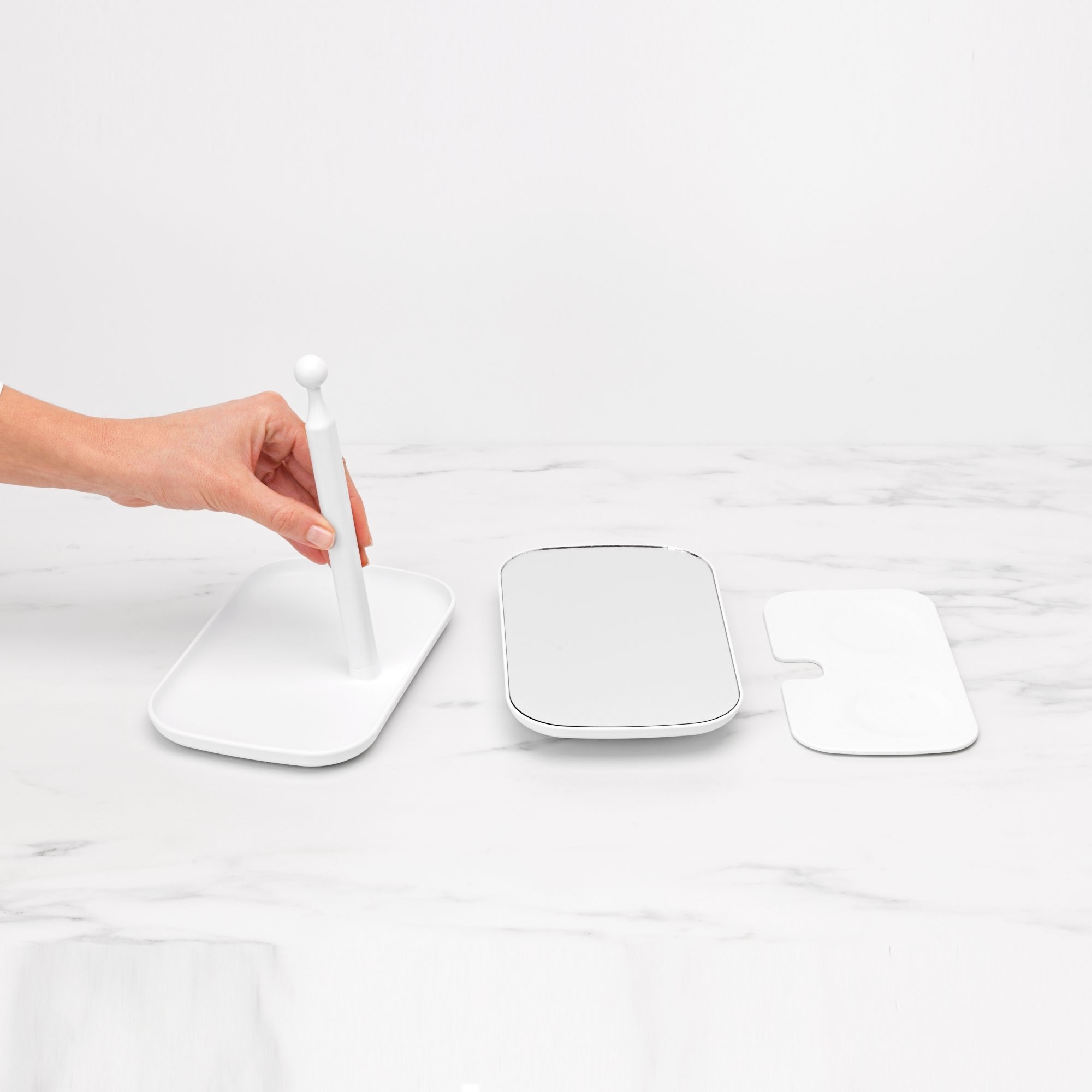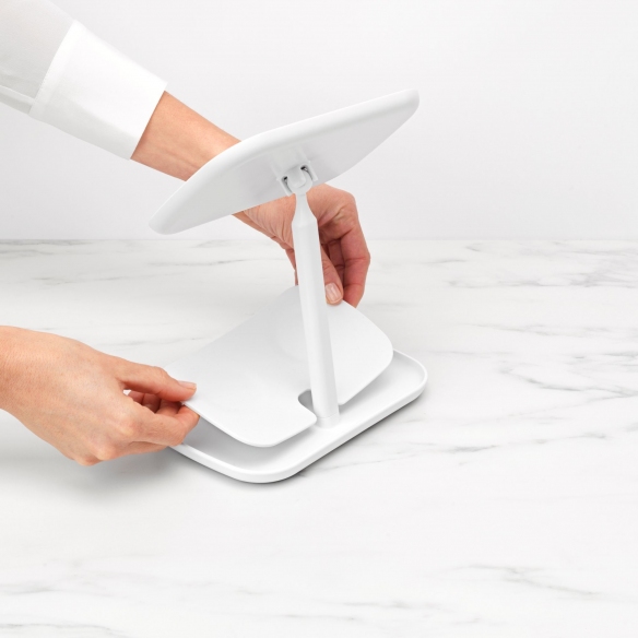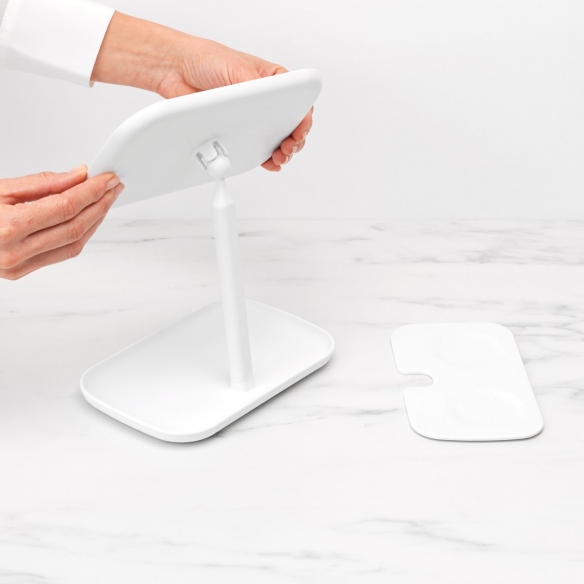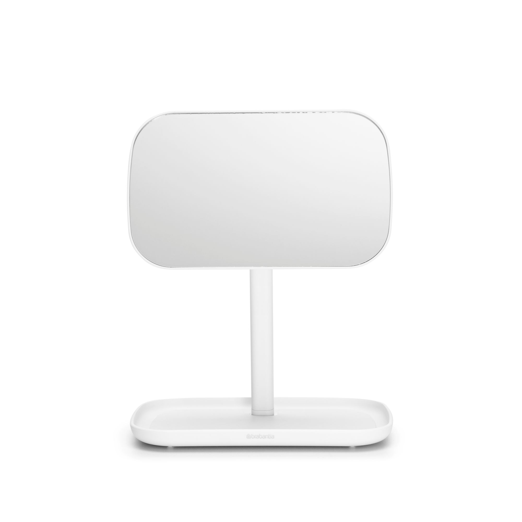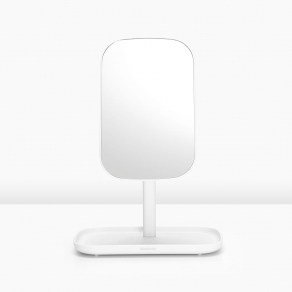 Bathroom mirror from the ReNew collection, made of thermoplastic resin. Available in 3 stylish color finishes, the ReNew bathroom mirror features a storage tray, perfect for organizing small items, makeup or jewelry. 360 degree adjustable, ideal for a morning shave or make-up. A versatile object able to give an exclusive look to any bathroom. Made by Brabantia.