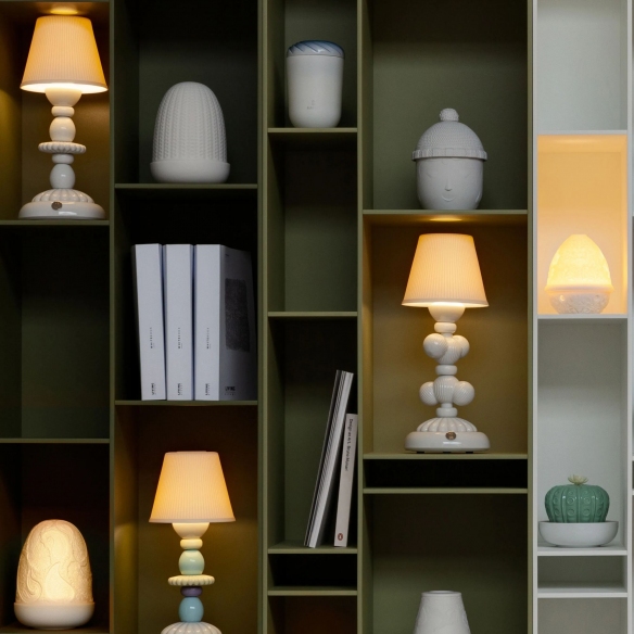 Firefly Cactus wireless table lamp, made of glossy porcelain with translucent porcelain lampshade. This table lamp is a unique, functional and exclusive piece of furniture that is inspired by the love for art and nature. The sophisticated design is enhanced by the elegance of pastel shades and the sophistication of porcelain. Available in white, yellow-blue, green and pink, Firefly Cactus emits a warm, soft and pleasant light reminiscent of the glow of fireflies. Each item in the Firefly collection bears the unmistakable Lladró brand. Made by Lladró