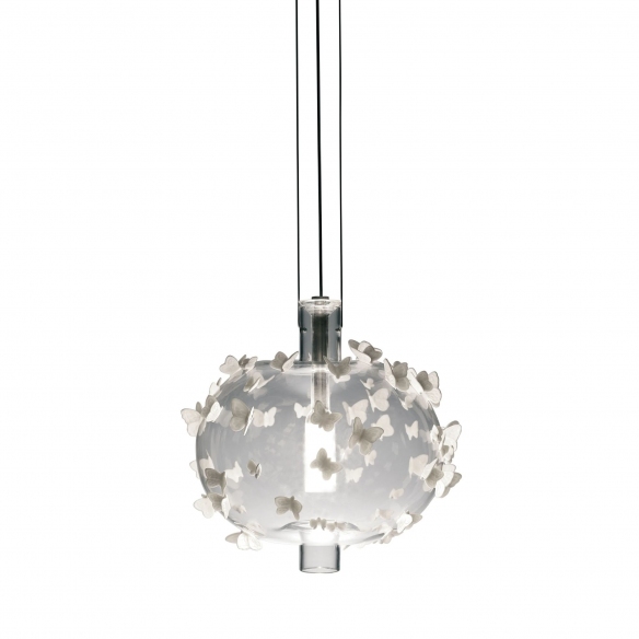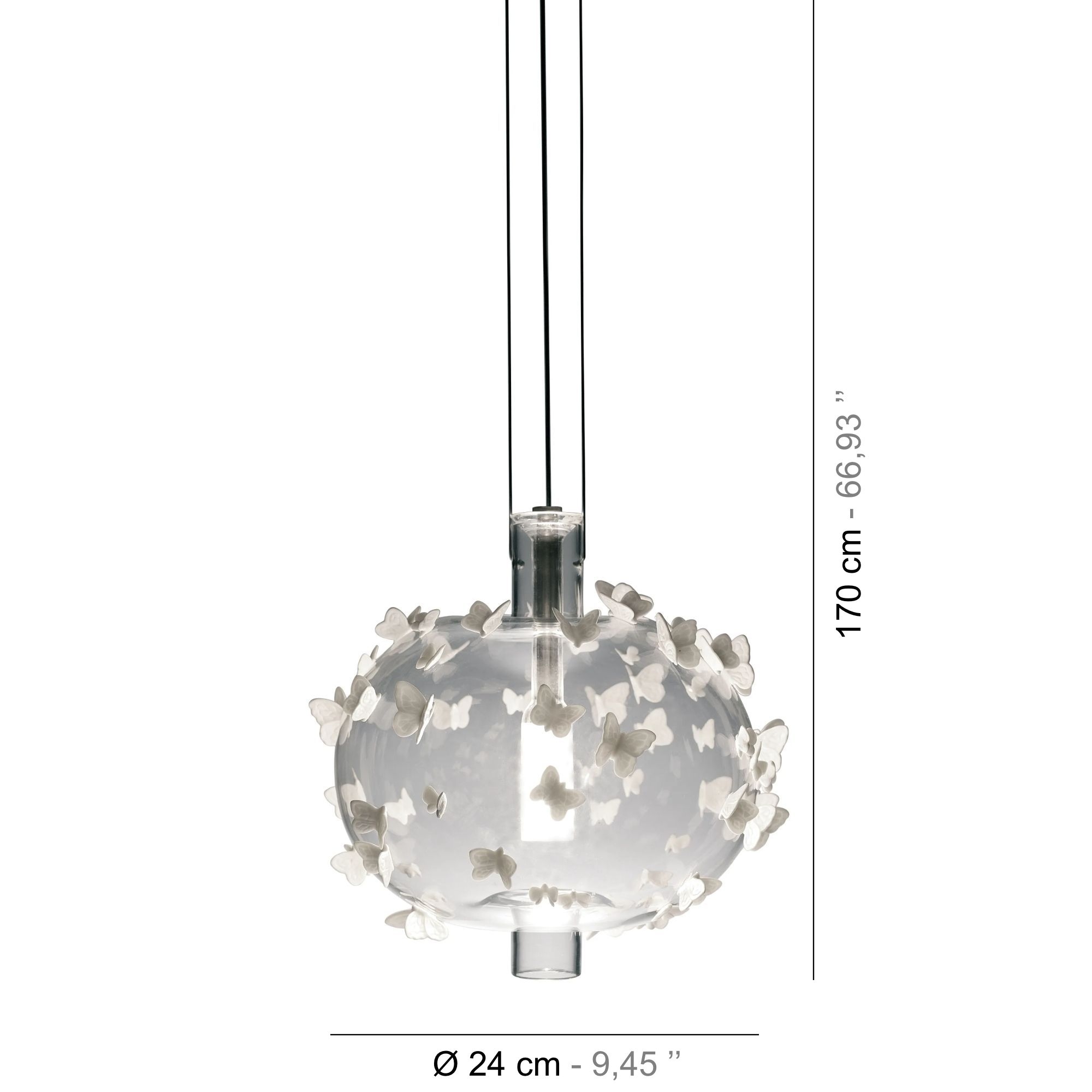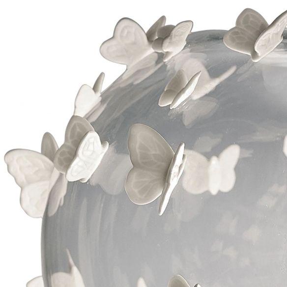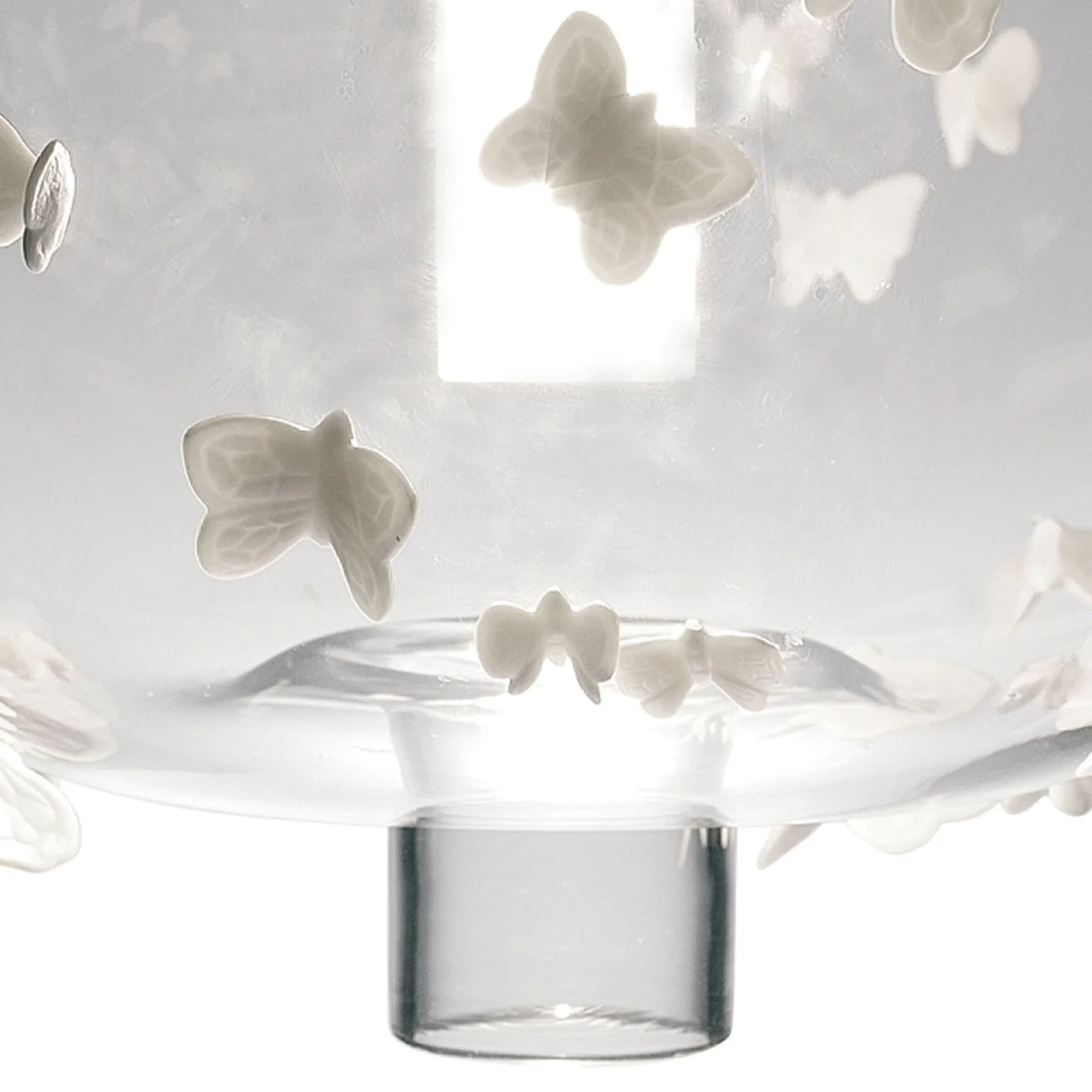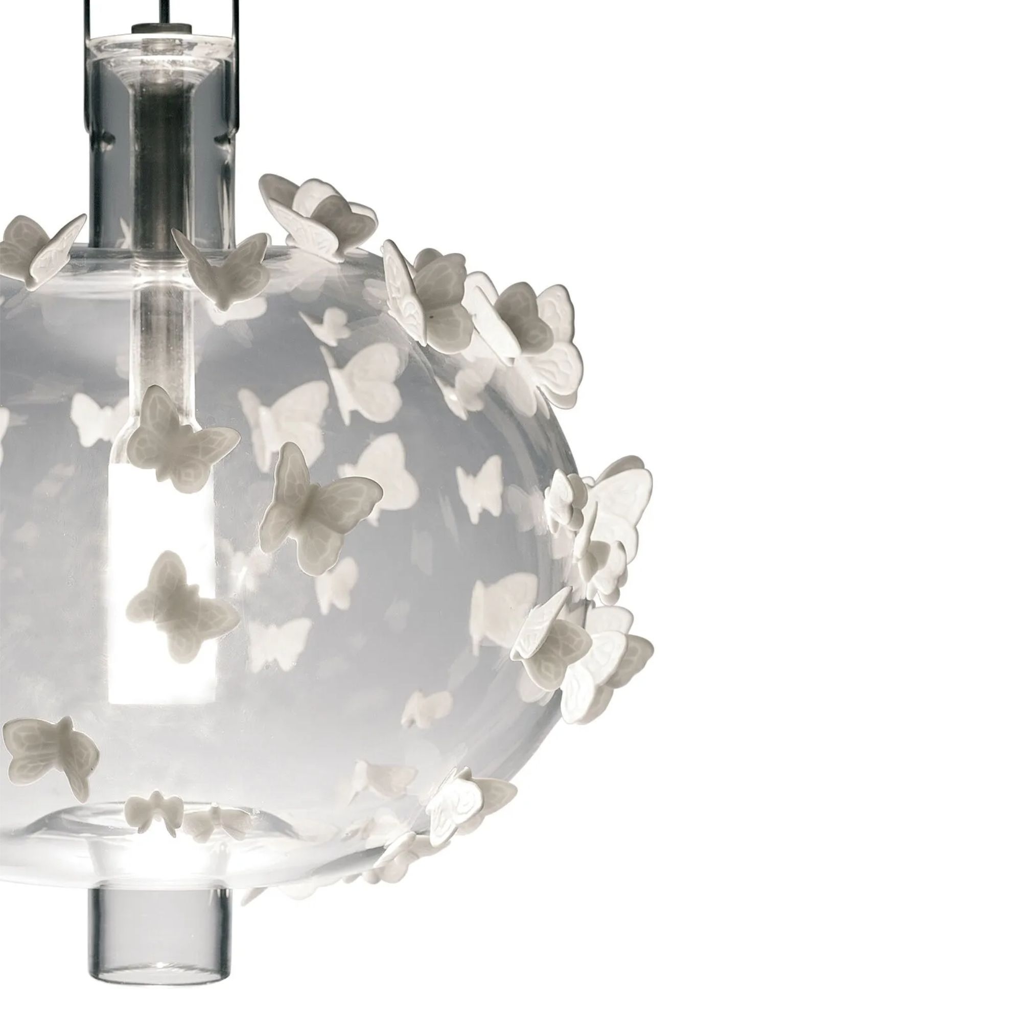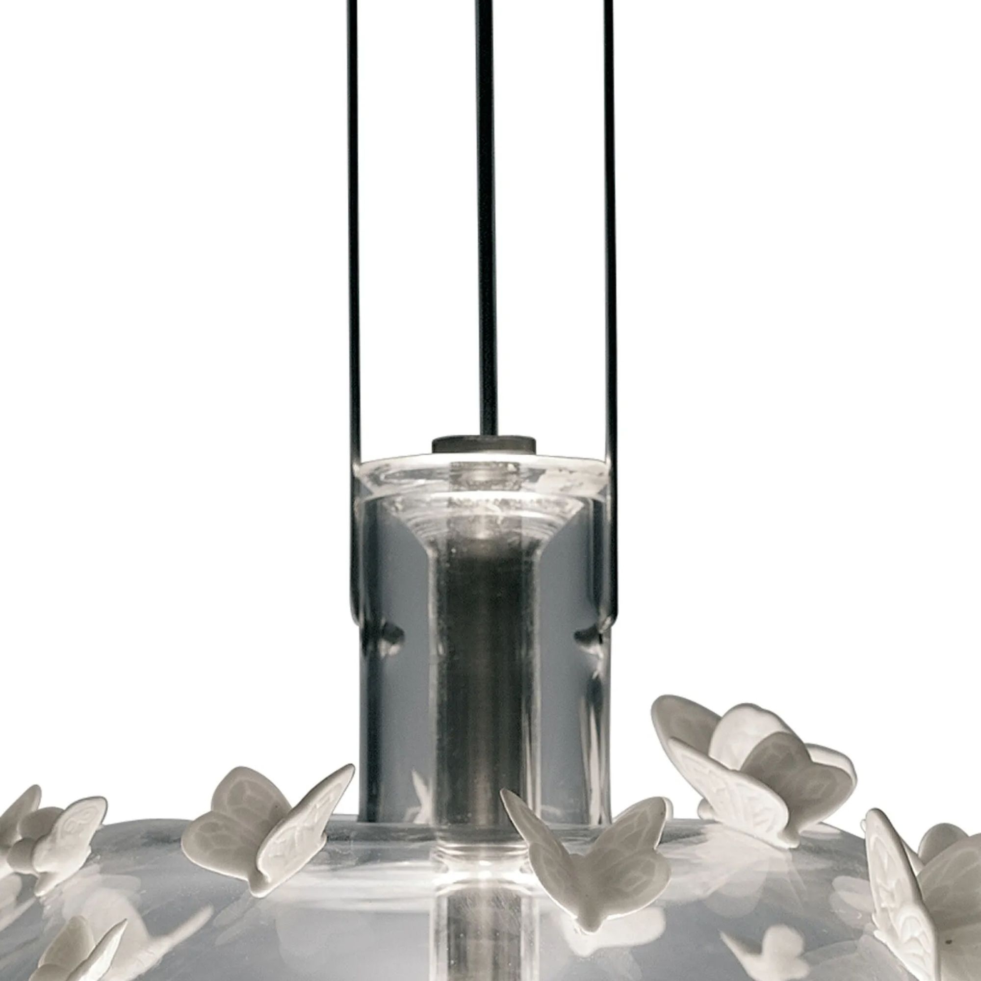 The Freeze Frame II pendant lamp has been crafted by Lladró using blown glass, with porcelain butterfly applications that ensure elegance, innovation, and longevity. This magnificent suspended lamp, with its unique and refined design and its gentle and delicate shape, harmonizes with any type of furnishing and setting: whether it is placed in a modern-design bedroom, within a minimalist living room, or in a lounge, Freeze Frame II reflects light with a softness and warmth that adds a welcoming and serene atmosphere to any space. In fact, once the product is turned on, it comes to life, creating theatrical shadows that decorate the surrounding walls with a brilliant light, making it a unique element for home decoration. Designed by Bodo Sperlein for Lladró.