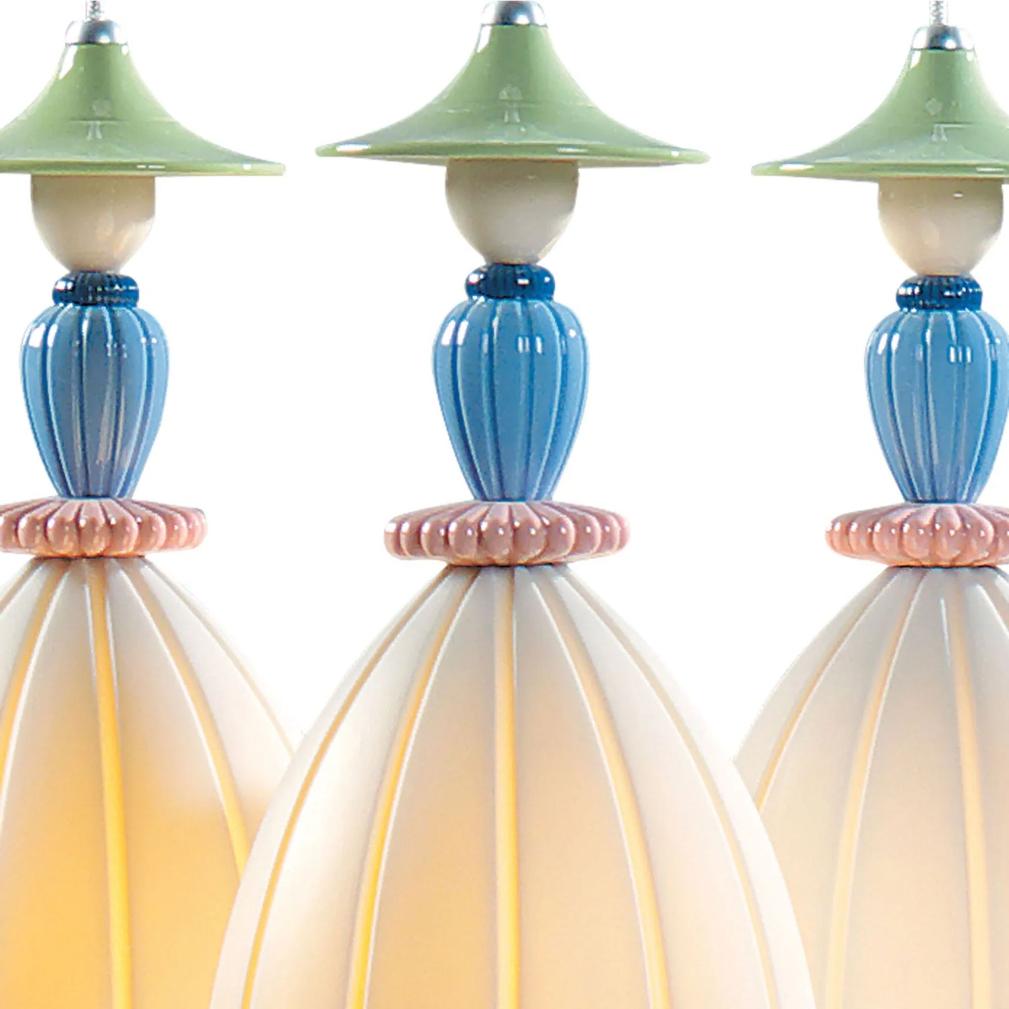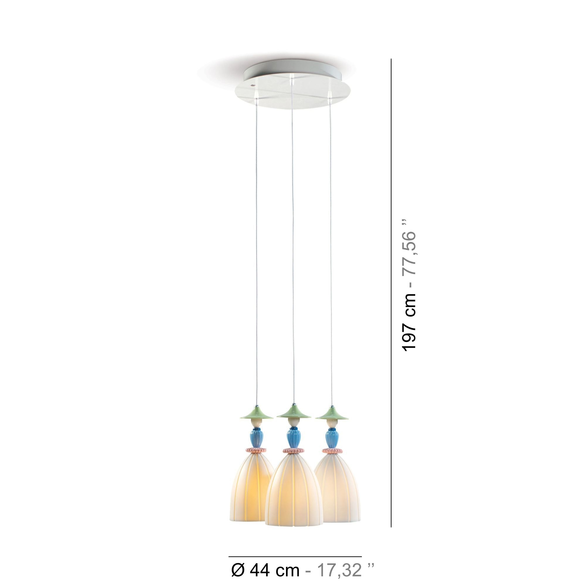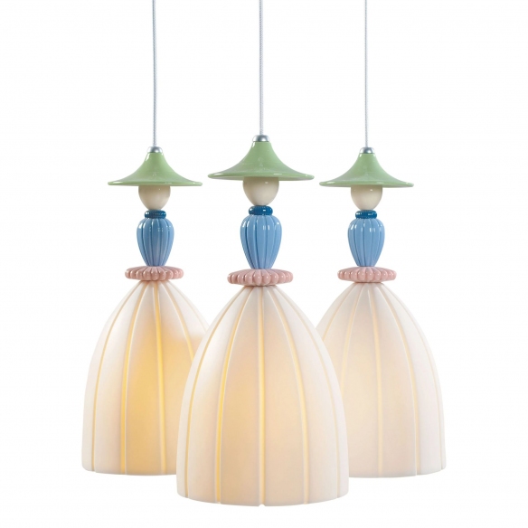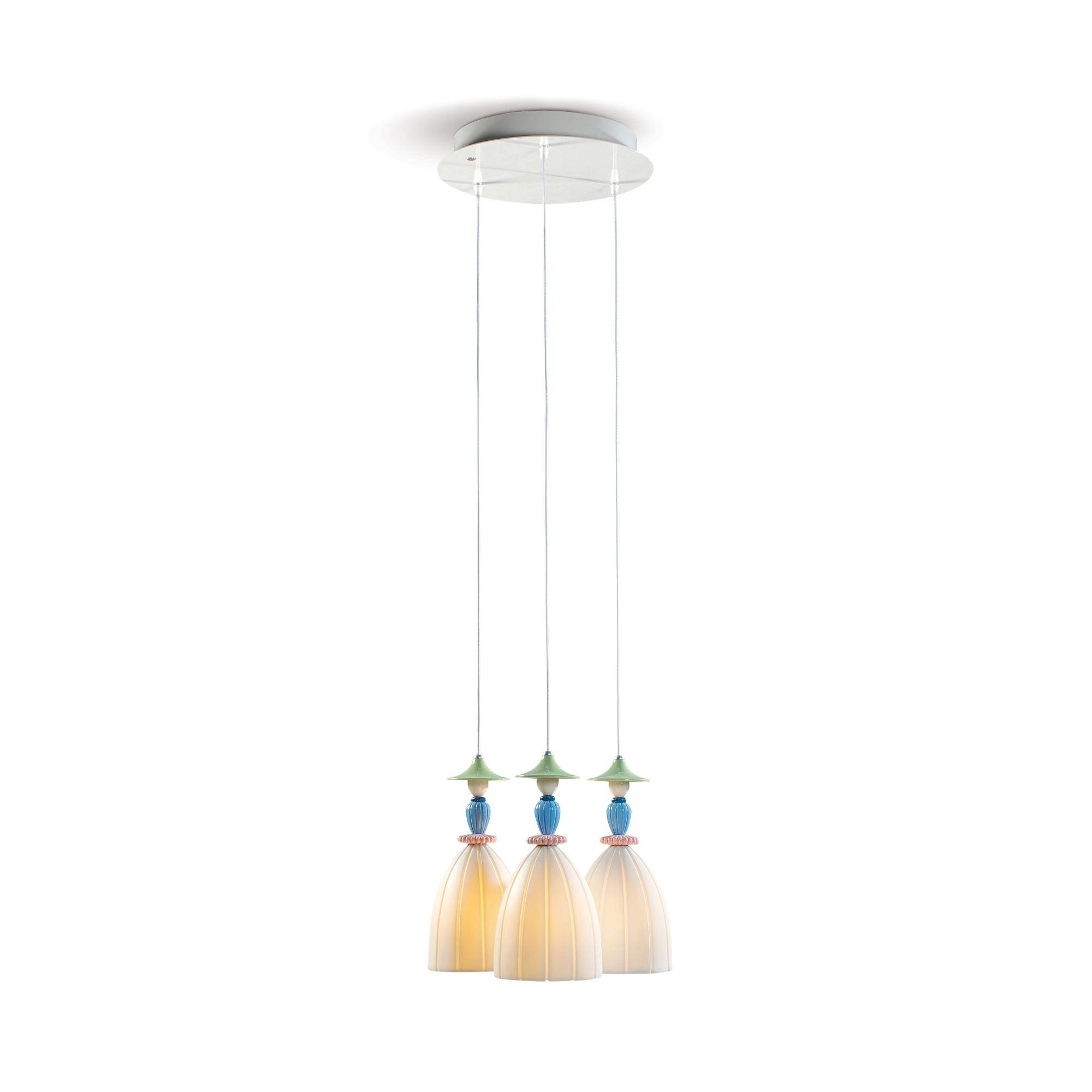 Mademoiselle Sharing secrets three-light pendant lamp in porcelain. Mademoiselle is a lamp that captures the essence of a romantic soul and with its sinuous and delicate shapes is able to create a dreamy and ethereal atmosphere. The body is inspired by the beauty and mystery of women and is embellished with details that evoke femininity and romance. Mademoiselle is a decidedly unique and special furnishing accessory that emphasizes the preciousness of porcelain and that loves to be admired. Made by Lladró