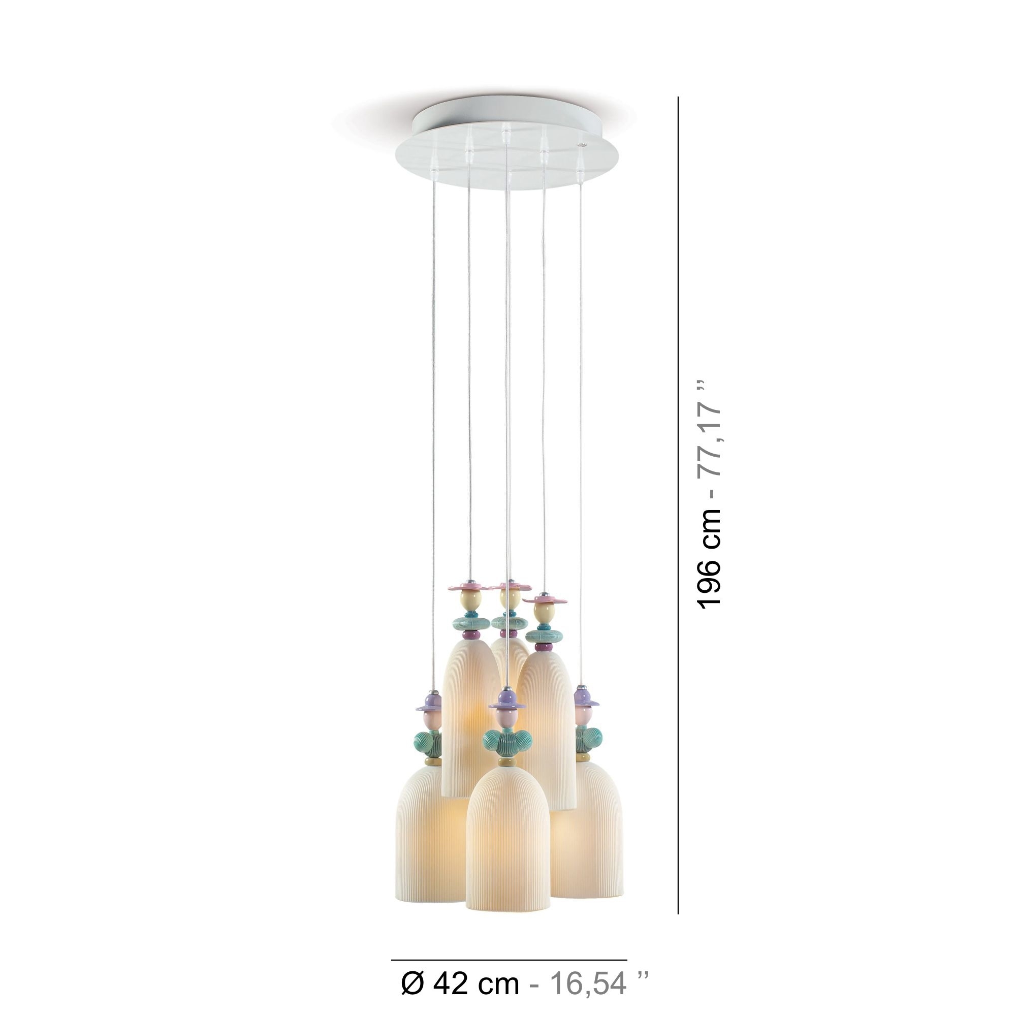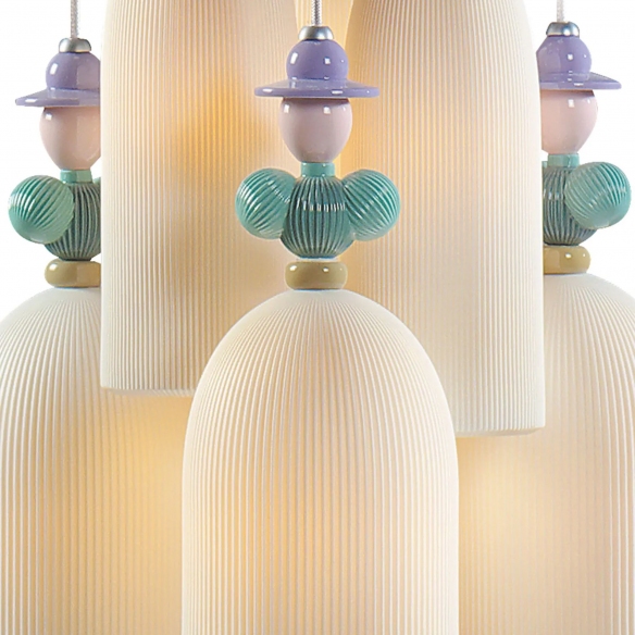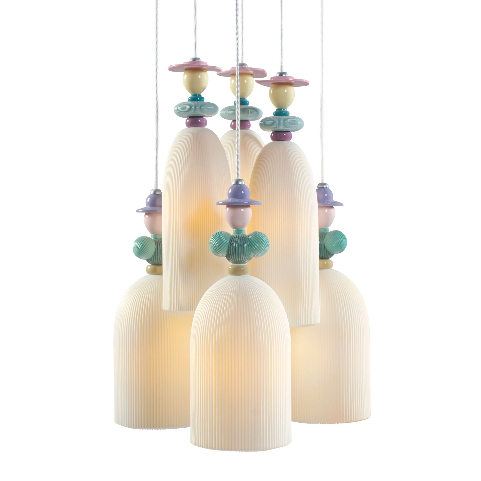 Mademoiselle Meeting in the garden suspension lamp with 6 lights in porcelain. Mademoiselle is a lamp that captures the essence of a romantic soul and with its sinuous and delicate shapes is able to create a dreamy and ethereal atmosphere. The body is inspired by the beauty and mystery of women and is embellished with details that evoke femininity and romance. Mademoiselle is a decidedly unique and special furnishing accessory that emphasizes the preciousness of porcelain and that loves to be admired. Made by Lladró