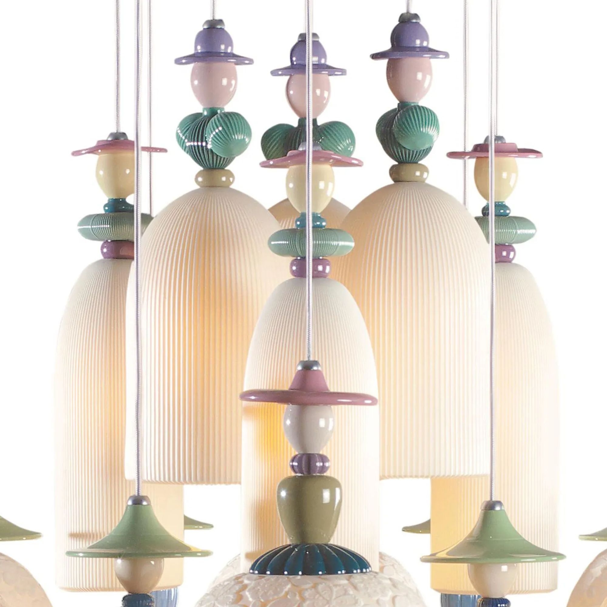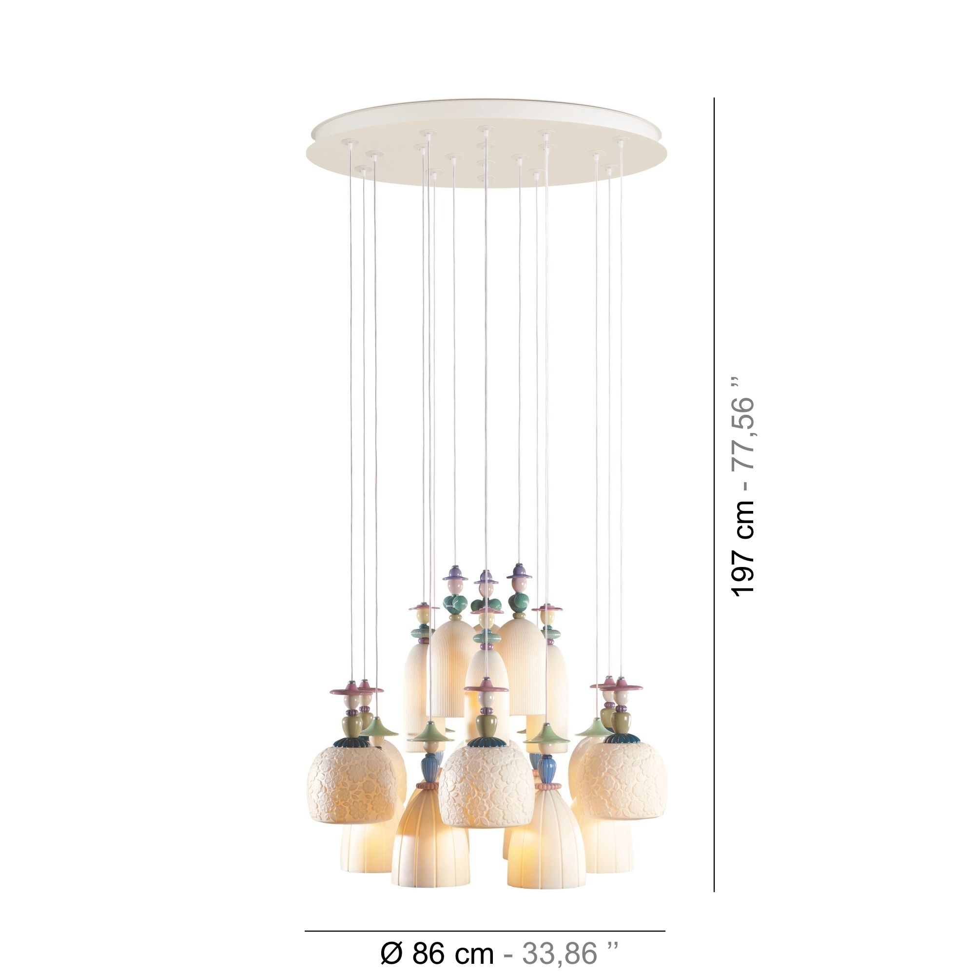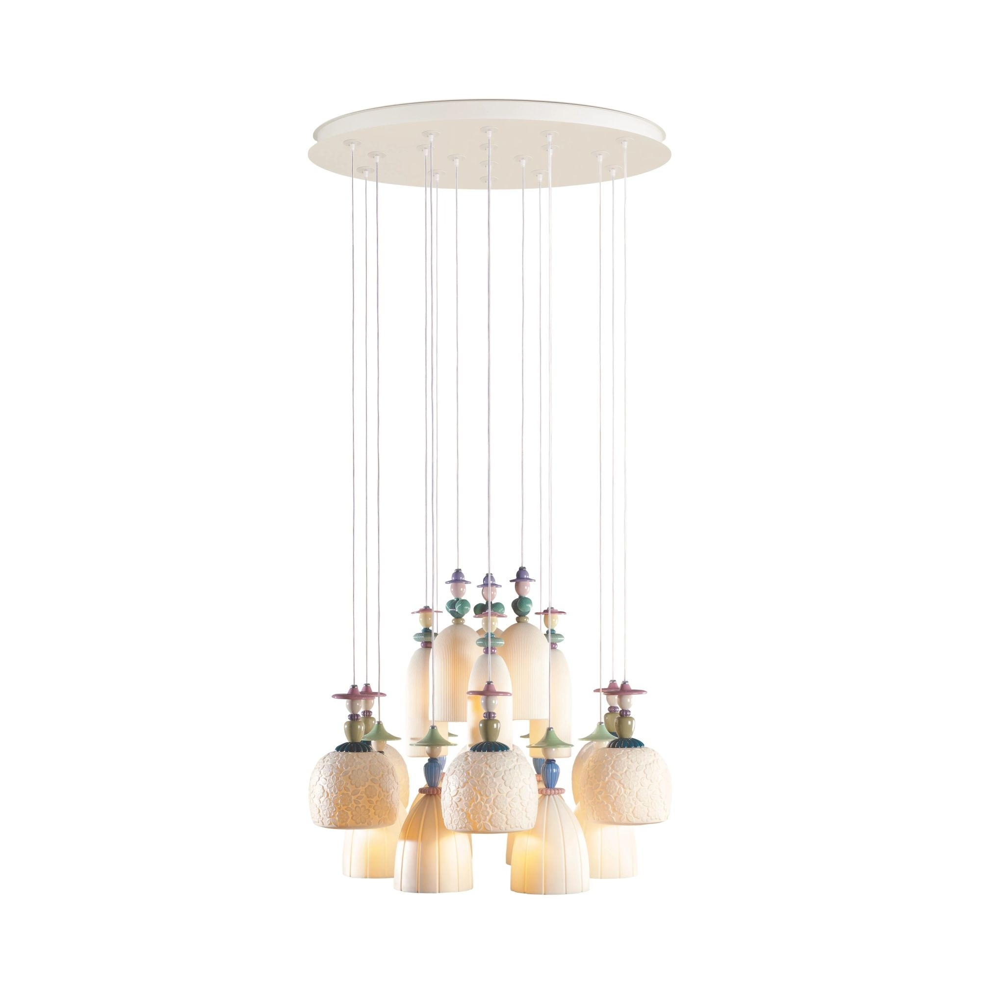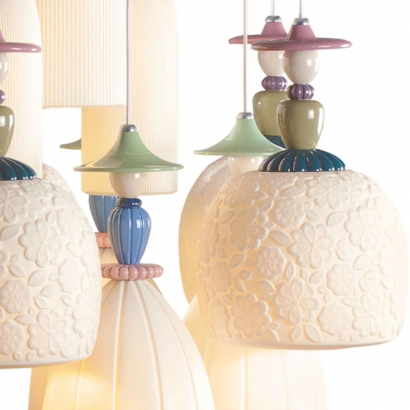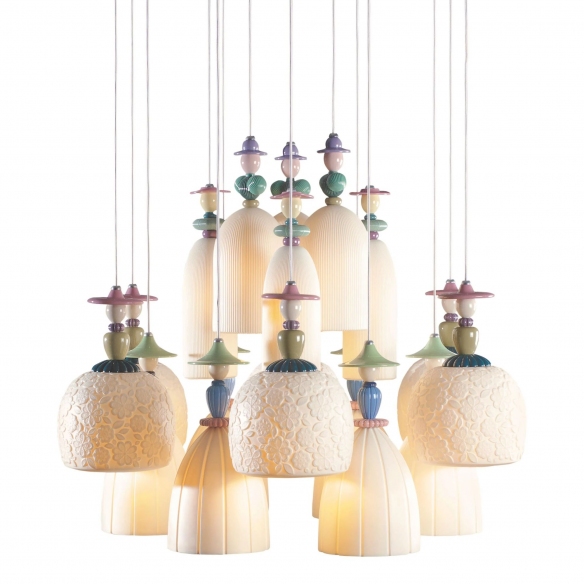 Mademoiselle Dancing on the sand pendant lamp with 18 lights in porcelain. Mademoiselle is a lamp that captures the essence of a romantic soul and with its sinuous and delicate shapes is able to create a dreamy and ethereal atmosphere. The body is inspired by the beauty and mystery of women and is embellished with details that evoke femininity and romance. Mademoiselle is a decidedly unique and special furnishing accessory that emphasizes the preciousness of porcelain and that loves to be admired. Made by Lladró