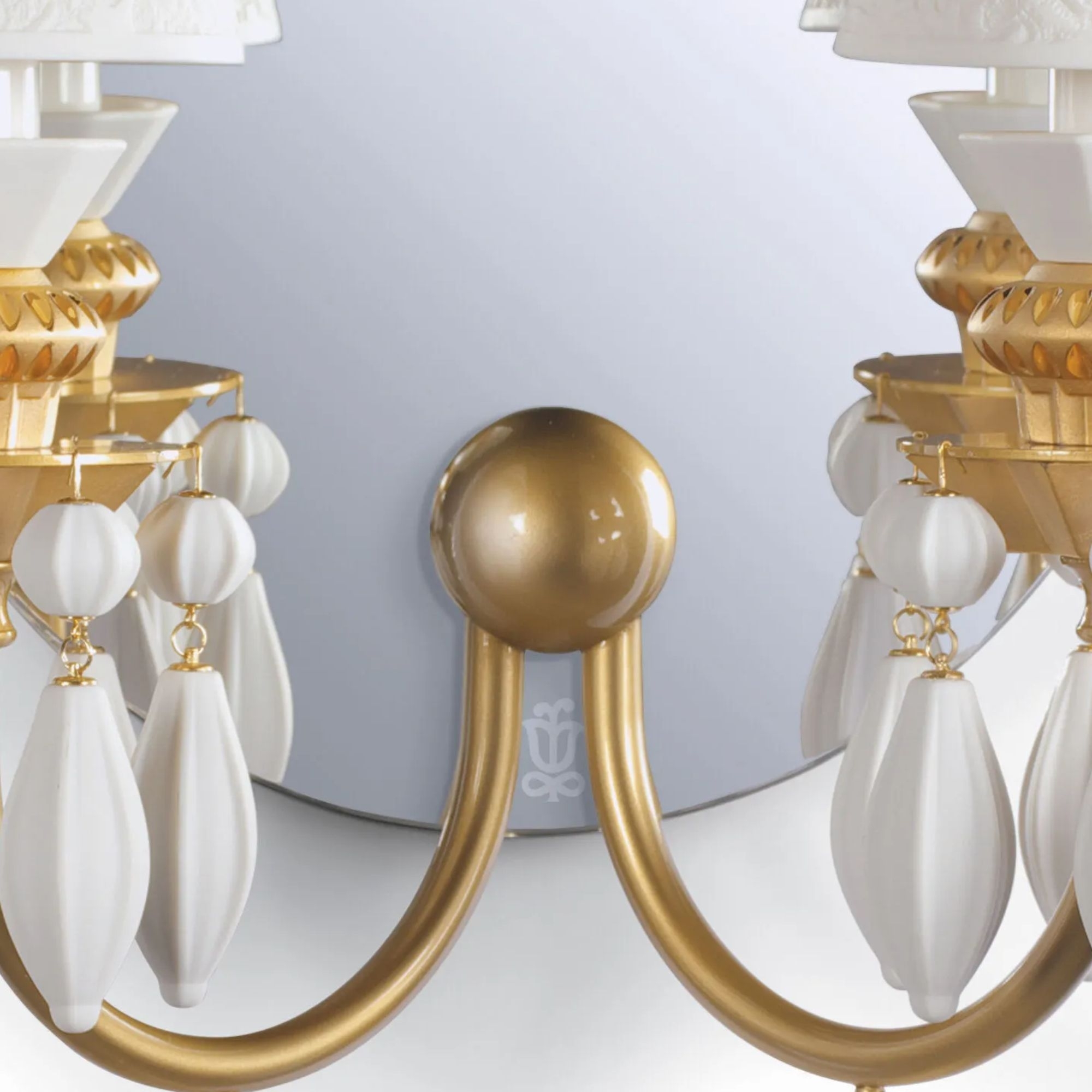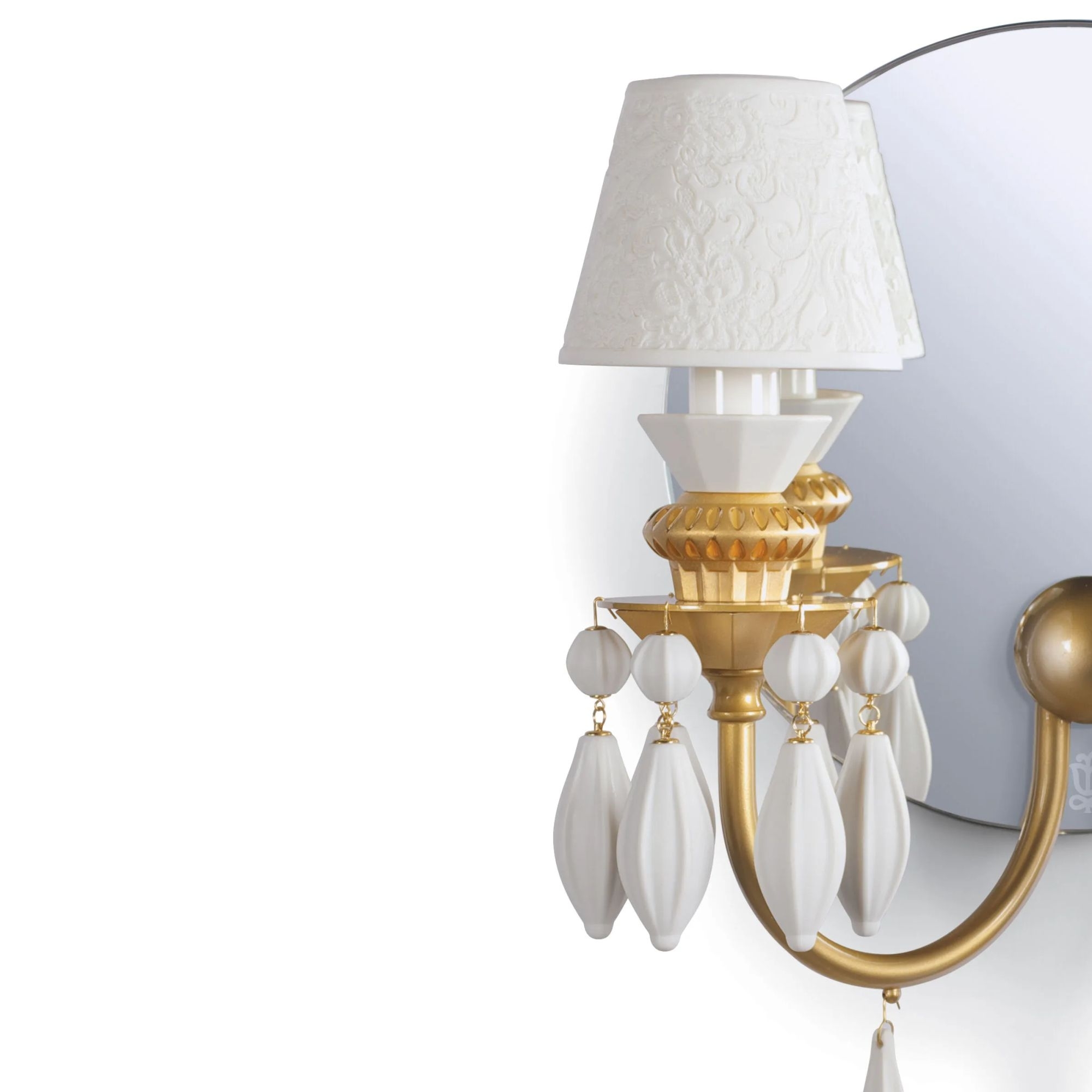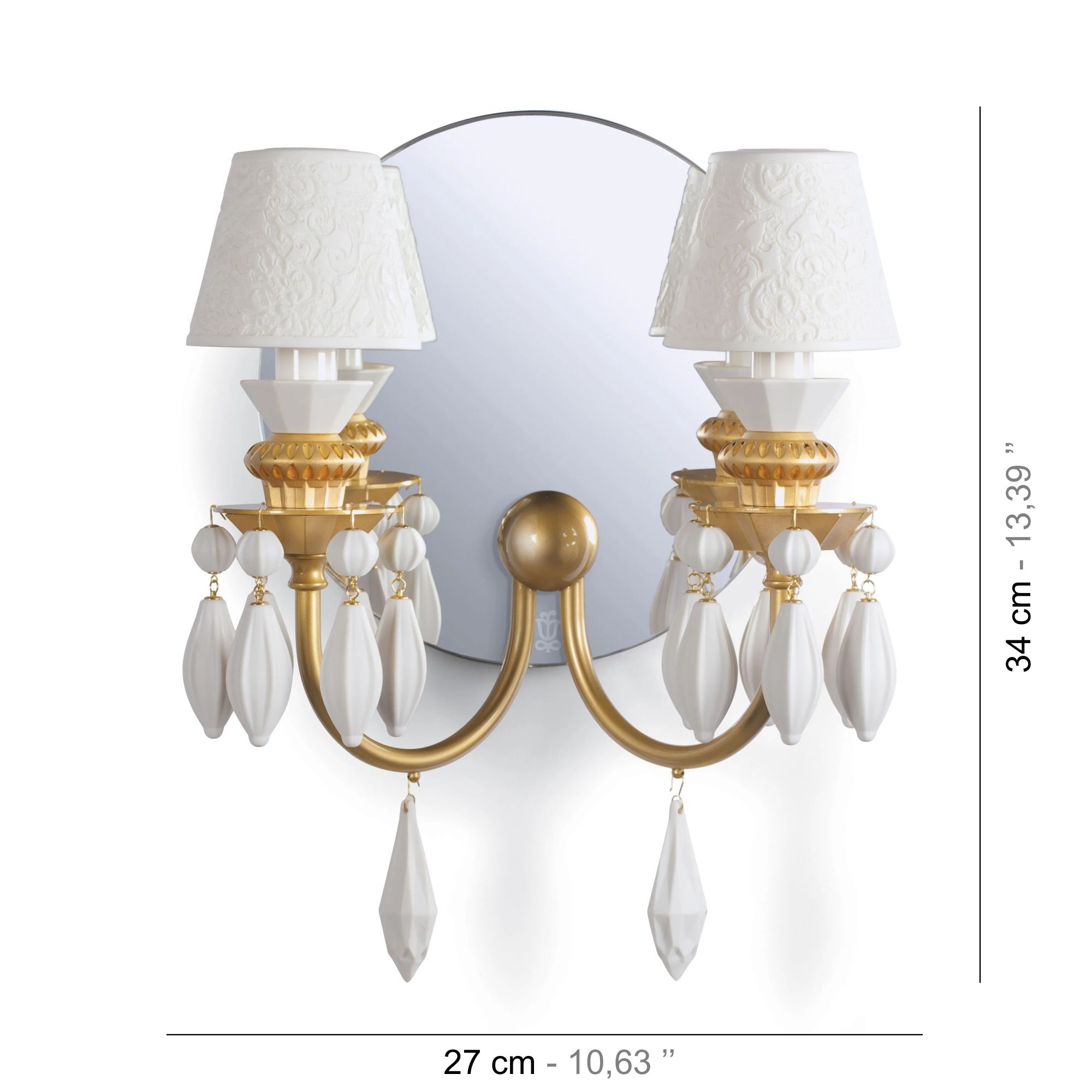 Belle de Nuit 2-lights porcelain wall lamp. Belle de Nuit is a piece of furniture with a timeless charm. Its traditional, refined and elegant design fits perfectly in both classic and contemporary contexts. A wonderful point of light that gives depth to the rooms, creating a warm and welcoming atmosphere: Belle de Nuit fascinates even when switched off, furnishing with elegance. The lamp is offered in green, black, blue, pink, gold, silver, multicolor and white. Made by Lladró
