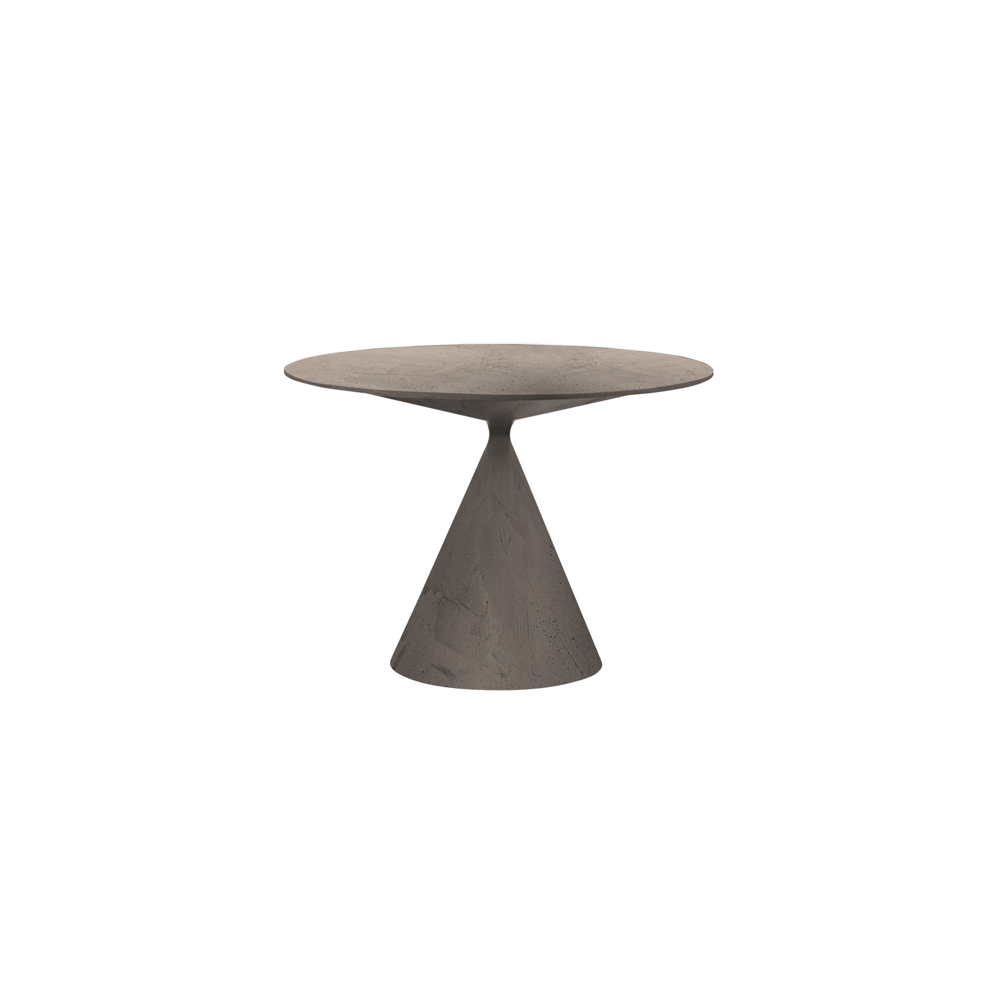 Clay table with a 120 cm diameter. With an overwhelmingly beautiful silhouette, Clay is the perfect synthesis of technical boldness and invites the viewer to appreciate the perfection of its conical and full shapes, seemingly in mid-air but harmoniously juxtaposed reaching a stable balance and creating an intriguing and compelling visual tension. Clay is available in its indoor and outdoor versions with polyurethane base and MDF top. Designed by Marc Krusin