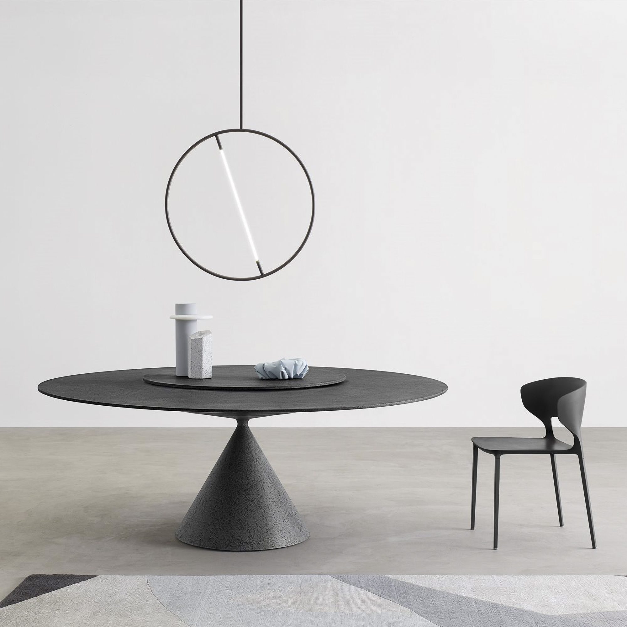 Clay table with a 120 cm diameter. With an overwhelmingly beautiful silhouette, Clay is the perfect synthesis of technical boldness and invites the viewer to appreciate the perfection of its conical and full shapes, seemingly in mid-air but harmoniously juxtaposed reaching a stable balance and creating an intriguing and compelling visual tension. Clay is available in its indoor and outdoor versions with polyurethane base and MDF top. Designed by Marc Krusin