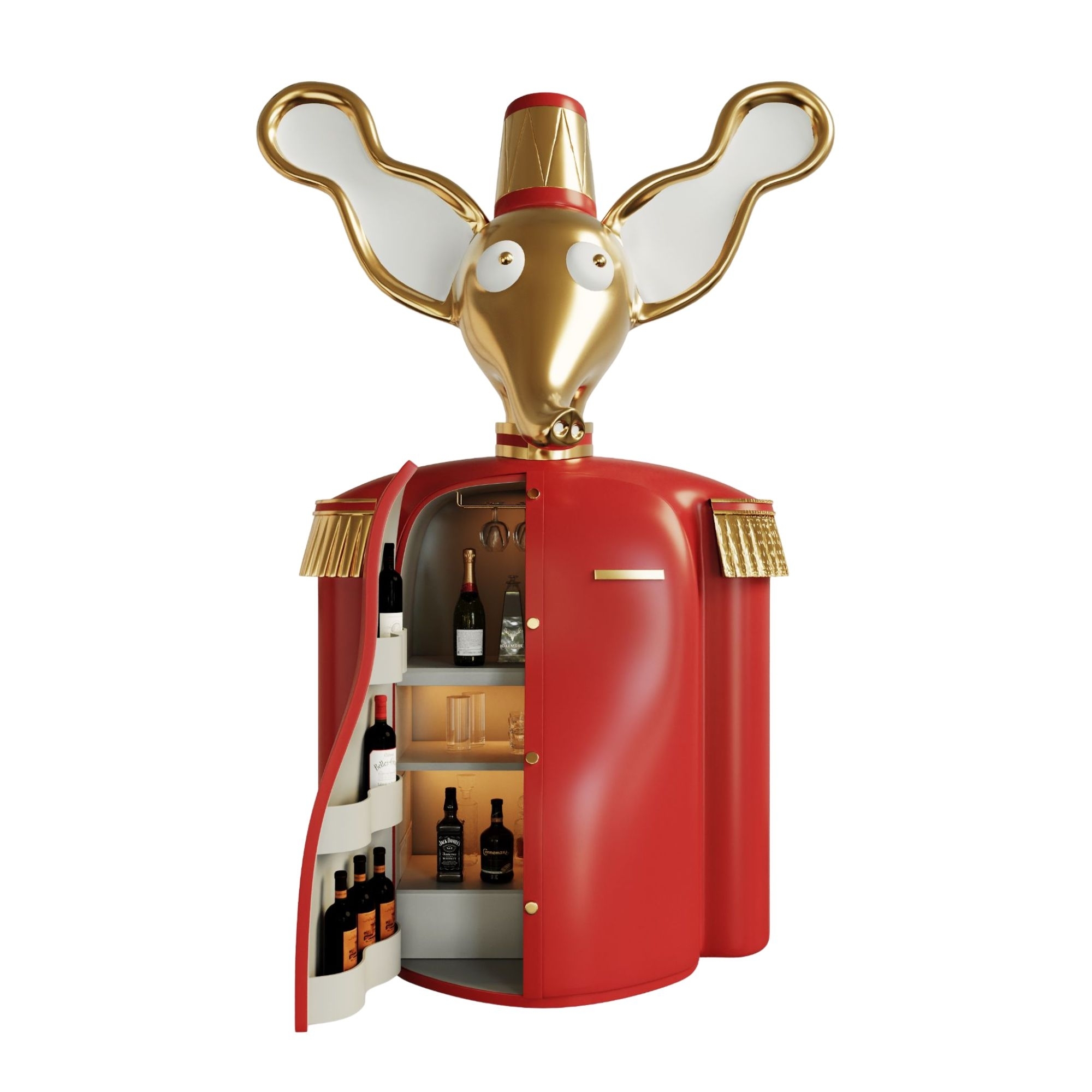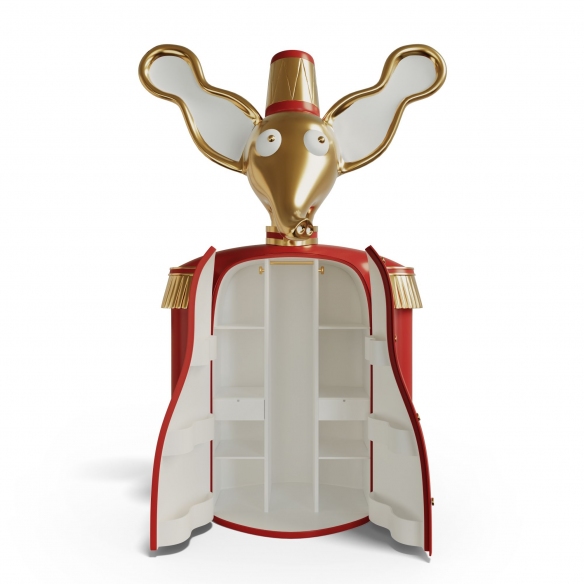 Monsieur Elie Rouge cabinet 238 cm high. Elie is a gentleman wearing a smart jacket. He has a kind face and a warm smile. He always has a kind word for everyone he comes across. He is also a cabinet imbued with magical properties, a sculptural presence. He has a whimsical and otherworldly feel to them and can be used to add an extra dash of charm to any space! Designed by Matteo Cibic