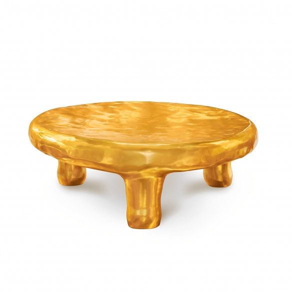 Delight coffee table 38 cm high. Showy and beyond the ordinary, this coffee table is something magnificent, eye-catching and overwhelmingly beautiful. It is an emphasis on luxurious beauty and extravagance, excesses and lack of restraint with a warm gold color and an uneven surface, not easily defined, a blob-like or cloudy in appearance. Fool's Gold is a hymn to modernity. Made by Scarlet Splendour