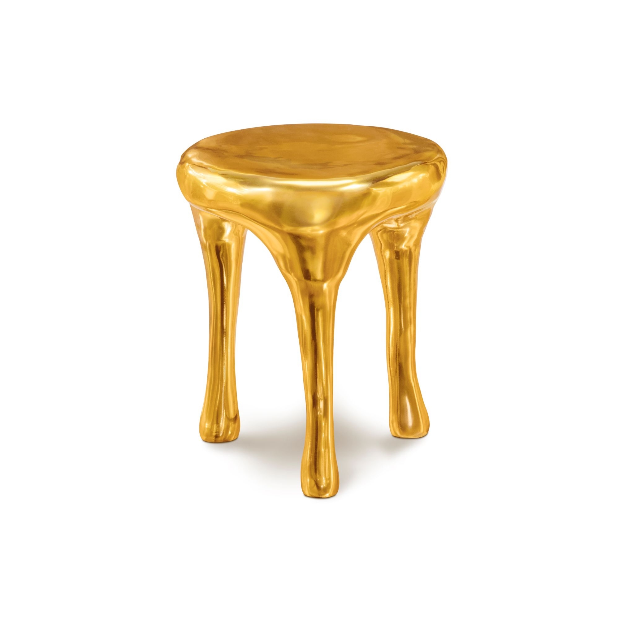 Glee side table 45.5 cm high. Showy and beyond the ordinary, this side table is something magnificent, eye-catching and overwhelmingly beautiful. It is an emphasis on luxurious beauty and extravagance, excesses and lack of restraint with a warm gold color and an uneven surface, not easily defined, a blob-like or cloudy in appearance. Fool's Gold is a hymn to modernity. Made by Scarlet Splendour