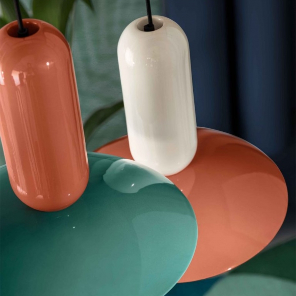 Pau suspension lamp, 36 cm high. Simple and elegant, with clean lines and classic colours, Pau is a timeless lamp that never goes out of fashion. Its lighting body is made of glossy ceramic with a variety of shades and styles. It is beautiful and durable, and the result of combining and superimposing geometric shapes to create a new form capable of lighting up any space with its flawless elegance. Made by Ferroluce