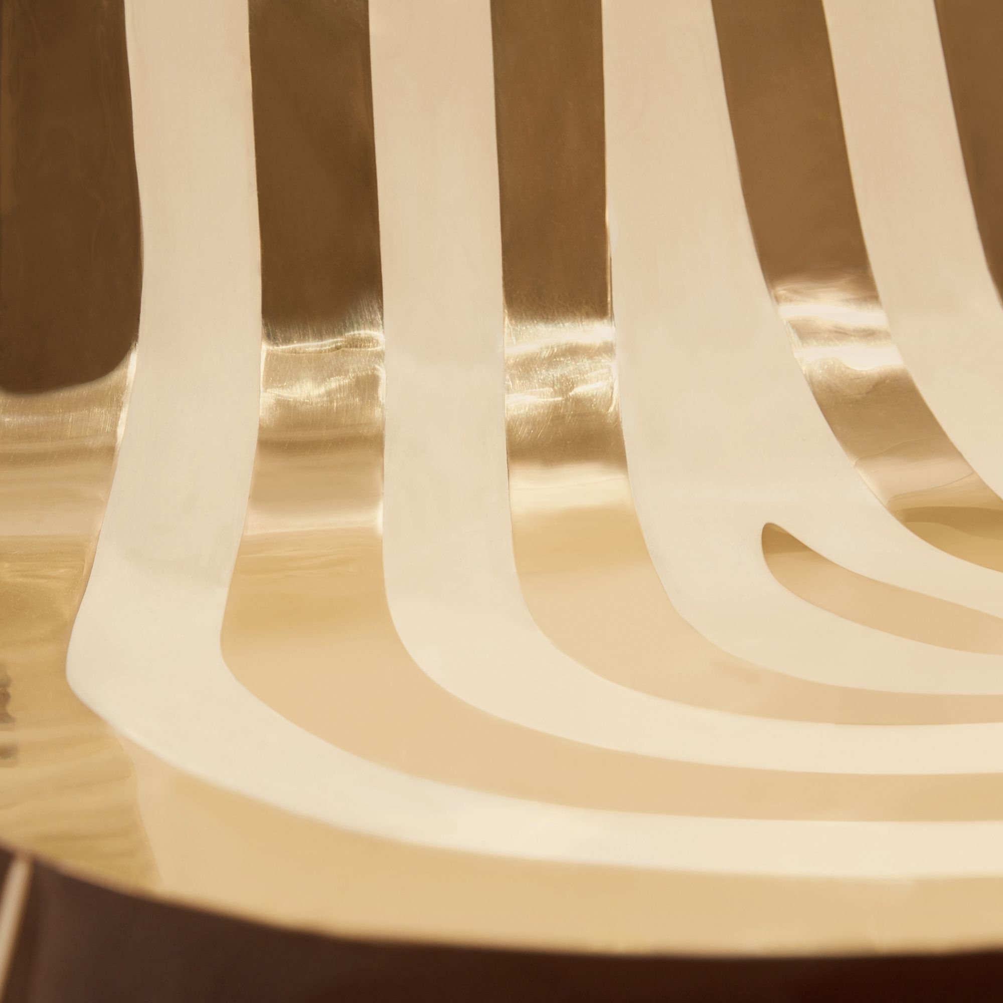 Forest chair, 115 cm long. A fun and engaging design, Forest chair draws inspiration from naturalistic shapes to create a sense of organicity and enchanting beauty. It's made of fine materials like brass, with stylized leaves carved on top, and meant to blend into its surroundings. Forest is comfortable and sturdy, and warmly welcomes body's physiognomy to enjoy the natural scenery! Designed by Marcantonio