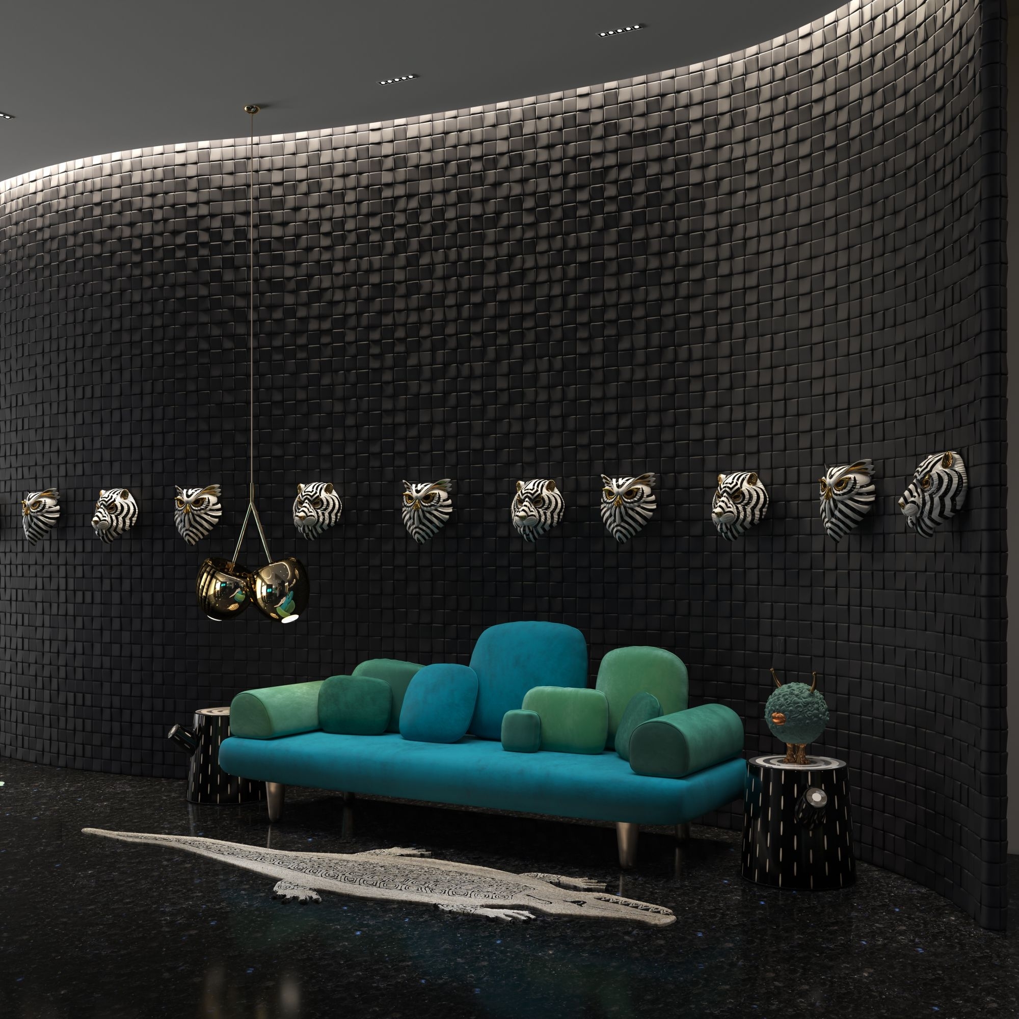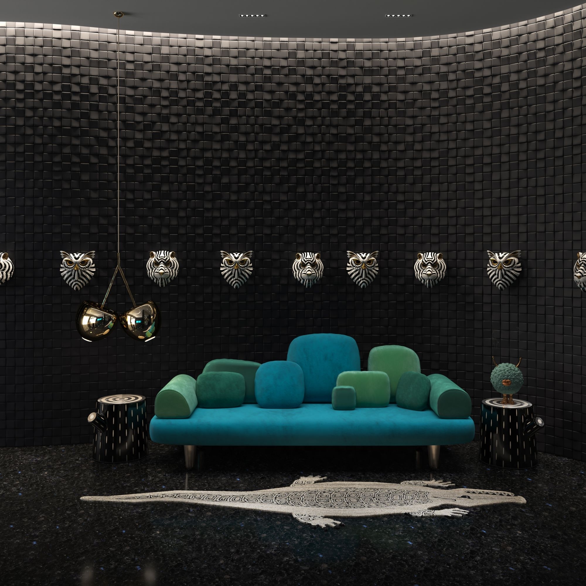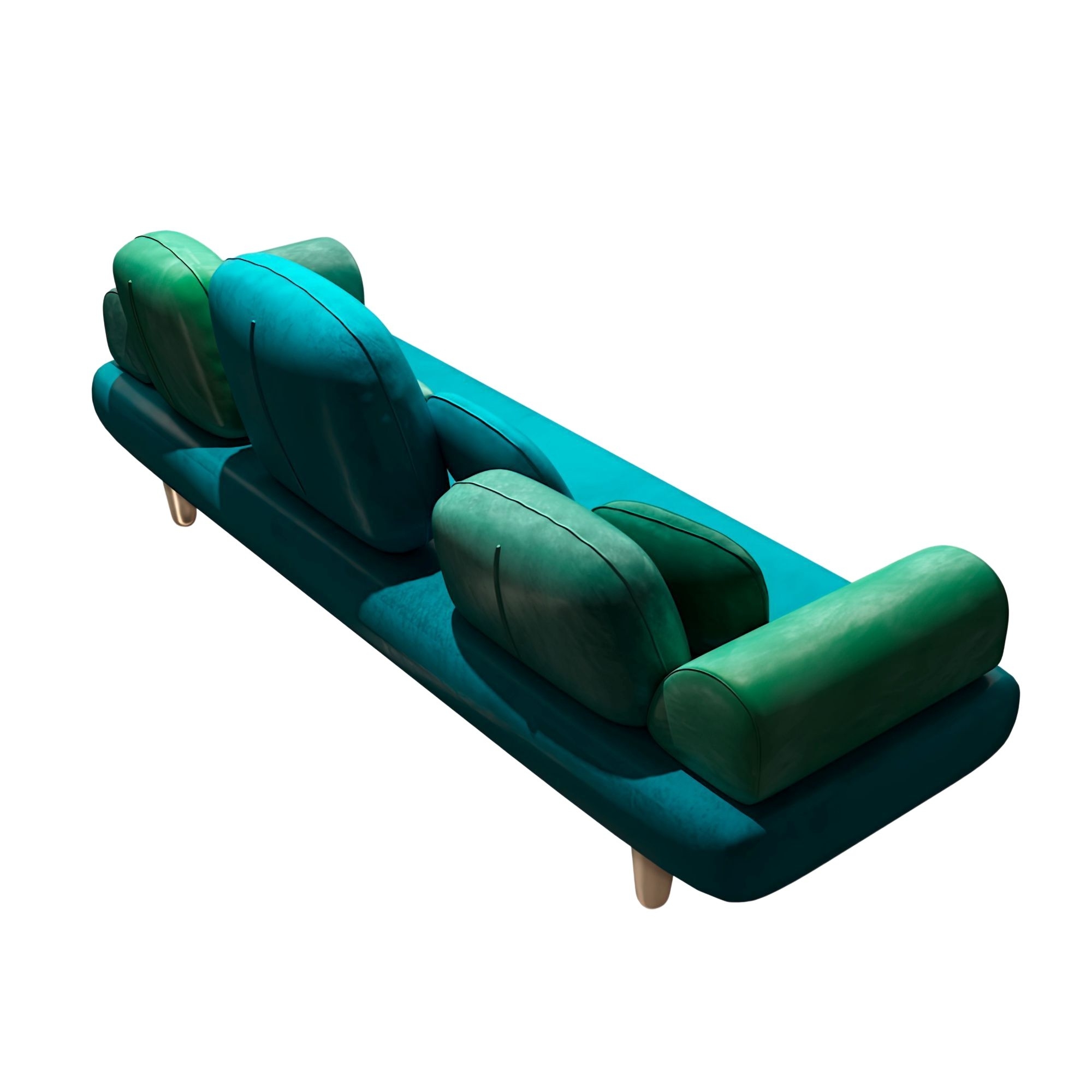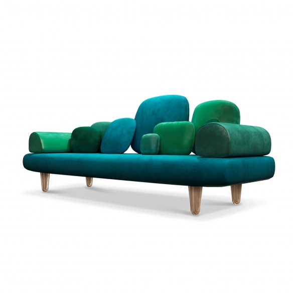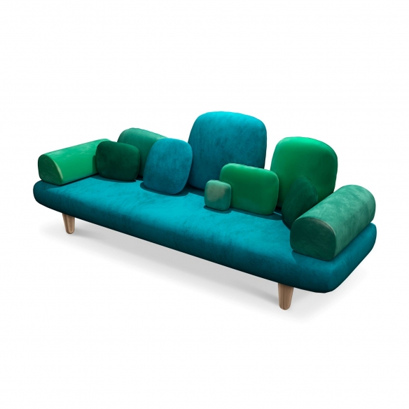 Forest sofa, 250 cm long. This charming 3 seater sofa has a luxurious green velvet upholstery and elegant golden feet. Curved armrests and a deep seat make it perfect for sinking into, while the classic design keeps it stylish. Geometric cushions add an extra touch of style. It would make the perfect addition to any living room, providing a comfortable seating and all the glamor you need! Designed by Marcantonio