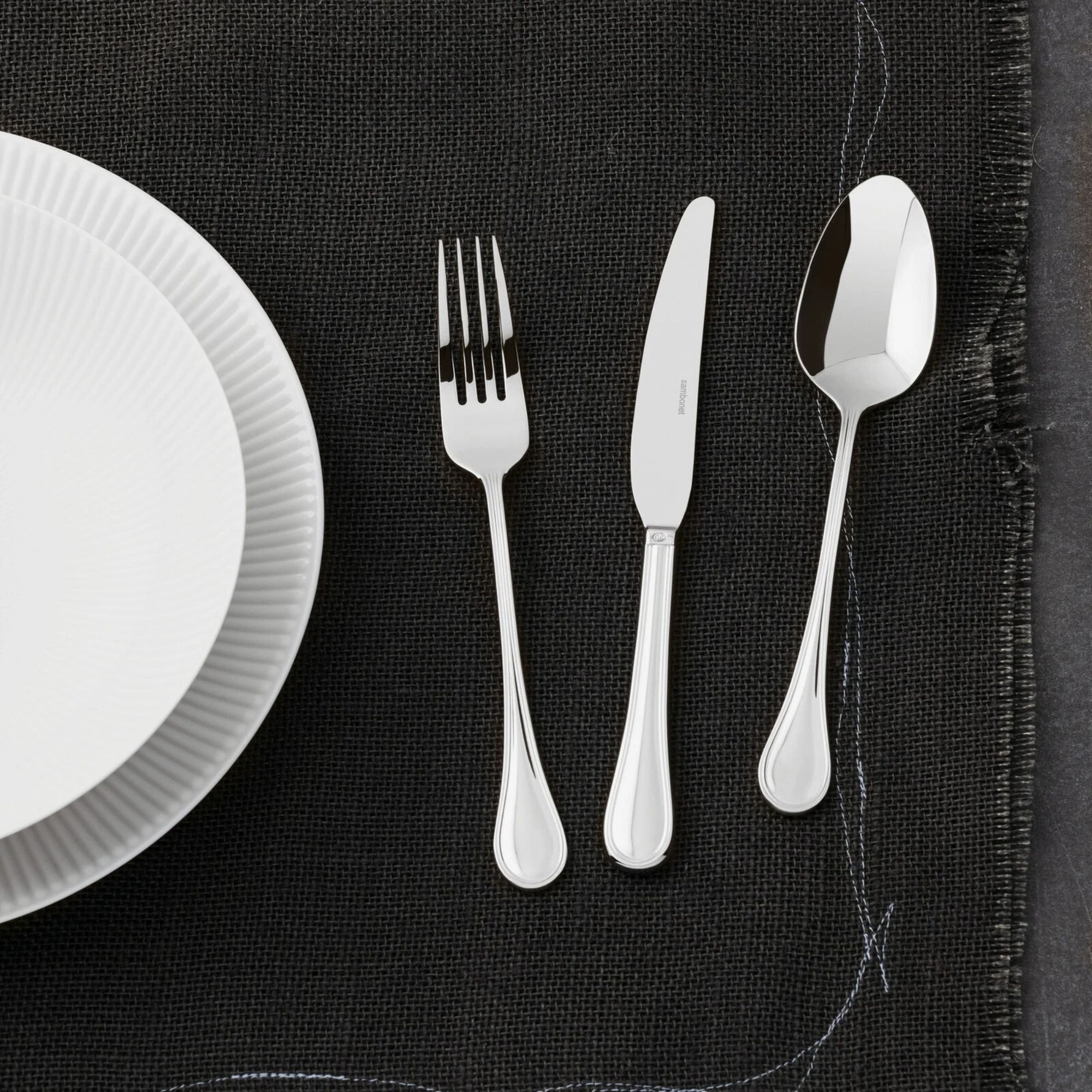 Characterized by a one-piece handle, Royal cutlery has a beautiful and functional design, making it resistant and easy to handle. Sambonet hallmark on each piece highlights its elegance, making it perfect for stylish mise en plase. Royal cutlery is also dishwasher safe. Made by Sambonet.