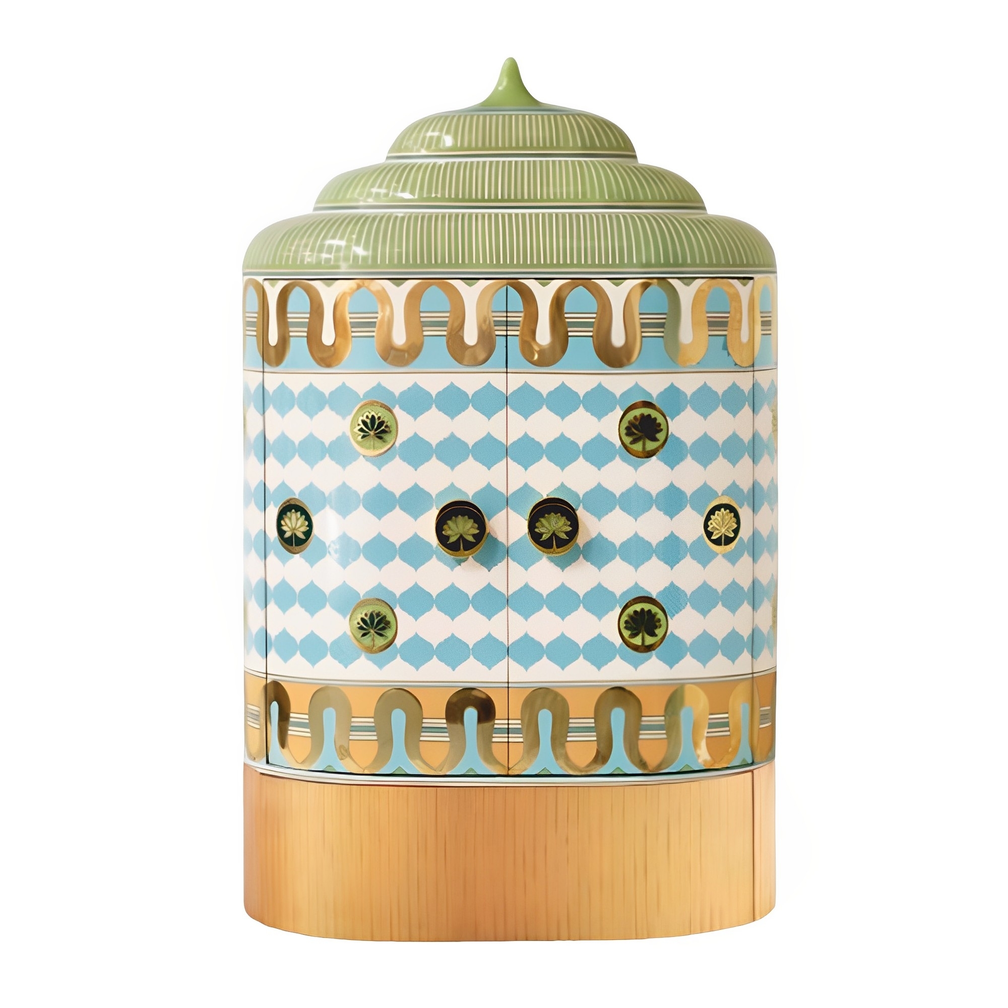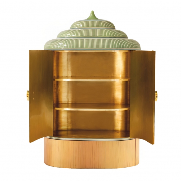 Lotus Sanctum Jade cabinet 141.5 cm high. Sculptural three-dimensional shapes, a detailing done with cleverness, experience and skill, Lotus Sanctum Jade cabinet prefers not to conform to a pre-established norm. It is a combination of contemporaneity and tradition that makes the most of brass and dressed in colorful and eye-catching shades. Mandala is an unusual way to open up to new and luxurious furnishing experiences. Designed by Matteo Cibic