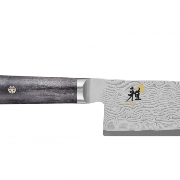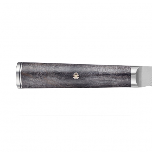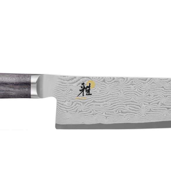 Damascus steel Gyutoh knife, from the 5000 MCD 67 line. The Gyutoh is an essential accessory in the kitchen both for those who love to dabble in the preparation of delicious dishes and for the more expert. It has a 24cm blade, which is resistant to rust and corrosion, and an elegant black ash wood handle which provides a comfortable and secure grip. Made by Miyabi