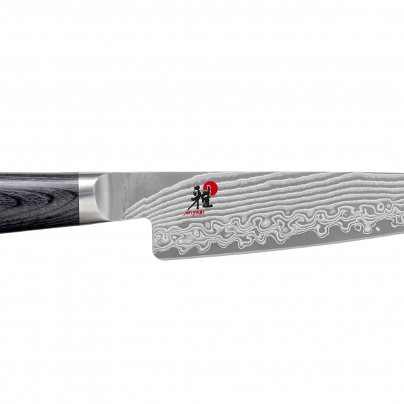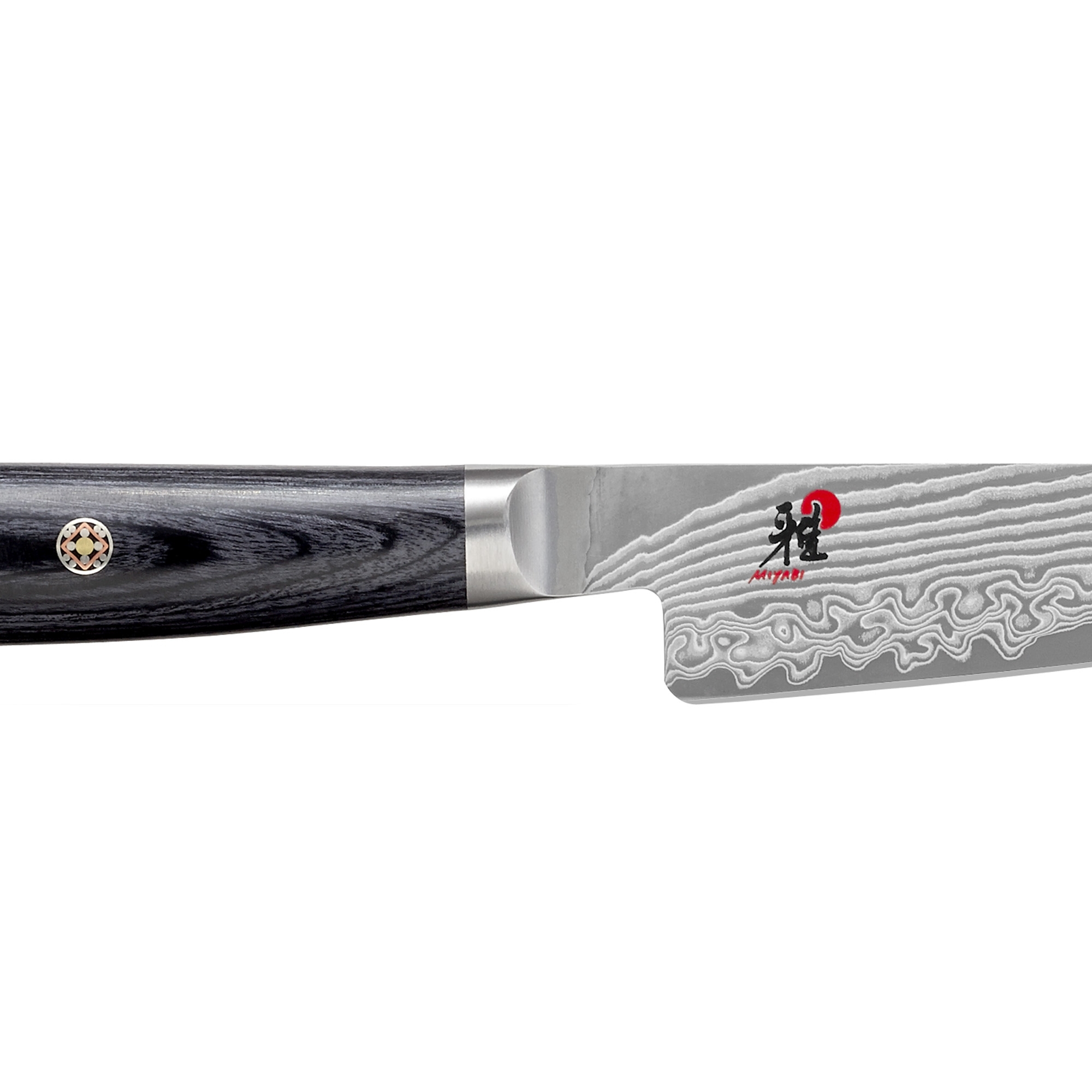 Shotoh knife made in FC61 carbide steel, from 5000 FCD line. It is an accessory designed for a high-end kitchen. It has a sharp, slim 13cm blade that is rust and corrosion resistant and an elegant black pakkawood handle with scarlet detailing that offers a comfortable and safe grip. It's truly versatile and that's what can make the difference. Made by Miyabi