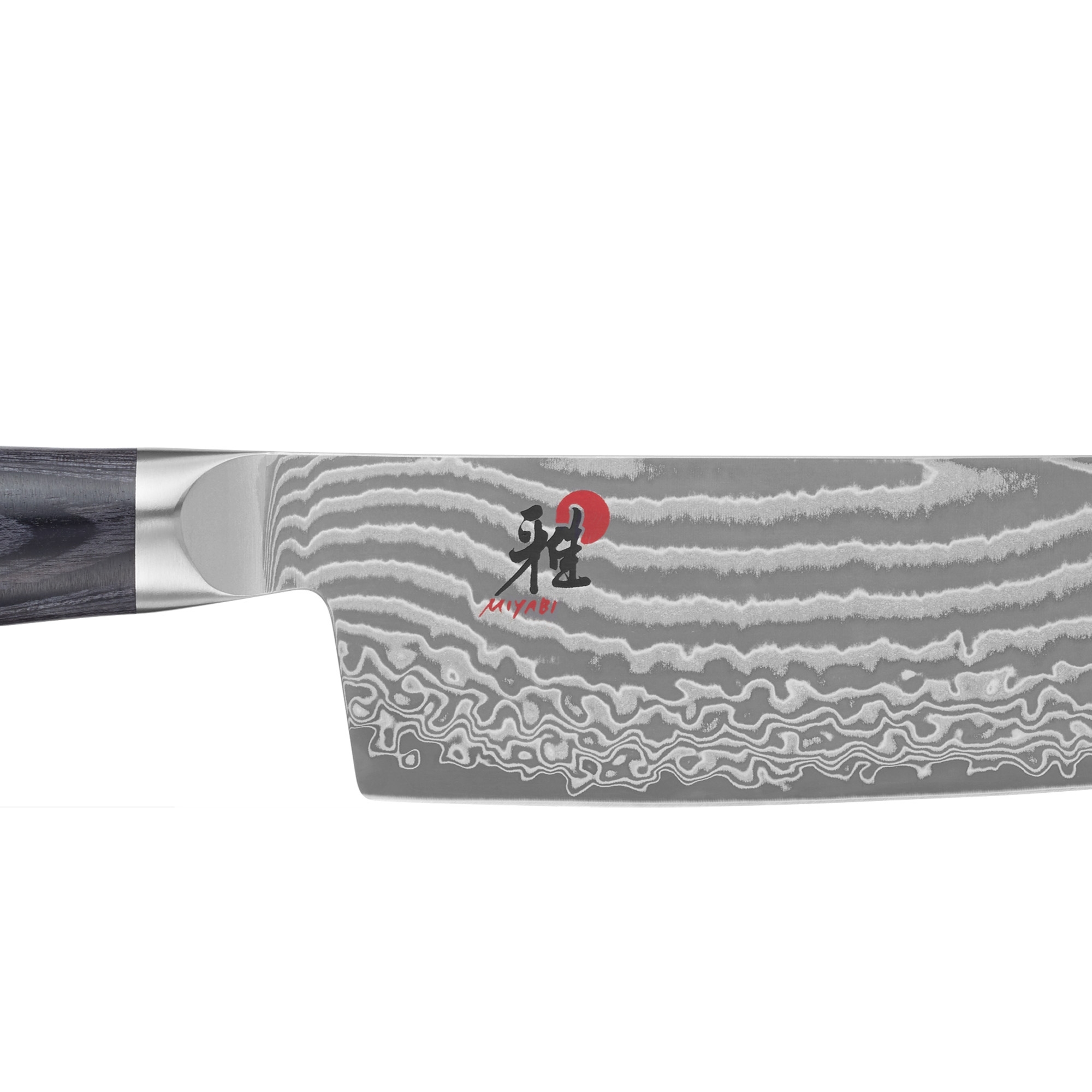 Nakiri knife made in FC61 carbide steel, from 5000 FCD line. Nakiri is an accessory designed for a high level kitchen. It has a heavy 17cm blade that is rust and corrosion resistant and an elegant black pakkawood handle with scarlet detailing that offers a comfortable and safe grip. It's truly versatile and that's what can make the difference. Made by Miyabi