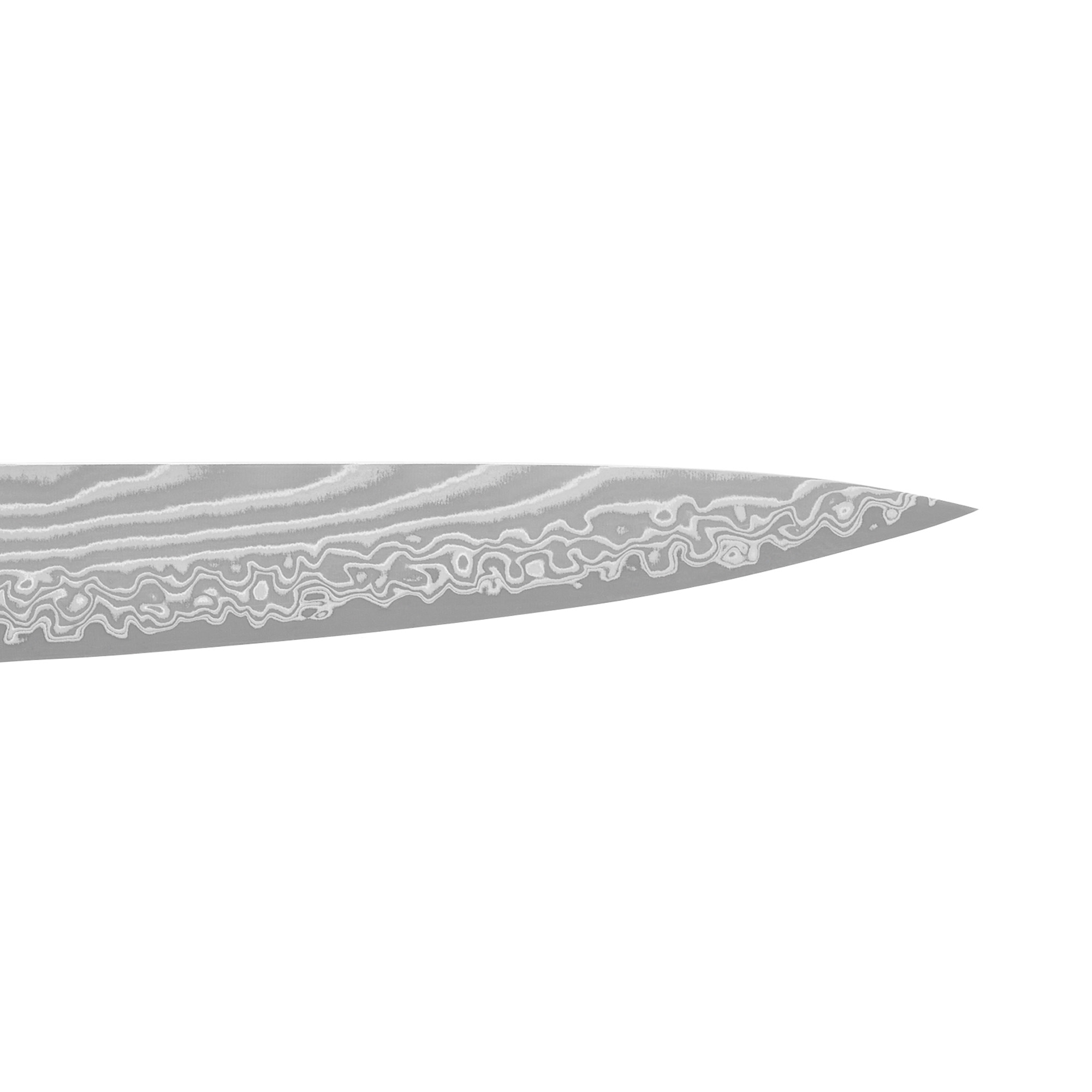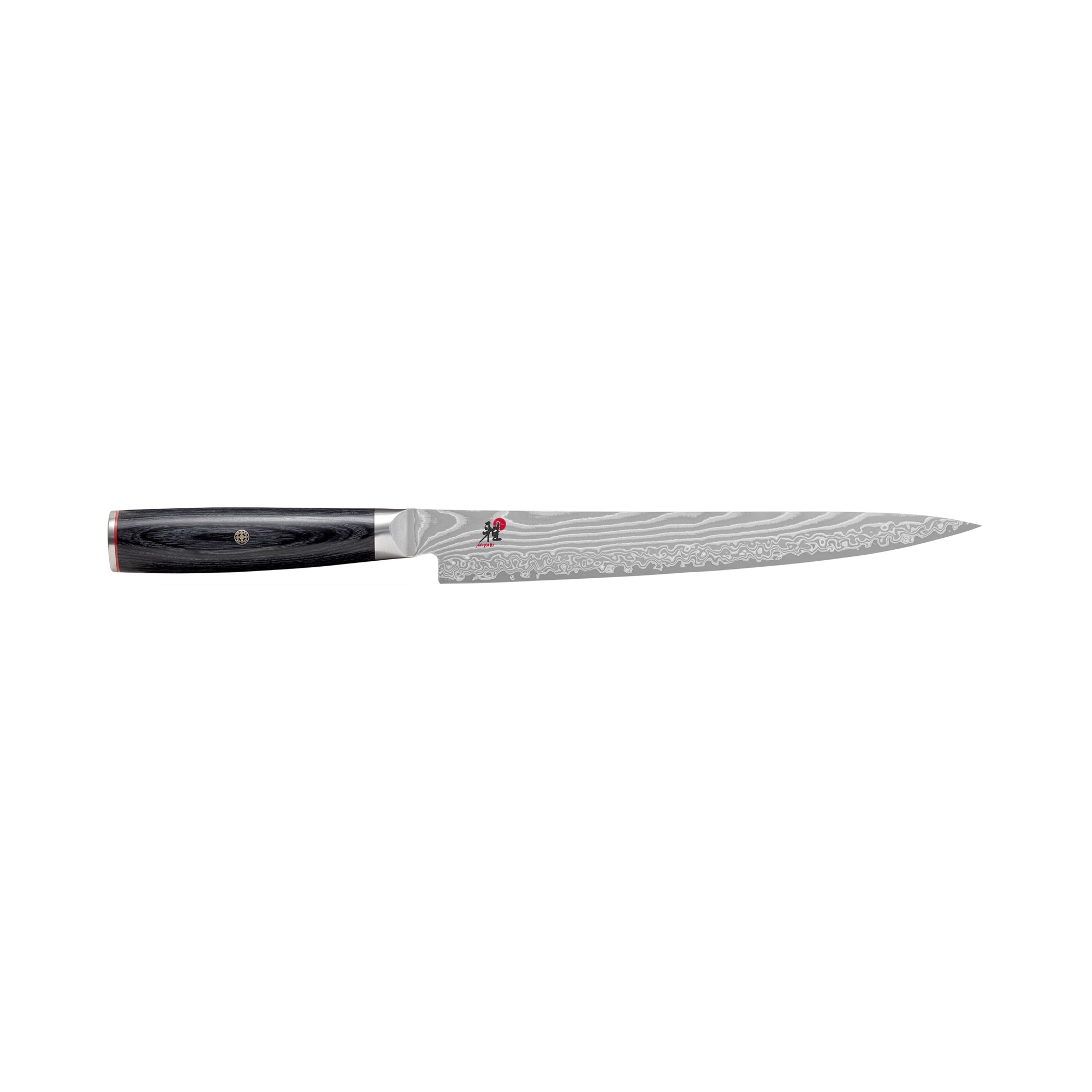 Suijihiki knife made in FC61 carbide steel, from 5000 FCD line. It has a long 24 cm smooth and sharp blade that is rust and corrosion resistant and an elegant black pakka wood handle with scarlet detailing that ensures a comfortable and safe grip. Its very thin edge is what differentiates it from other cutting tools and makes it particularly suitable for more complex tasks where precision is needed, gliding easily through meat or fish. The knife offers outstanding efficinecy for a flawless cut. Made by Miyabi
