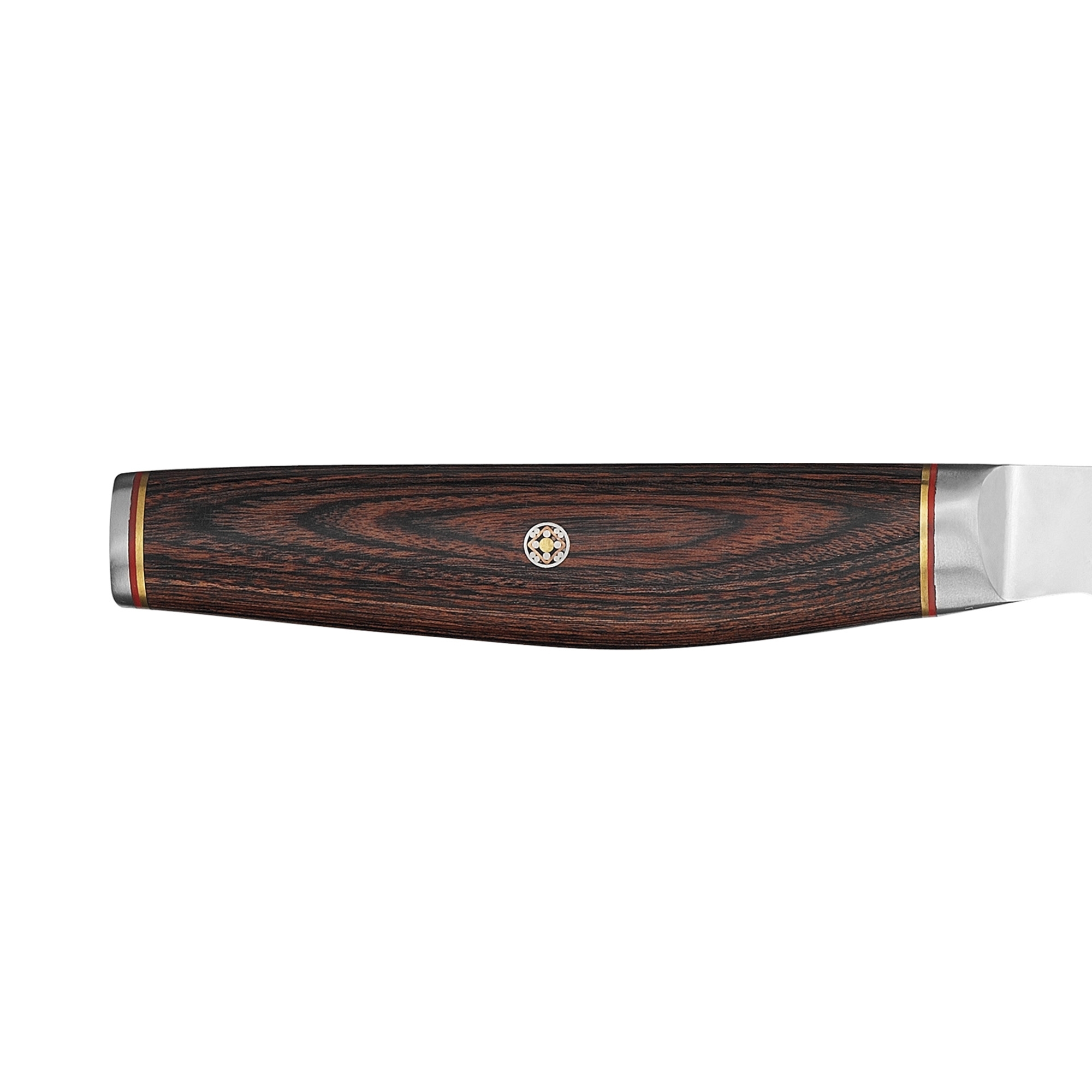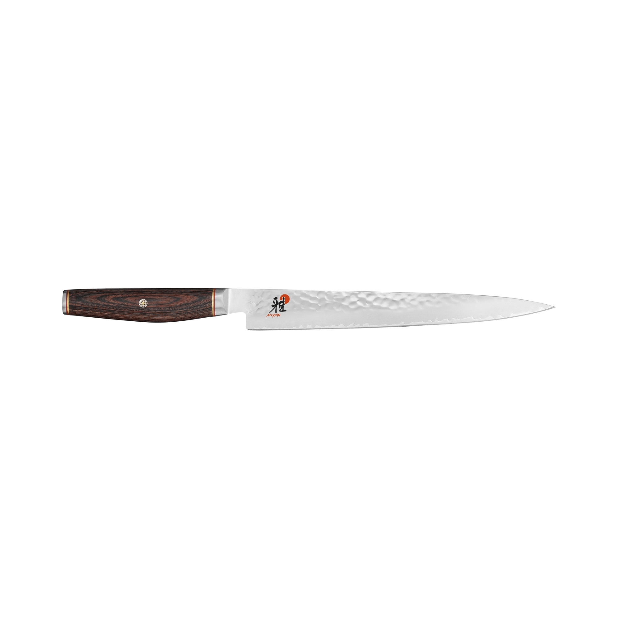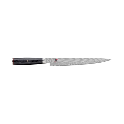 Suijihiki knife made in MC63 Micro Carbide steel, from 6000 MCT line. It has a long, smooth and sharp 24 cm blade that is resistant to rust and corrosion, and an elegant Cocobolo wood handle that offers a comfortable and safe grip. Its very thin edge is what differentiates it from other cutting tools and makes it particularly suitable for more complex tasks in which precision is needed, gliding easily through meat or fish. This knife offers maximum efficiency for a flawless cut. Made by Miyabi