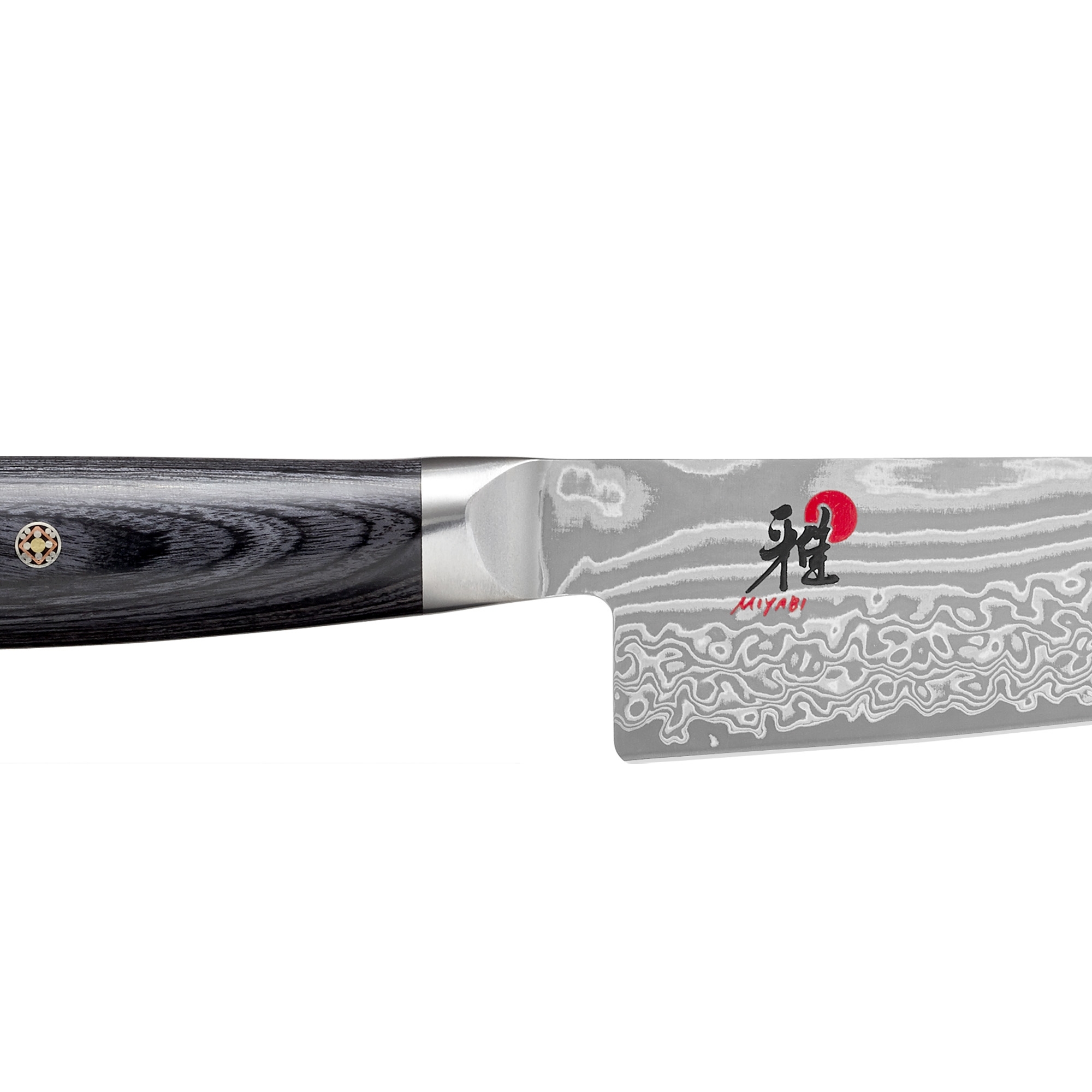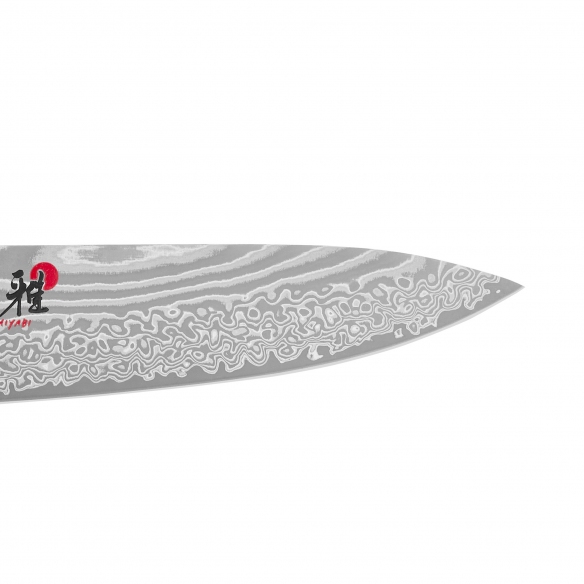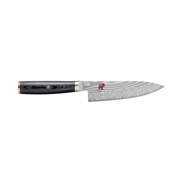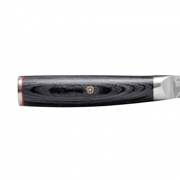Gyutoh knife made in FC61 carbide steel, from 5000 FCD line. Gyutoh is an essential kitchen accessory both for those who love to dabble in the preparation of delicious dishes and for the more experienced. It has a 16 cm blade, which is rust and corrosion resistant, and an elegant black pakka wood handle, with scarlet detailing, which ensures a comfortable and safe grip. Made by Miyabi