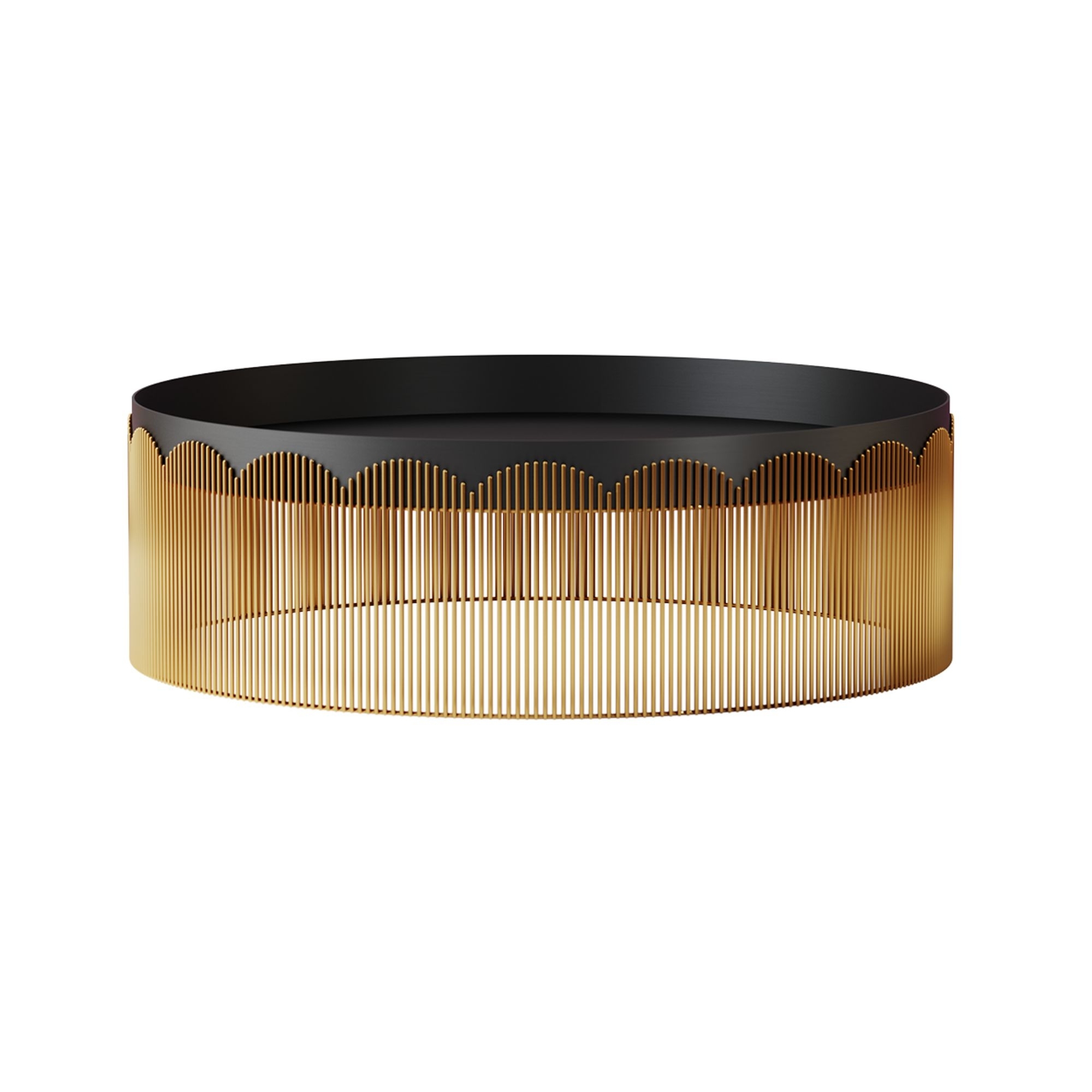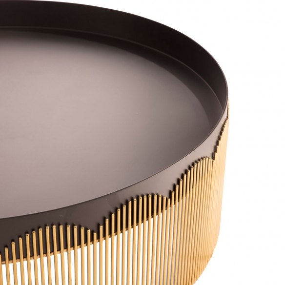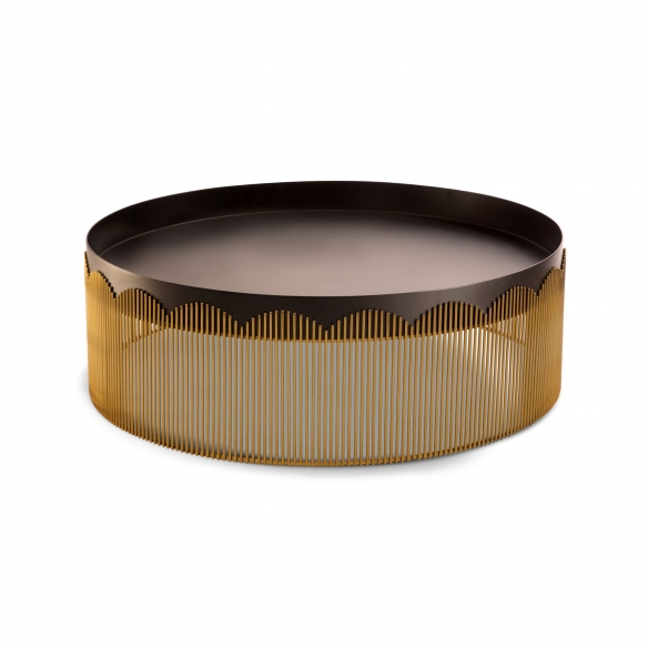 Coffee table from Strings collection, with a 95 cm diameter. A glamorous and undeniably modern soul, this gorgeous furnishing accessory stands out for its shadowy tones, adorned with a golden metal border that suggests the beauty of lace, giving visual interest, a luxurious chromatic contrast, and a dose of femininity that cannot be missing in every space of yours. Designed by Nika Zupanc for Scarlet Splendor