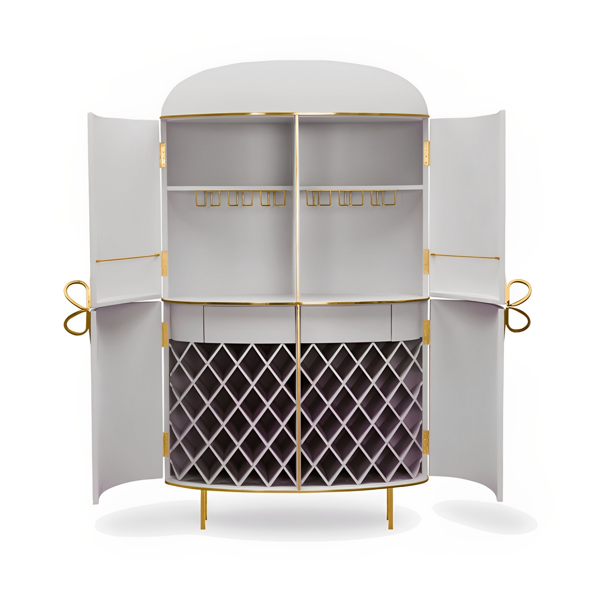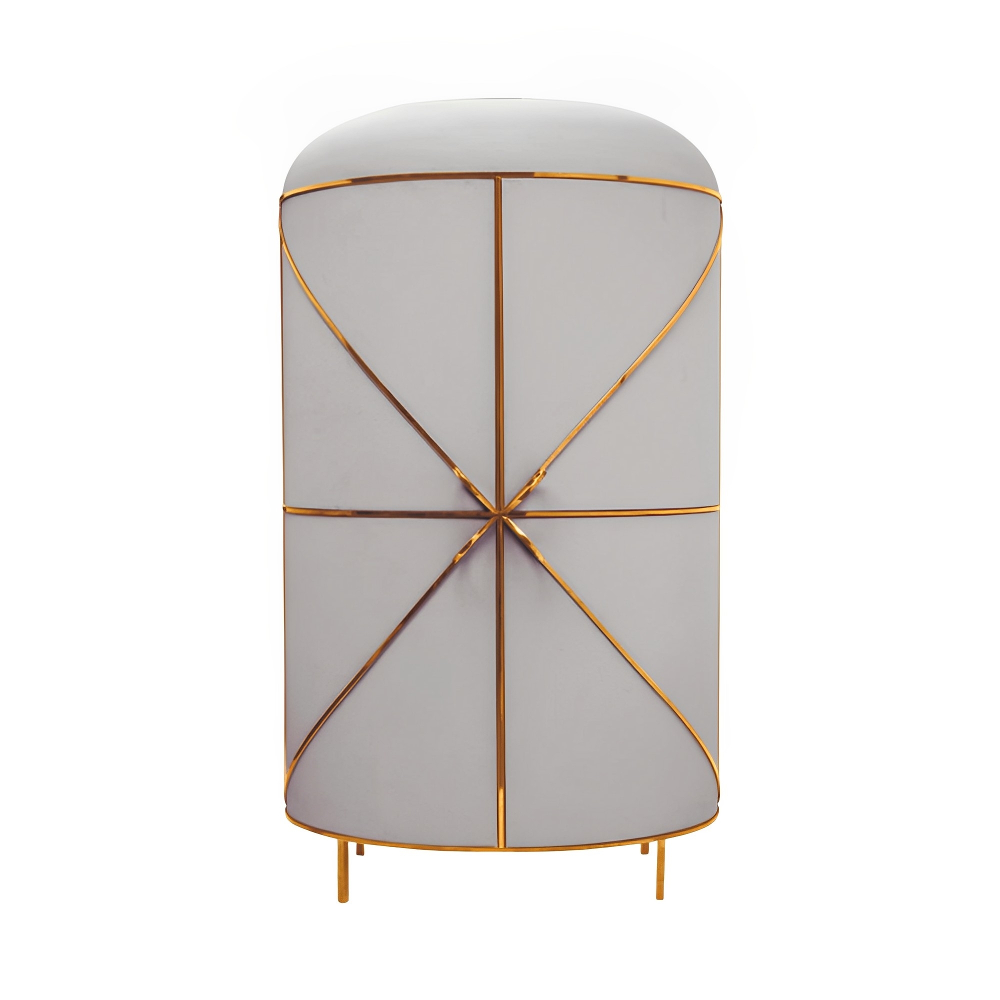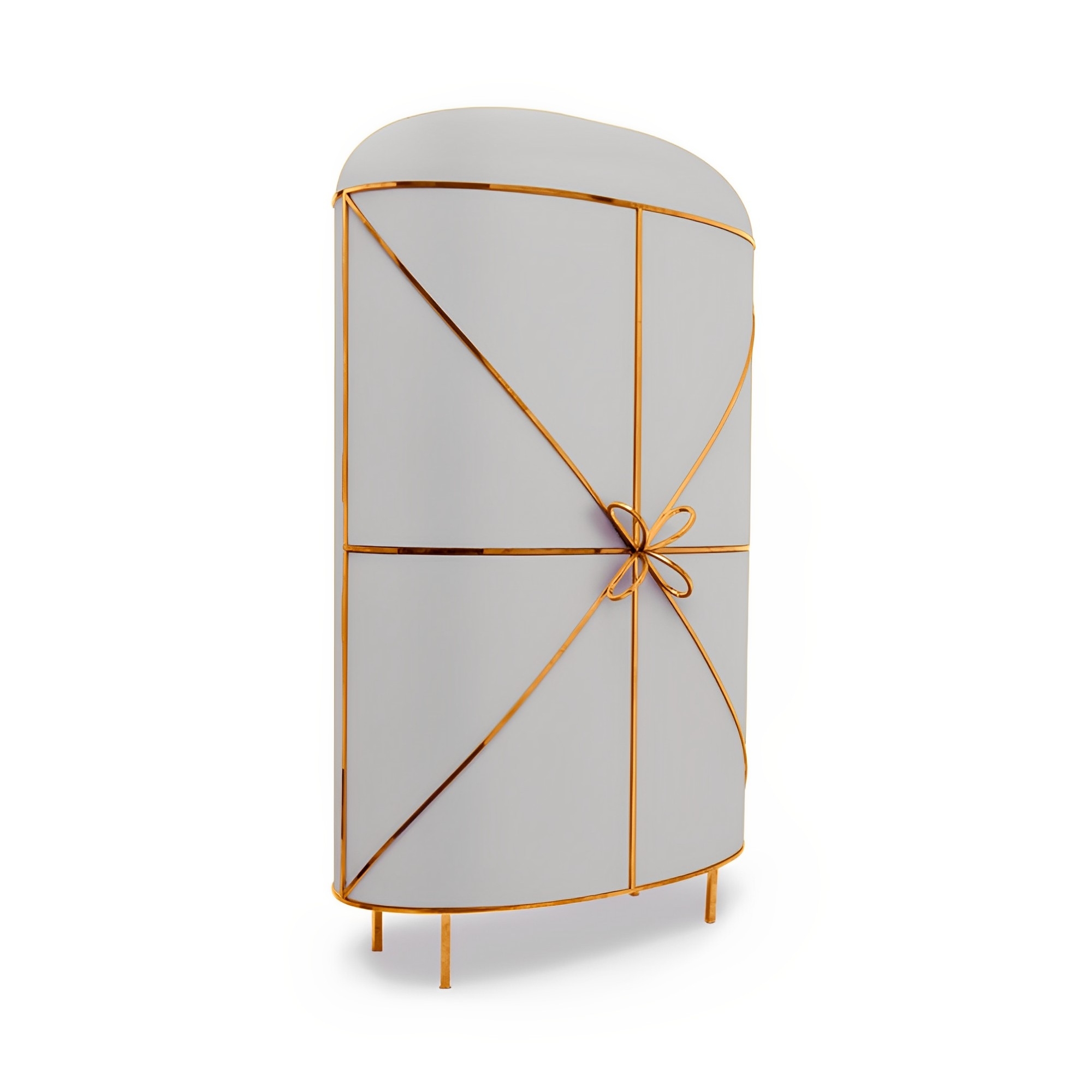 MDF cabinet from 88 Secrets collection, 190 cm high. A captivating design combined with luxurious glamor, this furnishing accessory has been created to instill elegance, with gorgeous metallic finishes that complements its sophisticated and eye-cathing shapes, underlining its beauty. It has slim legs, which add a modern touch, and shelves to give you all the storage space you need. It's a perfect accent to any setting! Designed by Nika Zupanc for Scarlet Splendour