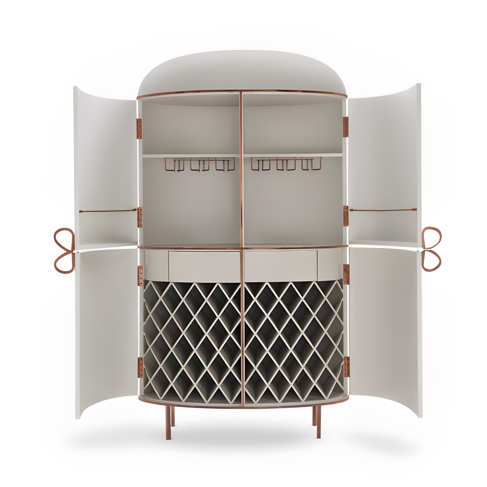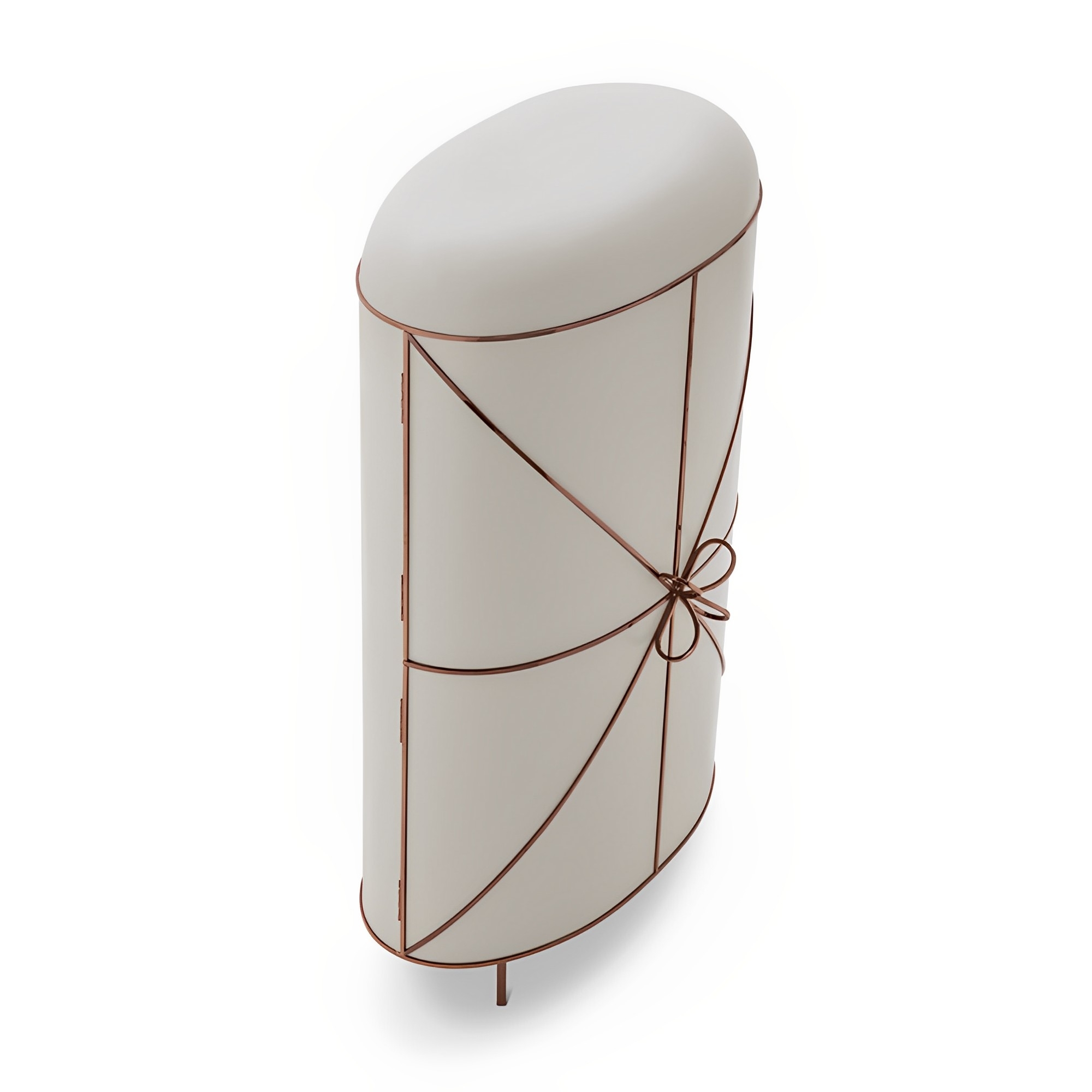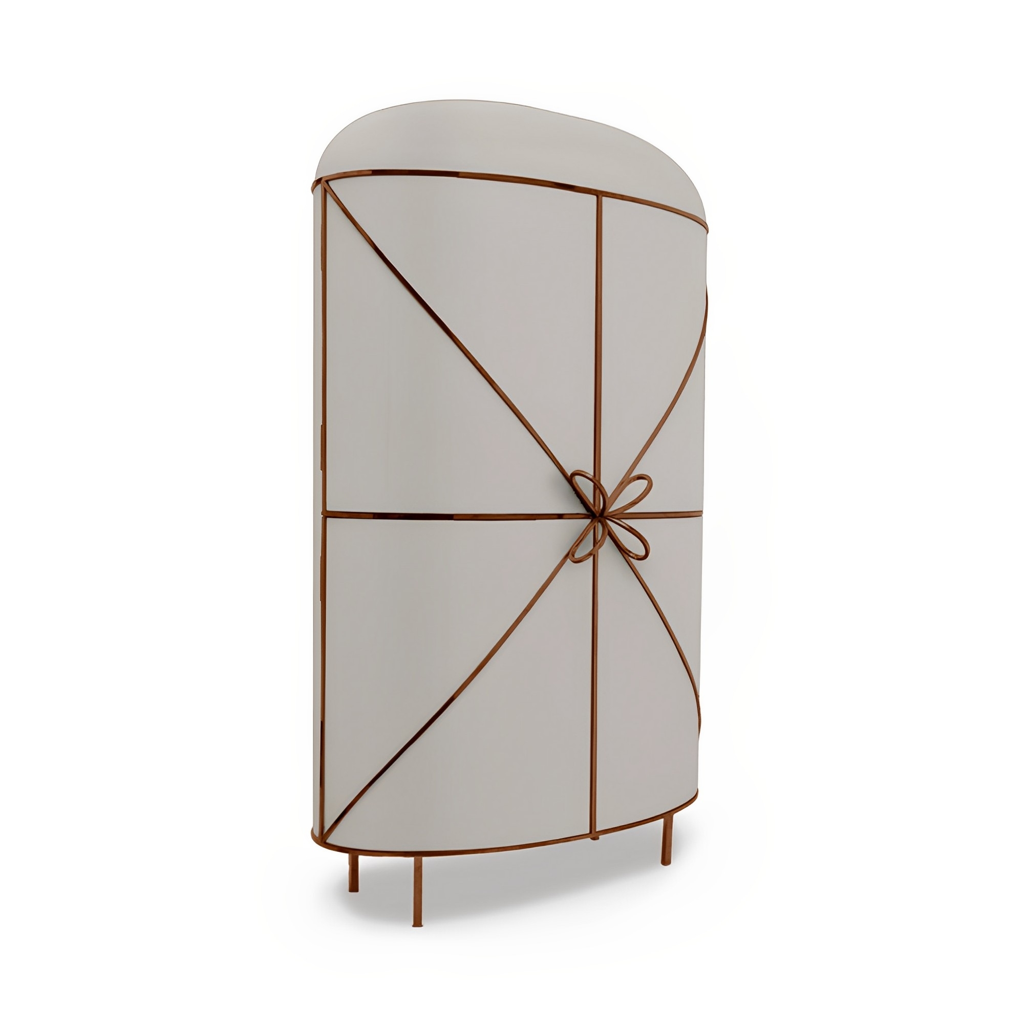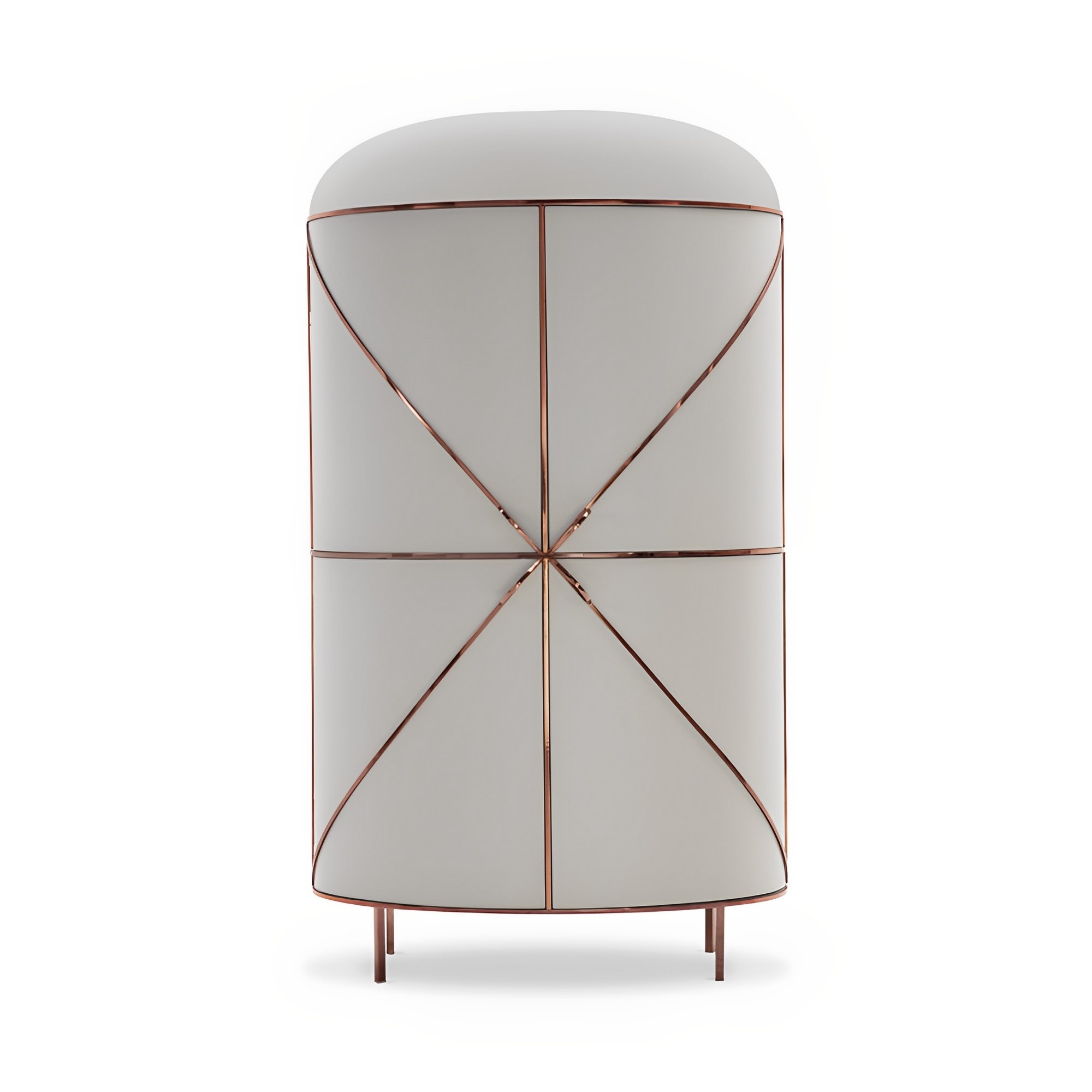 MDF cabinet from 88 Secrets collection, 190 cm high. A captivating design combined with luxurious glamor, this furnishing accessory has been created to instill elegance, with gorgeous metallic finishes that complements its sophisticated and eye-cathing shapes, underlining its beauty. It has slim legs, which add a modern touch, and shelves to give you all the storage space you need. It's a perfect accent to any setting! Designed by Nika Zupanc for Scarlet Splendour