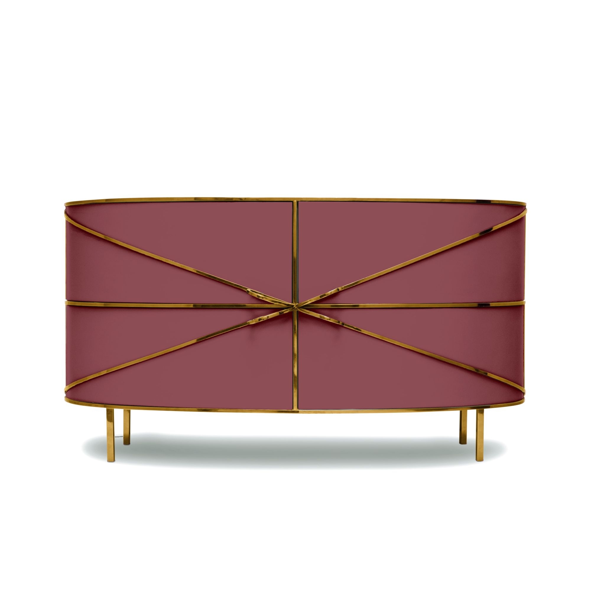 MDF sideboard from 88 Secrets collection, 147 cm long. A captivating design combined with luxurious glamor, this furnishing accessory has been created to instill elegance, with gorgeous metallic finishes that complements its sophisticated and eye-cathing shapes, underlining its beauty. It has slim legs, which add a modern touch, and shelves to give you all the storage space you need. It's a perfect accent to any setting! Designed by Nika Zupanc for Scarlet Splendour